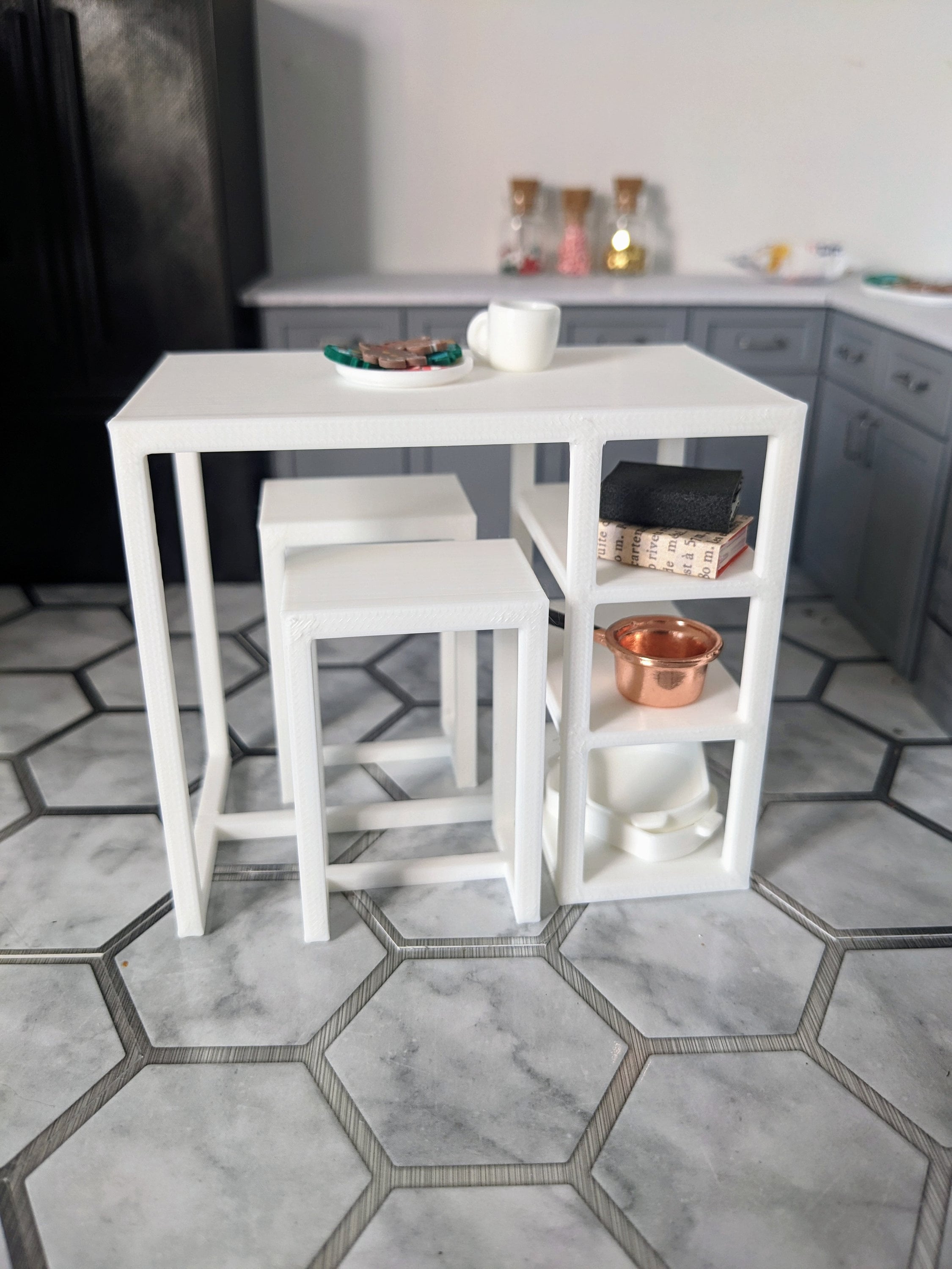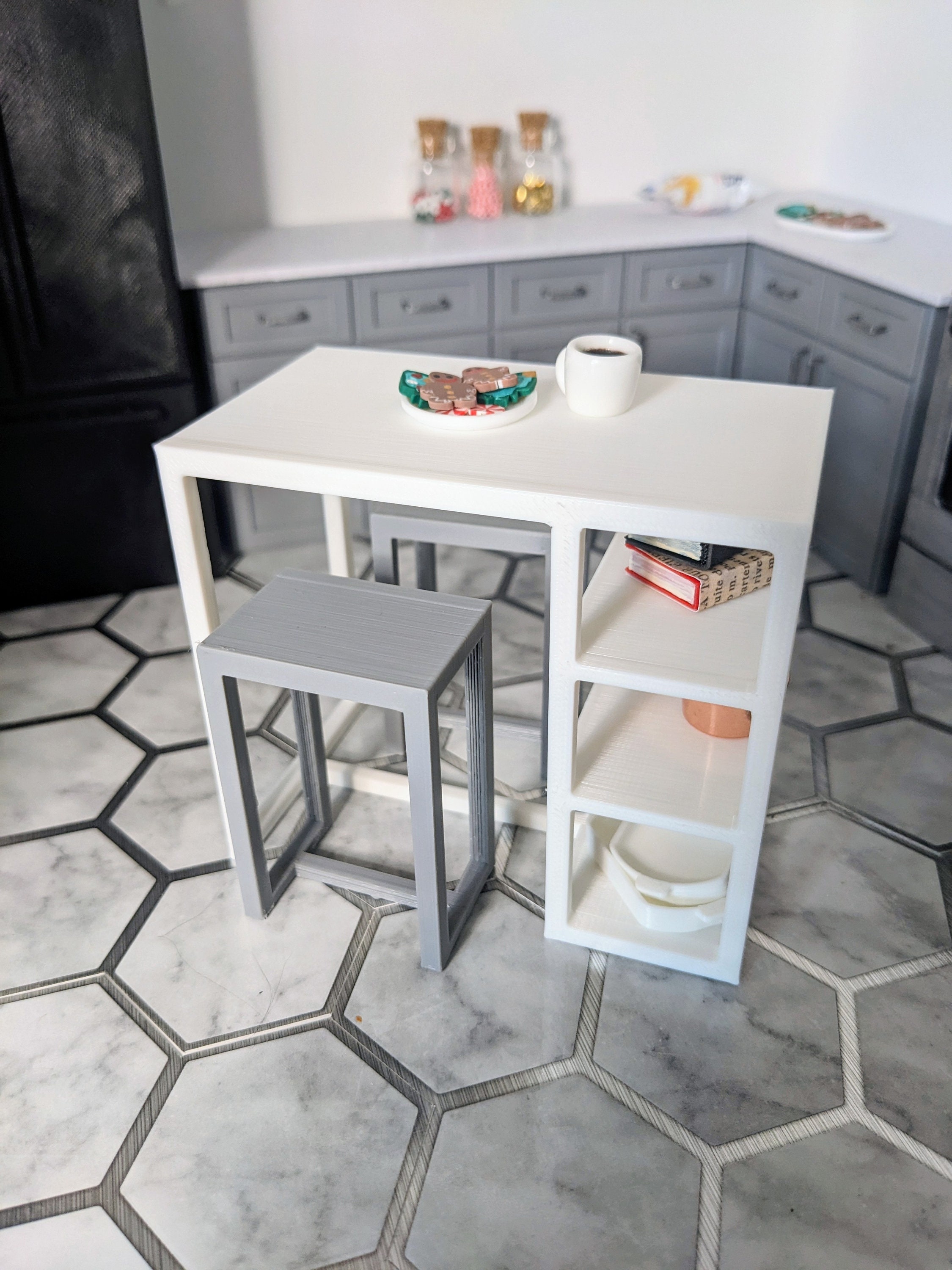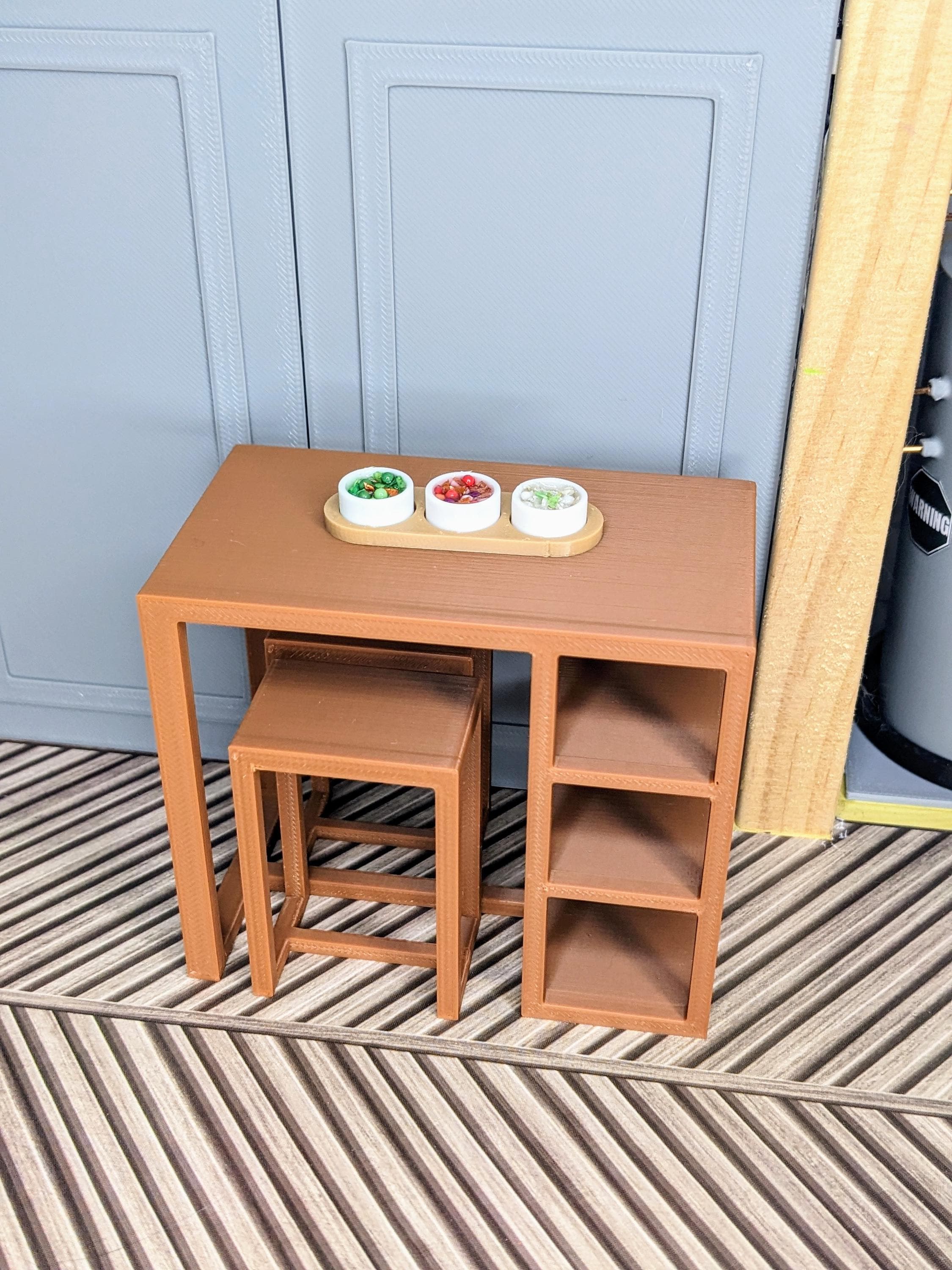 *Original Design!* A 3 piece set of bar height table and chairs in 1:12 scale. You'll receive one table and two chairs. As this is bar height, this could double as a kitchen island. There are three storage shelves underneath for kitchen gadgets or decor. If you have your own seat cushions, you could add them to the chairs for extra flair. You could even add wallpaper liner to the shelves for a pop of color! This set is 3D printed using high quality PLA plastic.