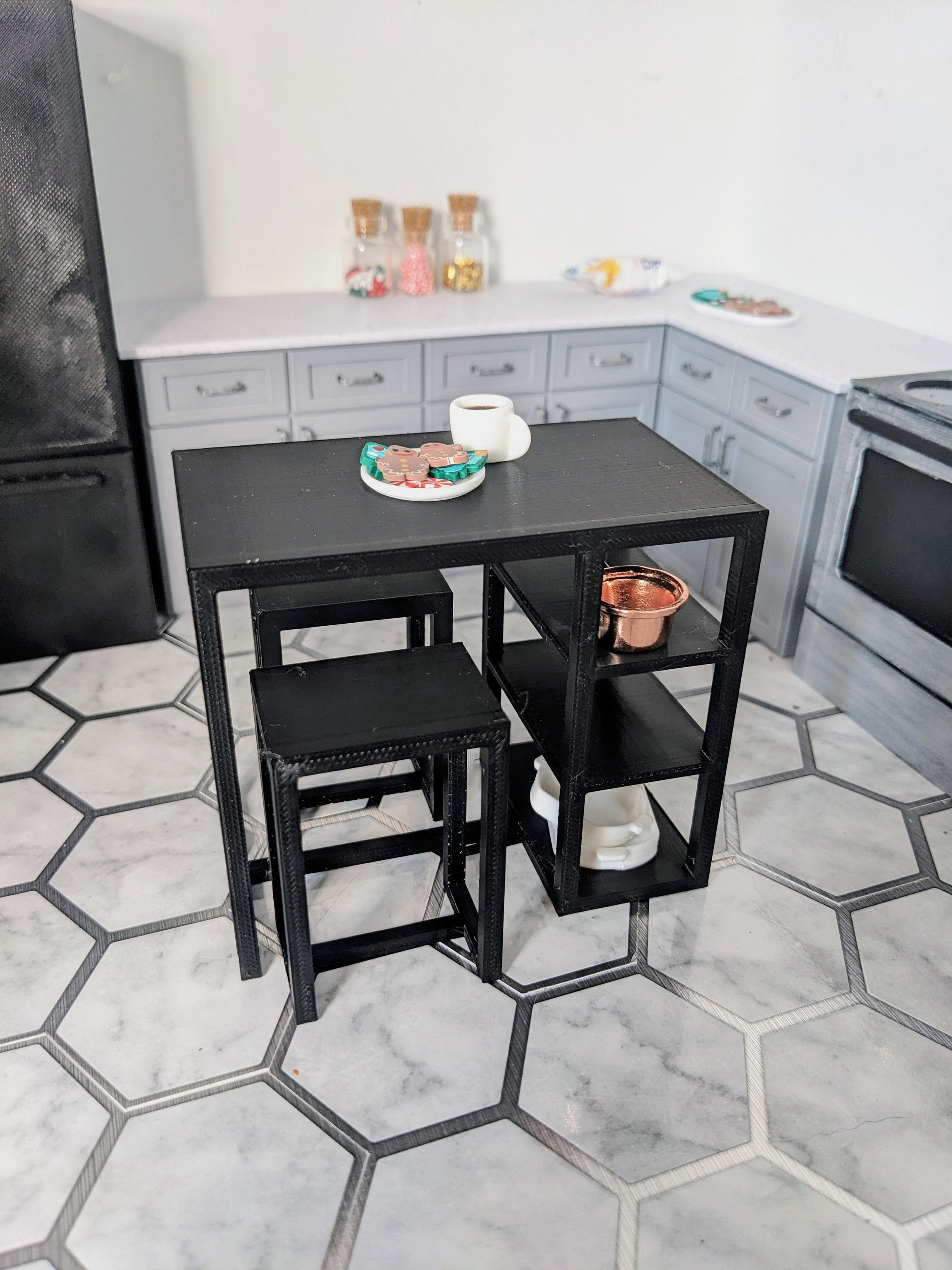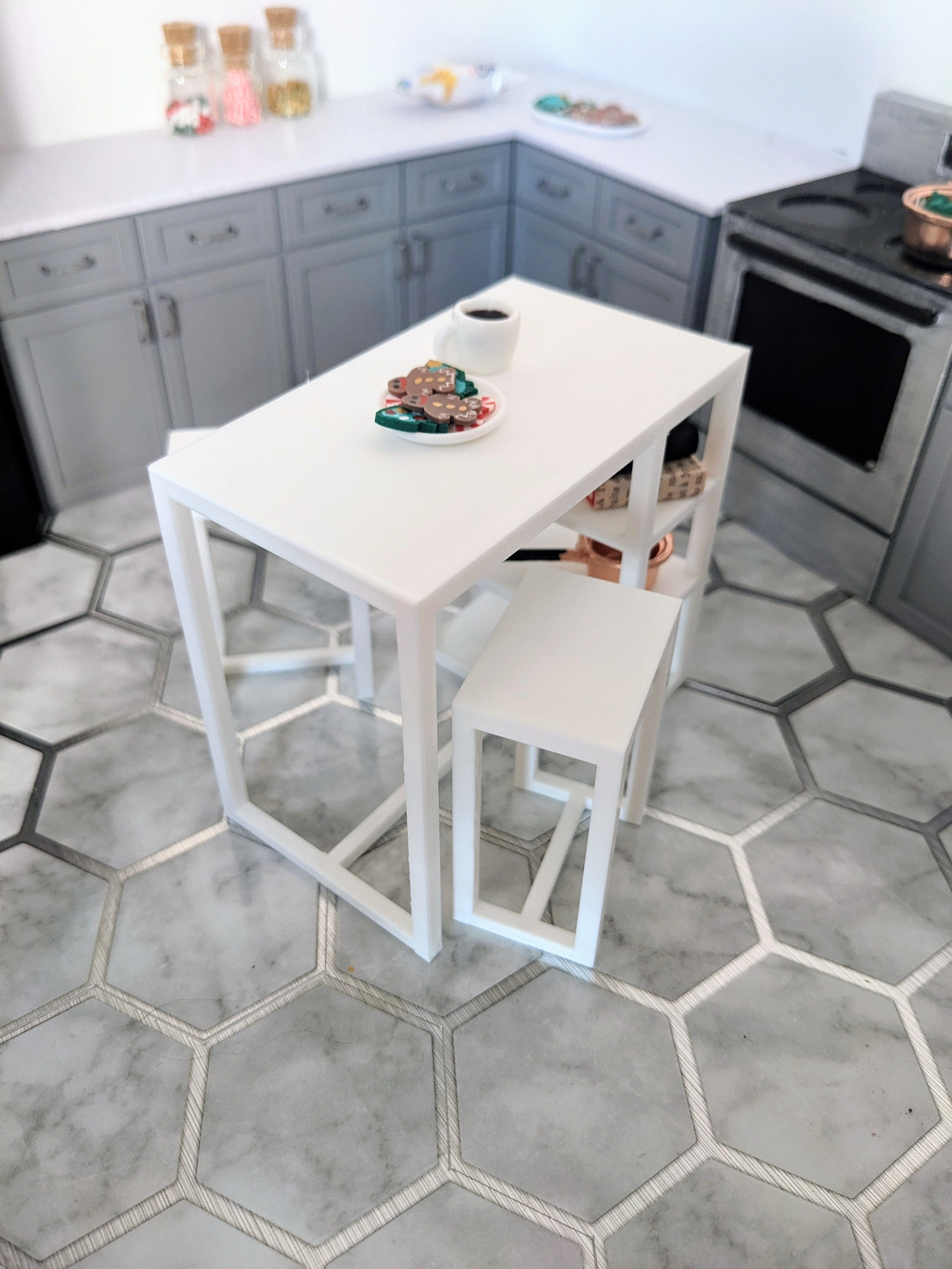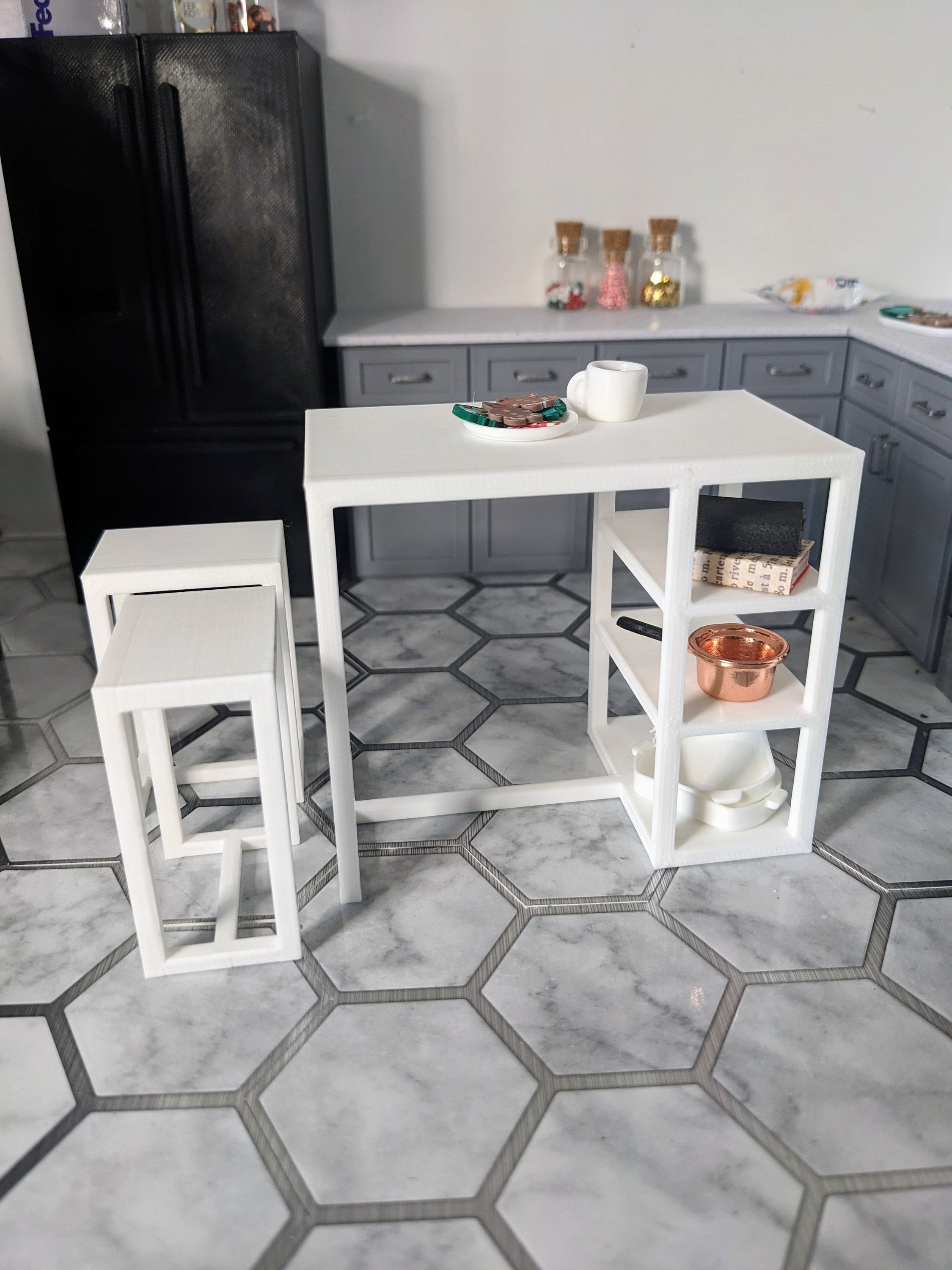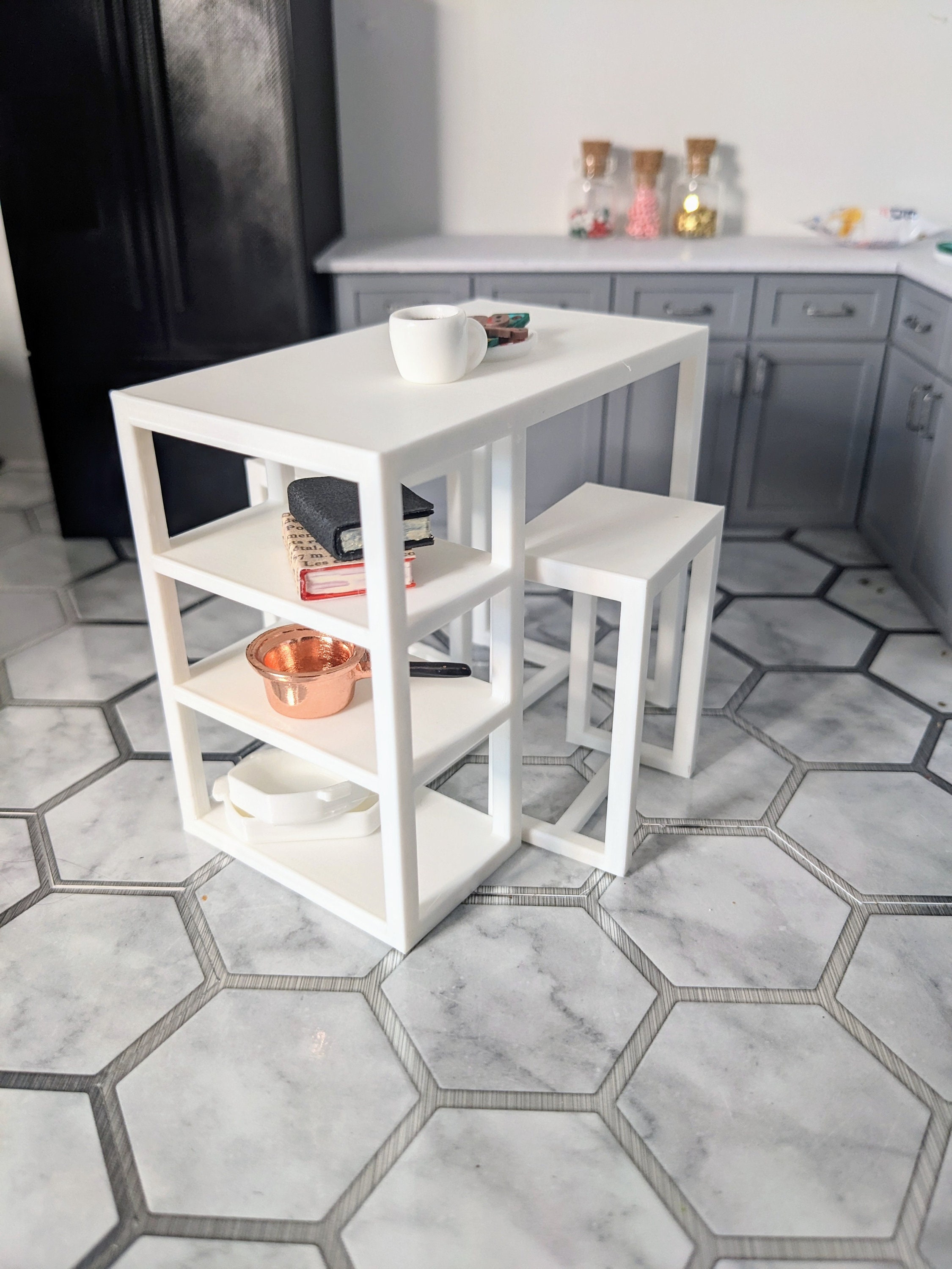 *Original Design!* A 3 piece set of bar height table and chairs in 1:12 scale. You'll receive one table and two chairs. As this is bar height, this could double as a kitchen island. There are three storage shelves underneath for kitchen gadgets or decor. If you have your own seat cushions, you could add them to the chairs for extra flair. You could even add wallpaper liner to the shelves for a pop of color! This set is 3D printed using high quality PLA plastic.
