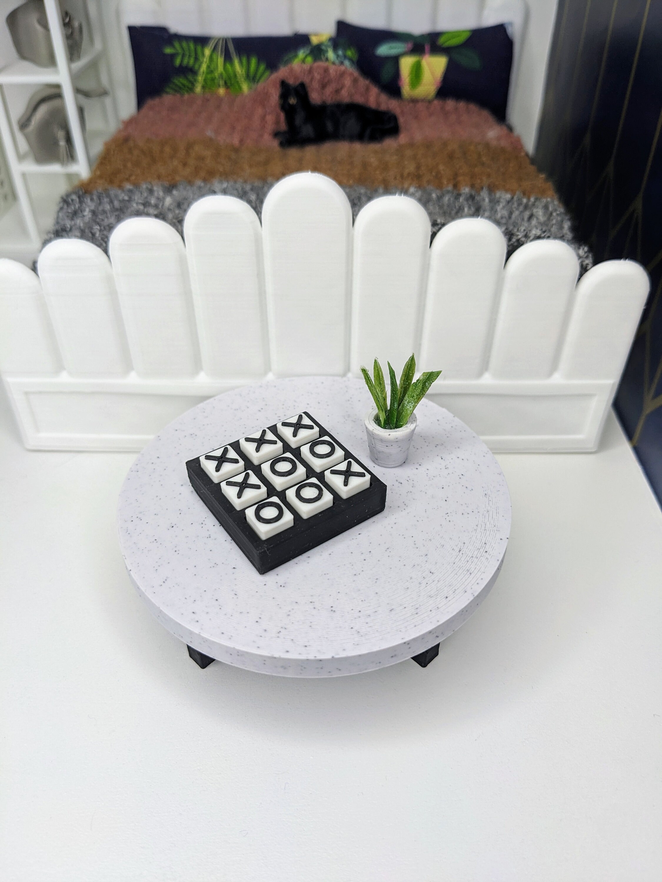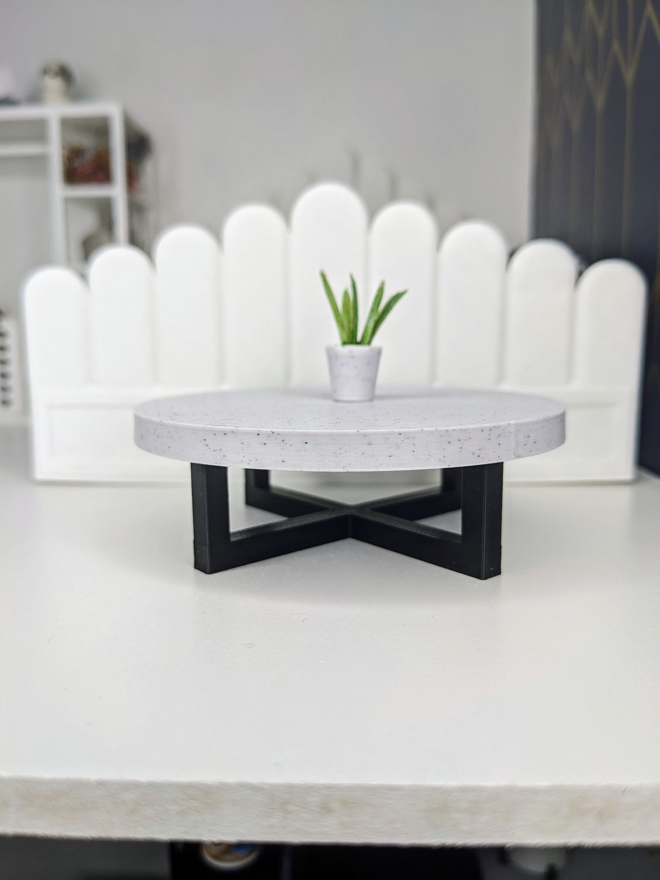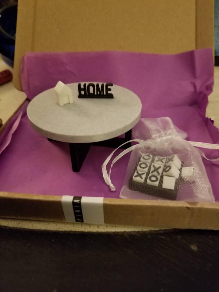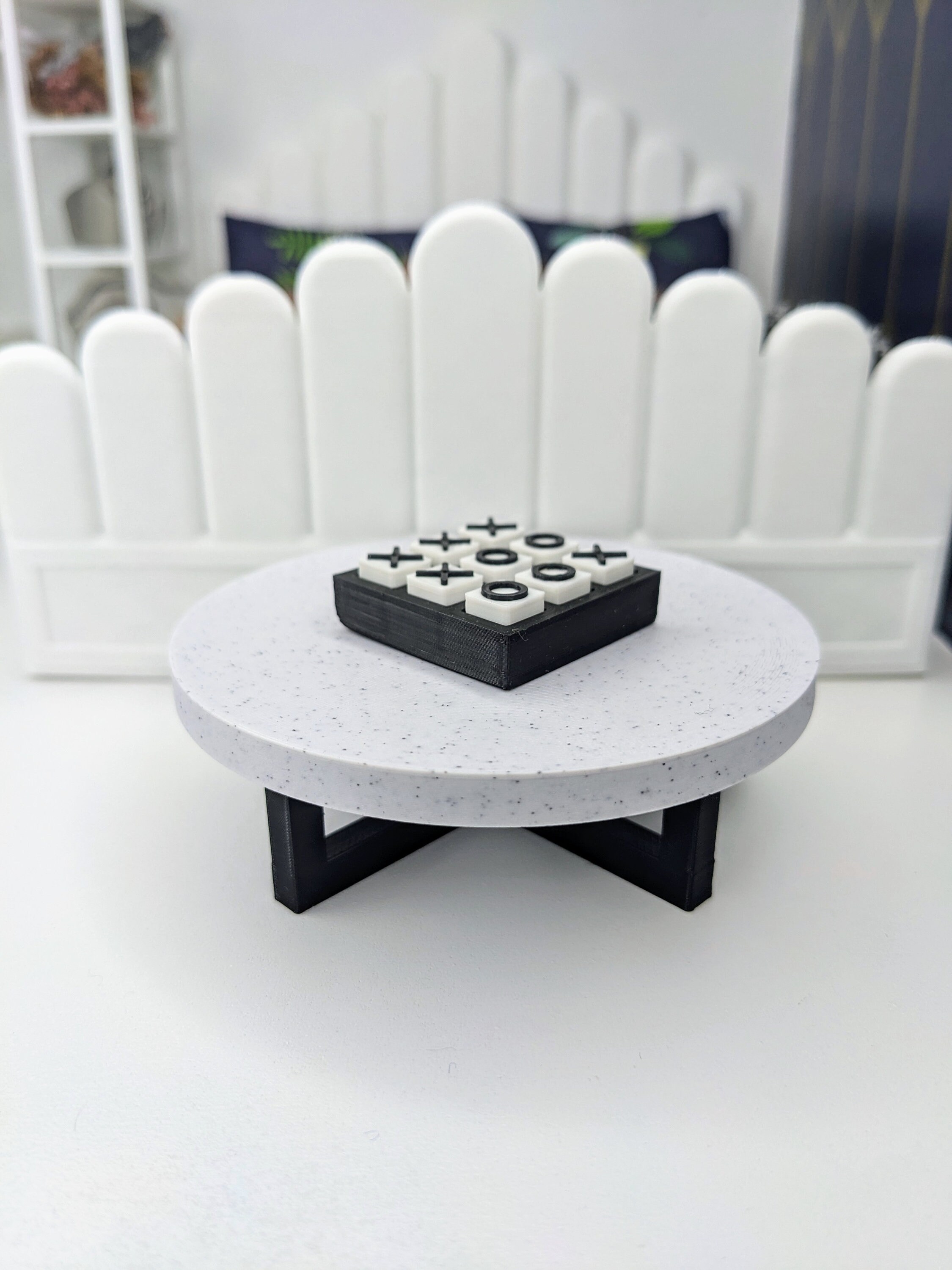 *Original Design!* A modern coffee table in 1:12 scale! This table is 3D printed with a marble white table top and black legs. It measures 3.25" wide by 1.5" tall. An adorable and functional tic tac toe board is also available for add-on!