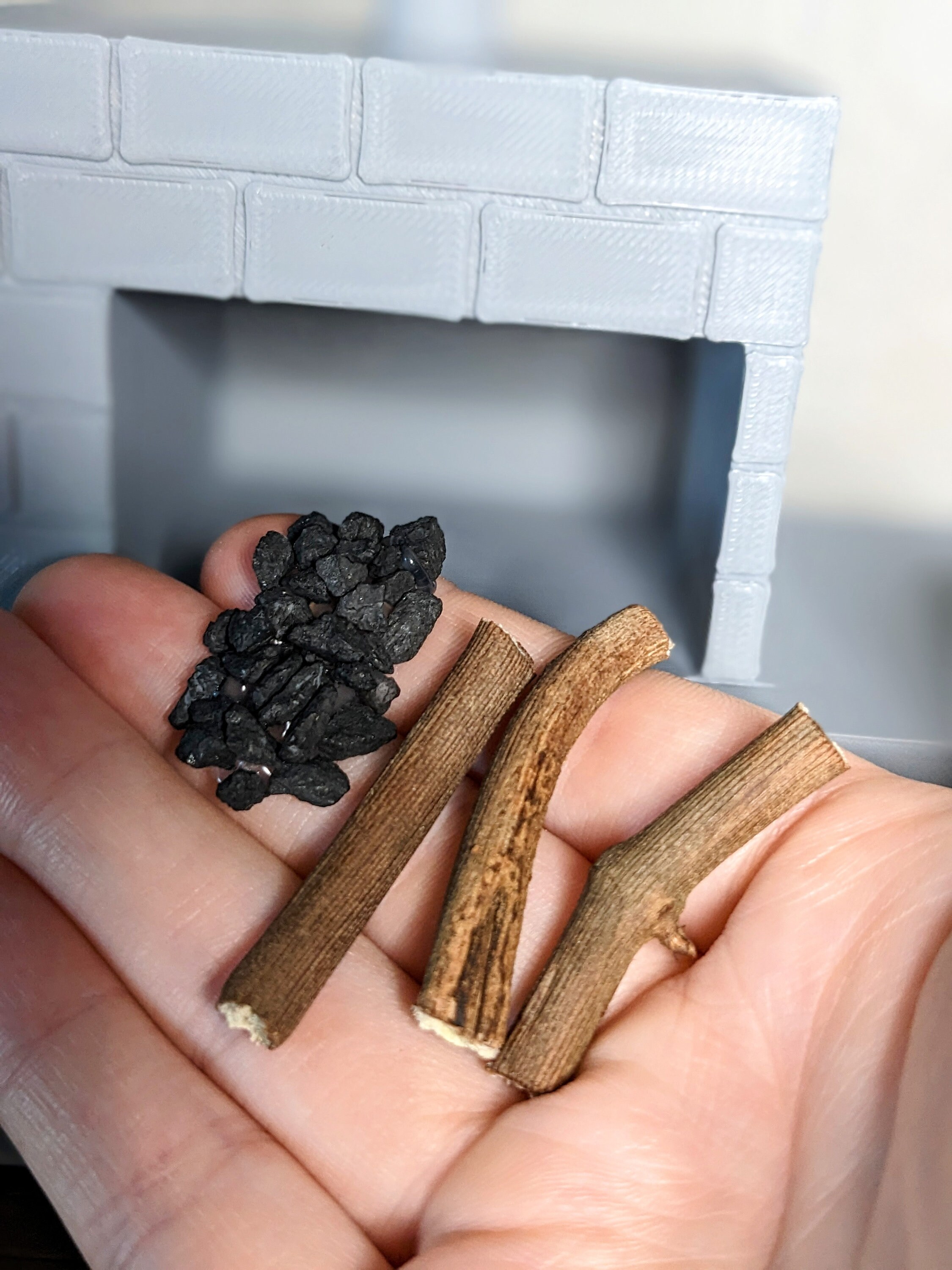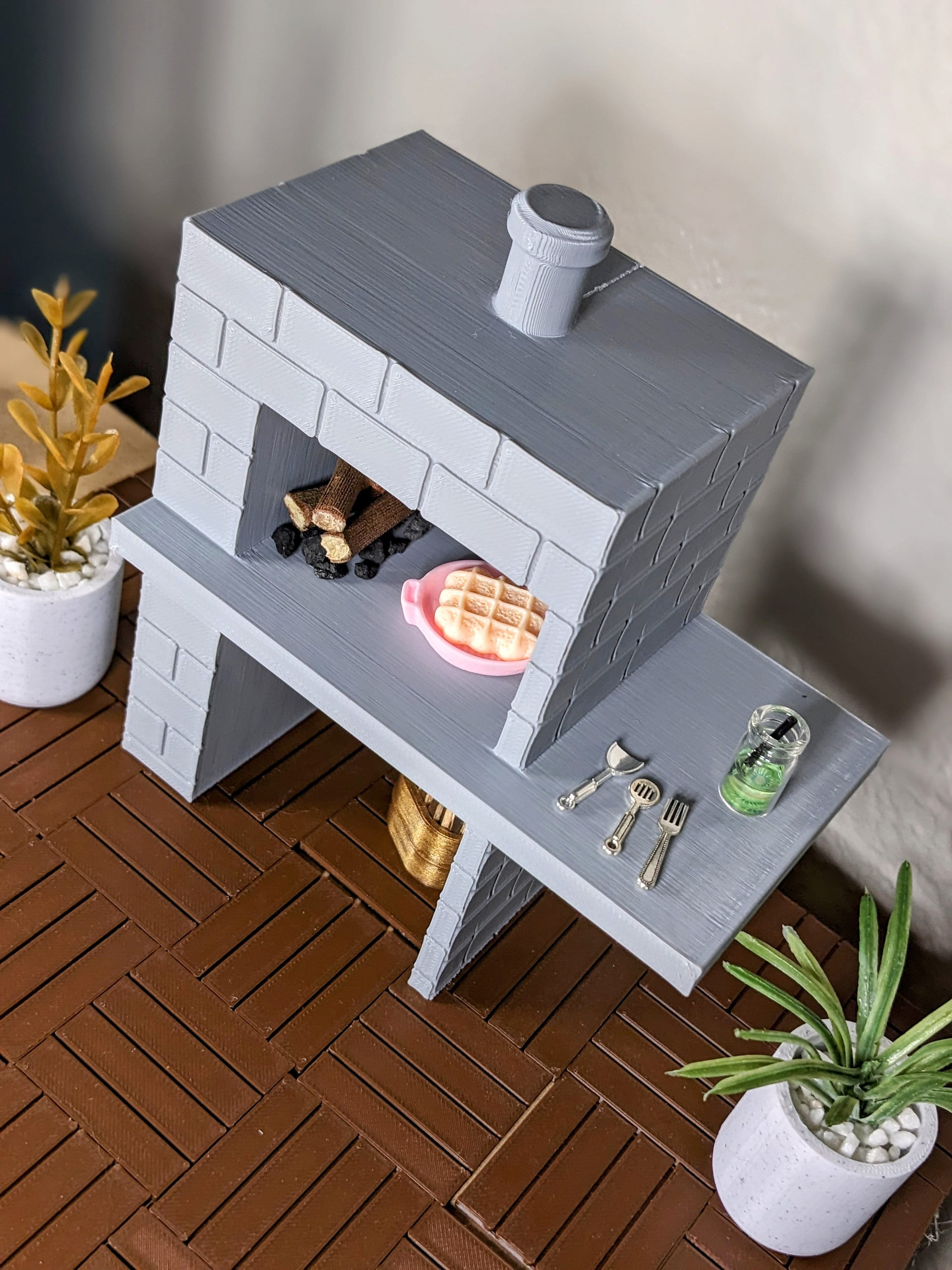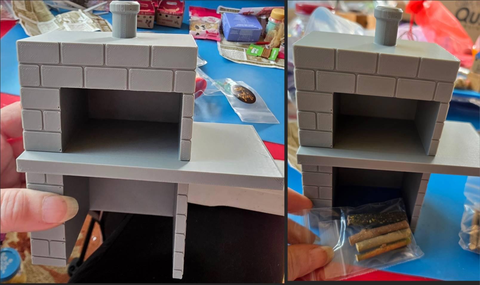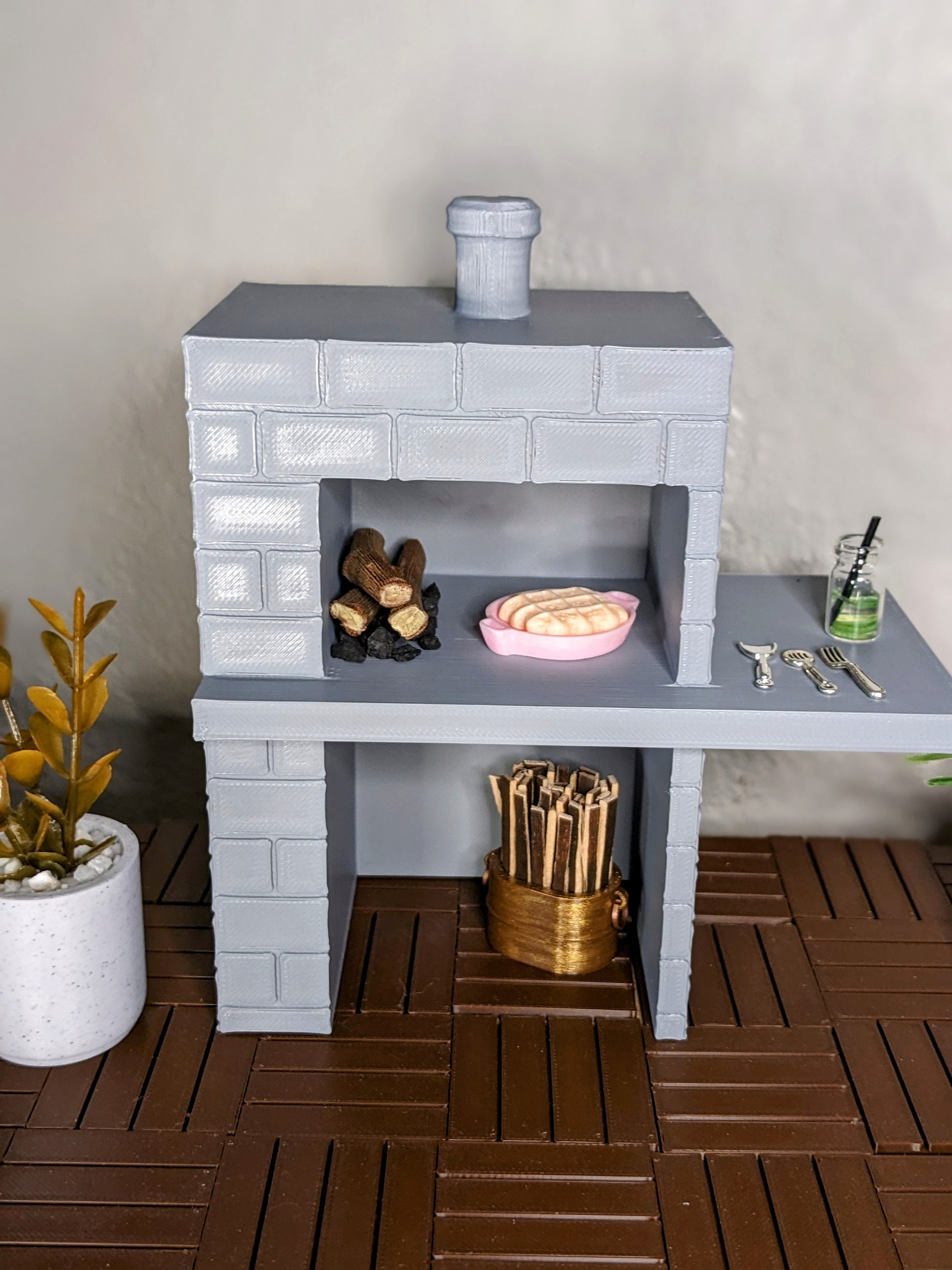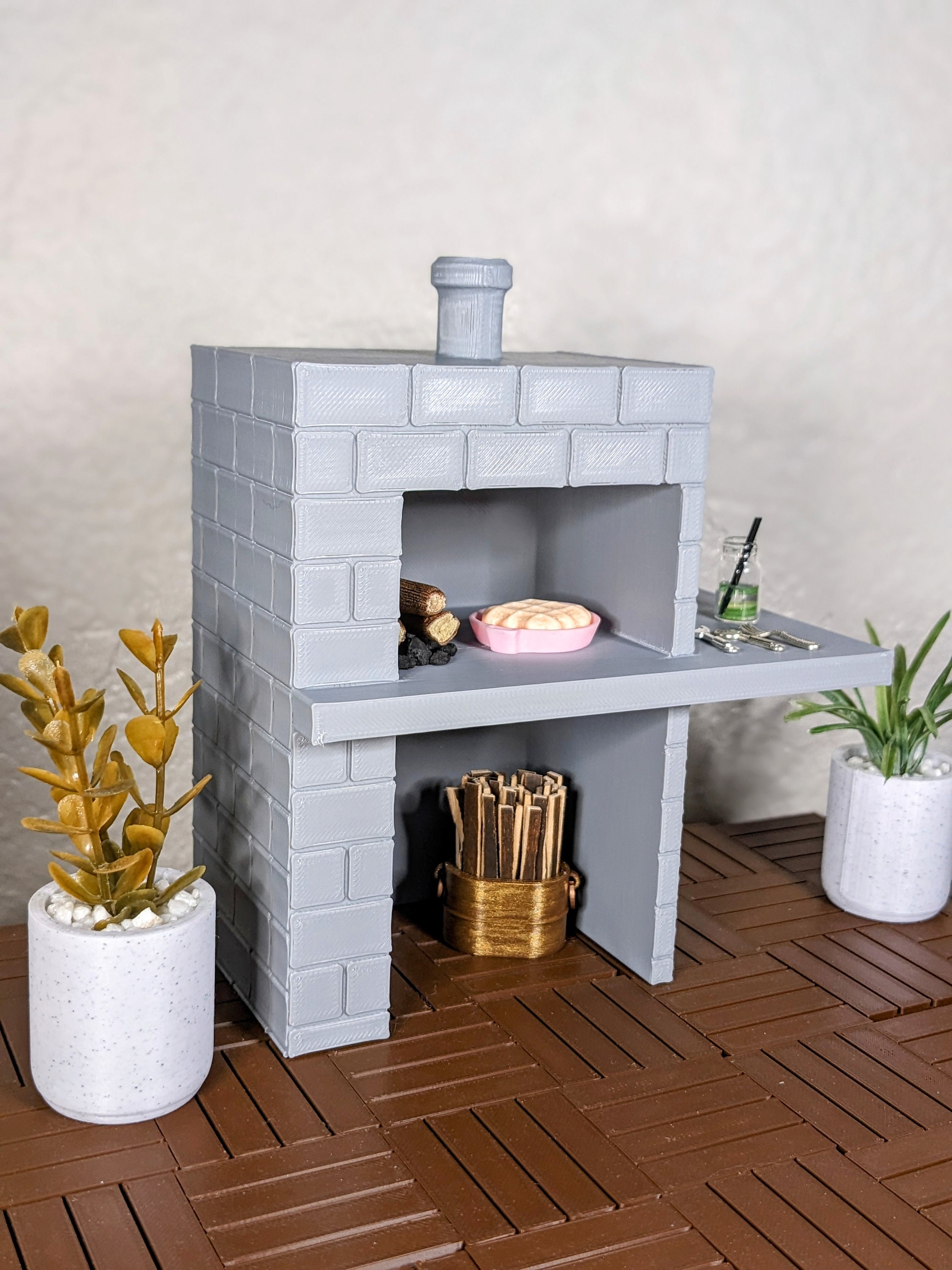 *Original design!* A modern brick pizza oven in 1:12 scale! This is 3D printed using high quality PLA plastic, and includes a pile of "coal" and 3 small logs. It has storage below for your own wood, kindling, or other cooking essentials, and plenty of counterspace for your utensils, drinks, plates, and of course pizza! Inside the oven you can place your wood and pizza side by side, or wood in the back and pizza in the front, there is plenty of room. *A standard size tea light will not fit inside the oven*
