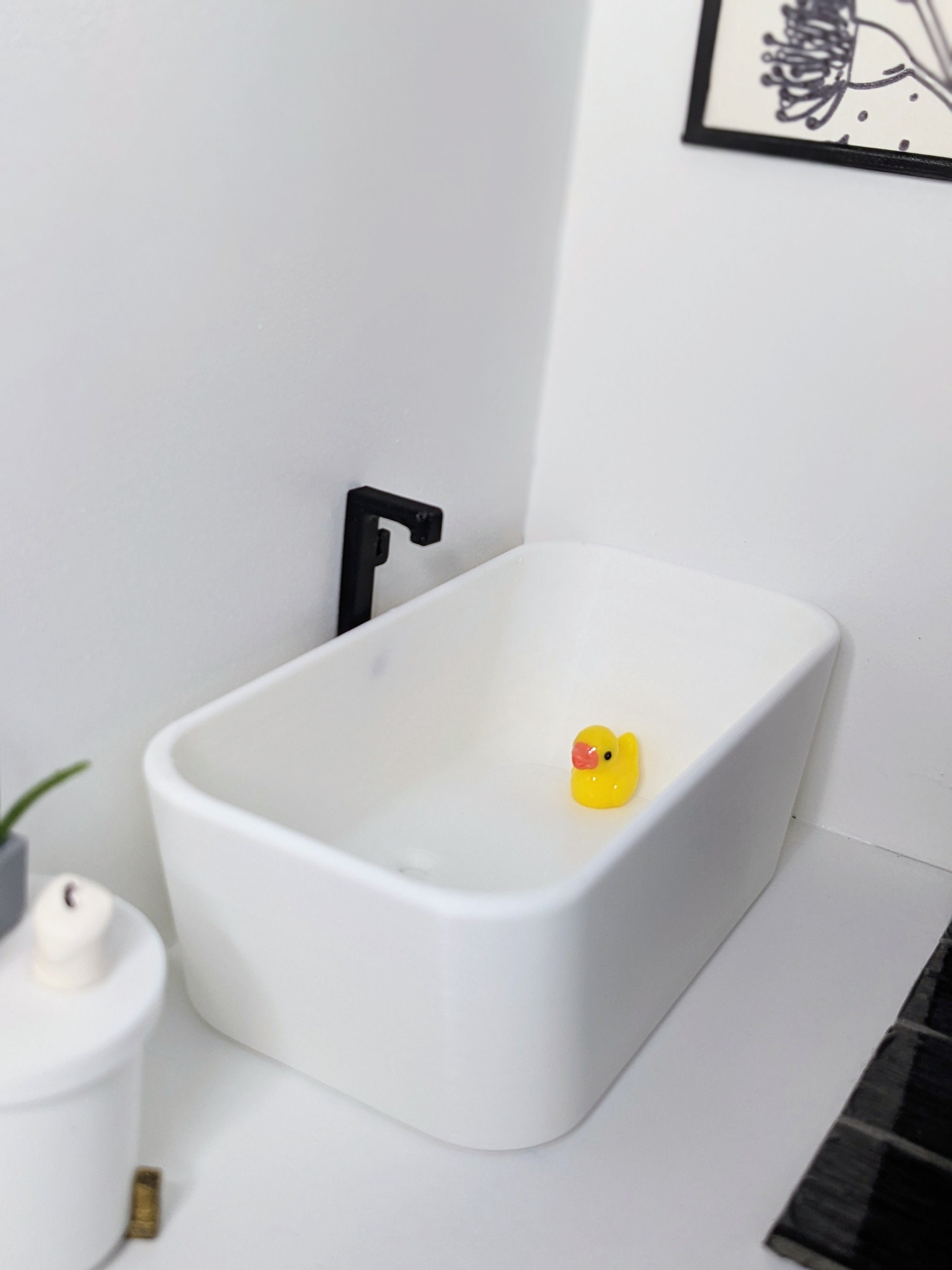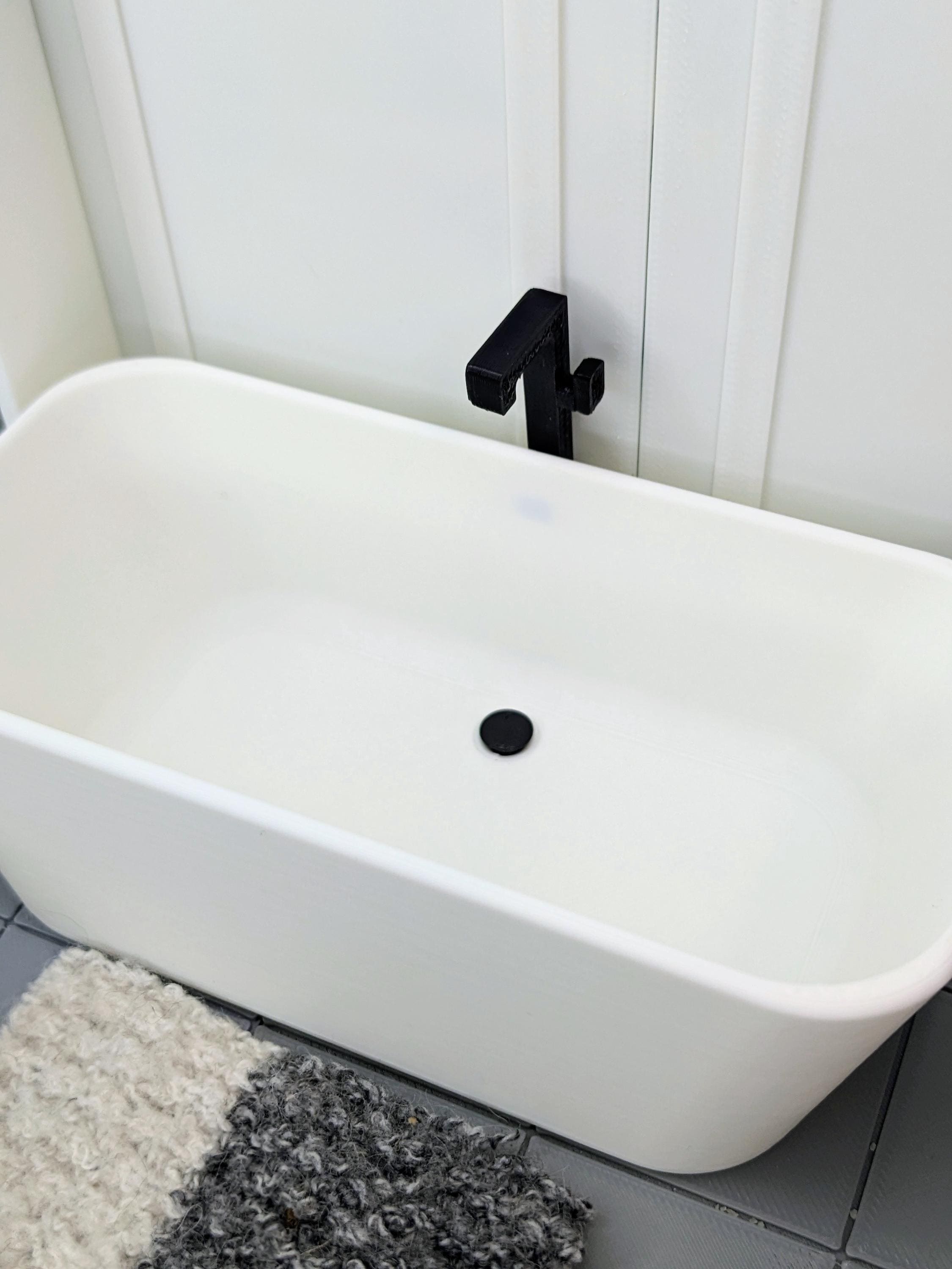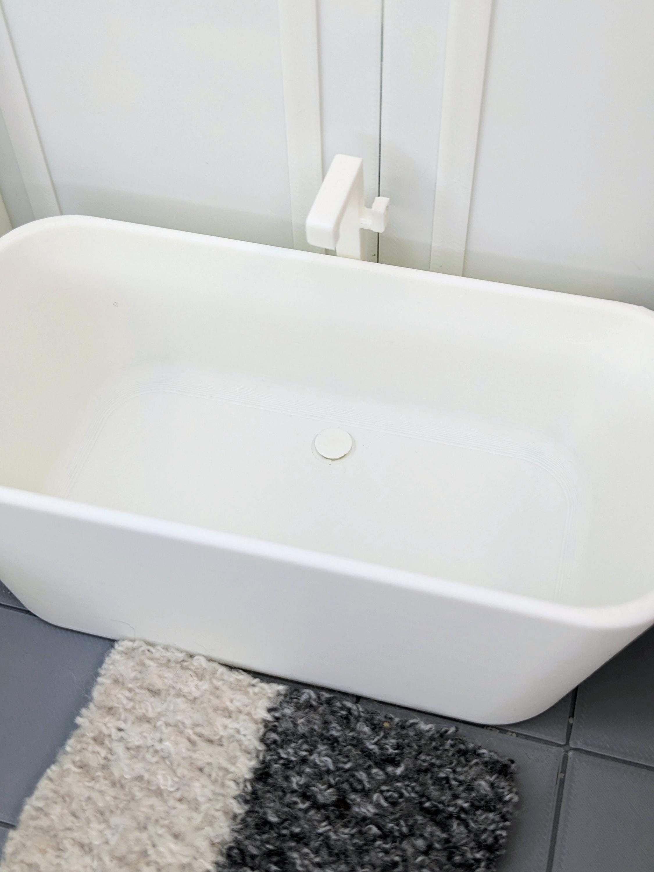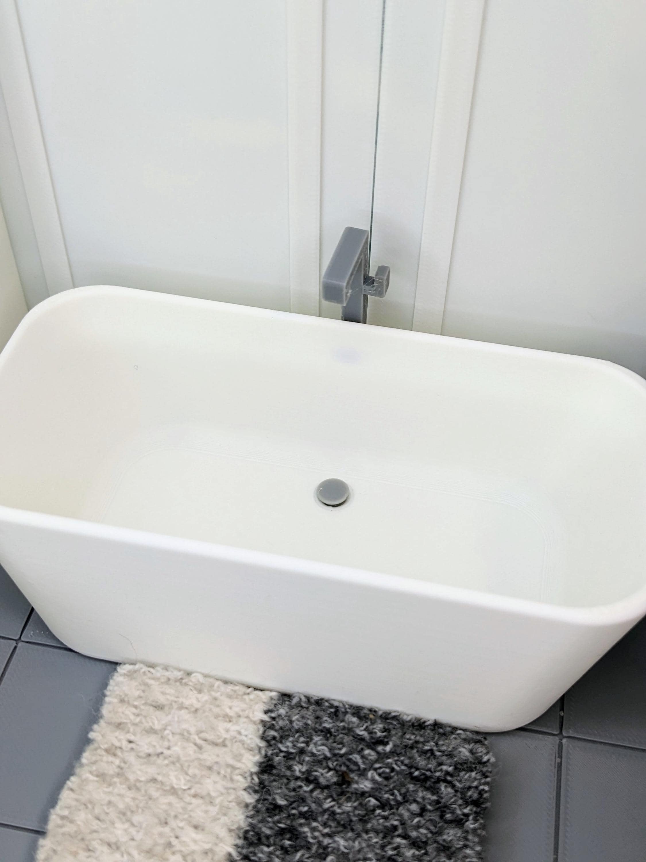 *NEW DESIGN FEATURES DRAIN PLUG!* *Original Design!* A modern bathtub in 1:12 scale! This tub is 3D printed with high quality PLA plastic and comes with an attached faucet that is secured to the back of the bathtub. NOW includes a drain plug in your choice of color. The drain plug is removable so you can customize how to display your tub! For display only, not intended for rough play. Comes with an adorable ducky! Need the perfect sized caddy? Check it out here! https://mossycatminisllc.etsy.com/listing/1682931027/112-bathtub-caddy-miniature-bathtub-tray