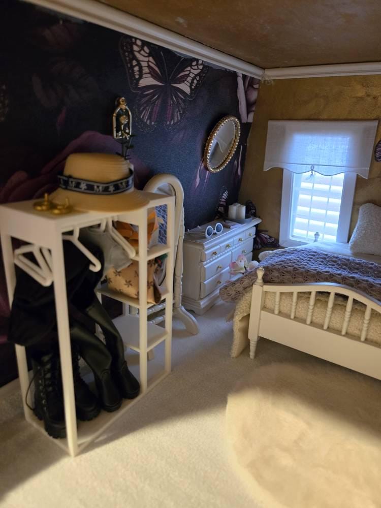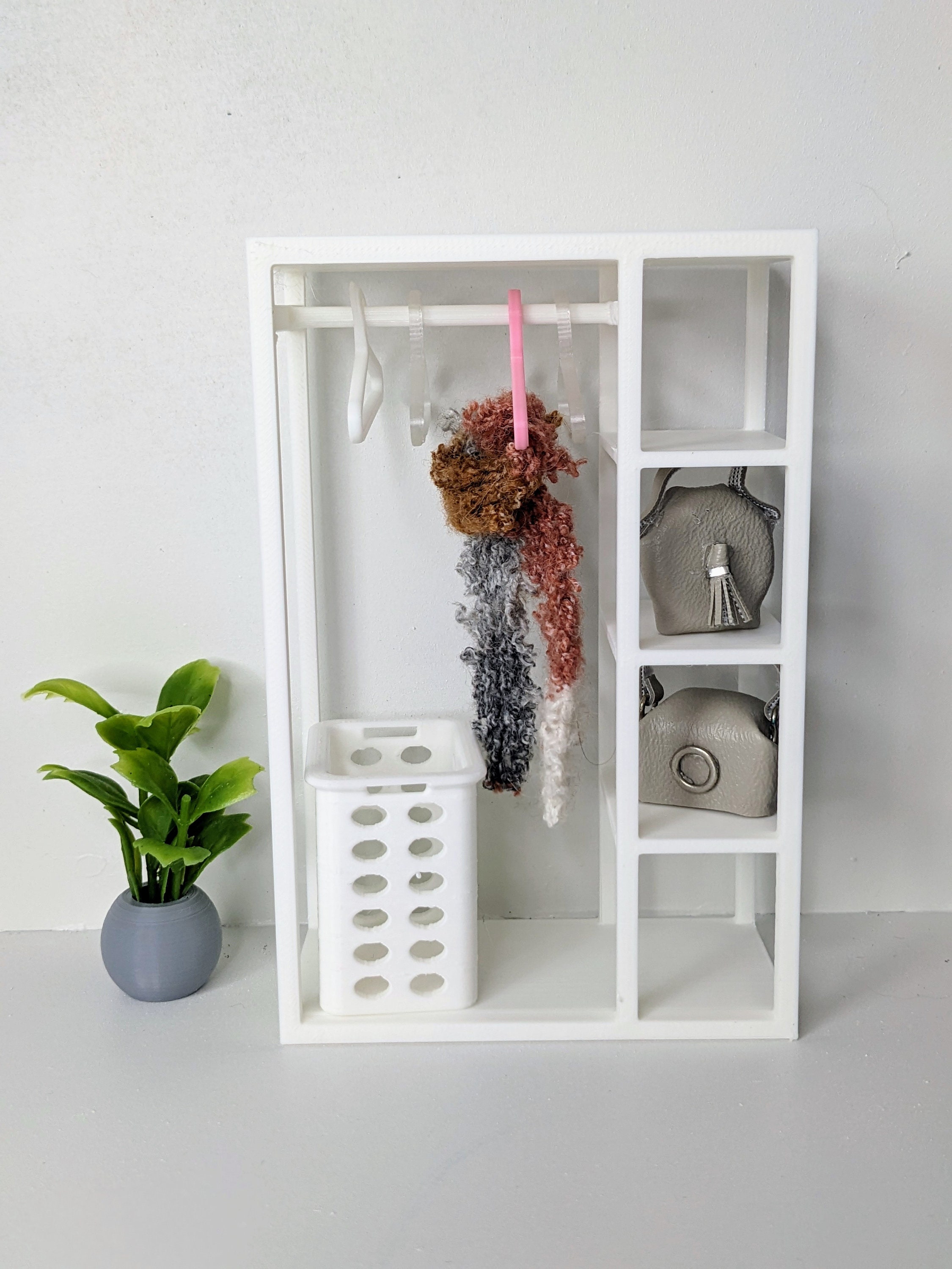 *Original Design!* A mini closet with 6 hangers in 1:12 scale! This closet is 3D printed using high quality PLA plastic. Hang your dresses and shirts on the clothing rod, then use the side shelves to display handbags and shoes, while the solid base can store baskets, blankets, or suitcases! This closet will come with 6 hangers that fit perfectly.
