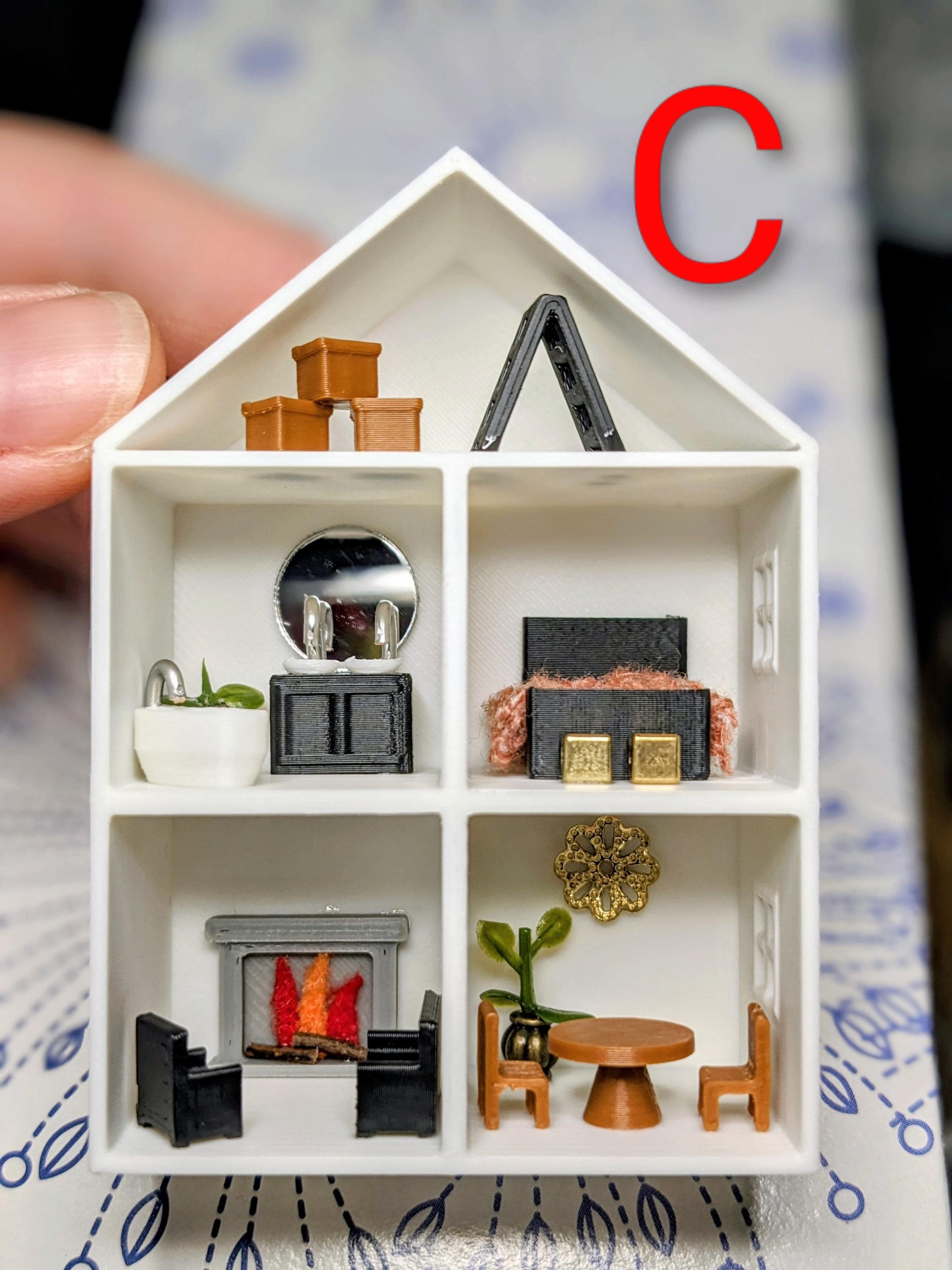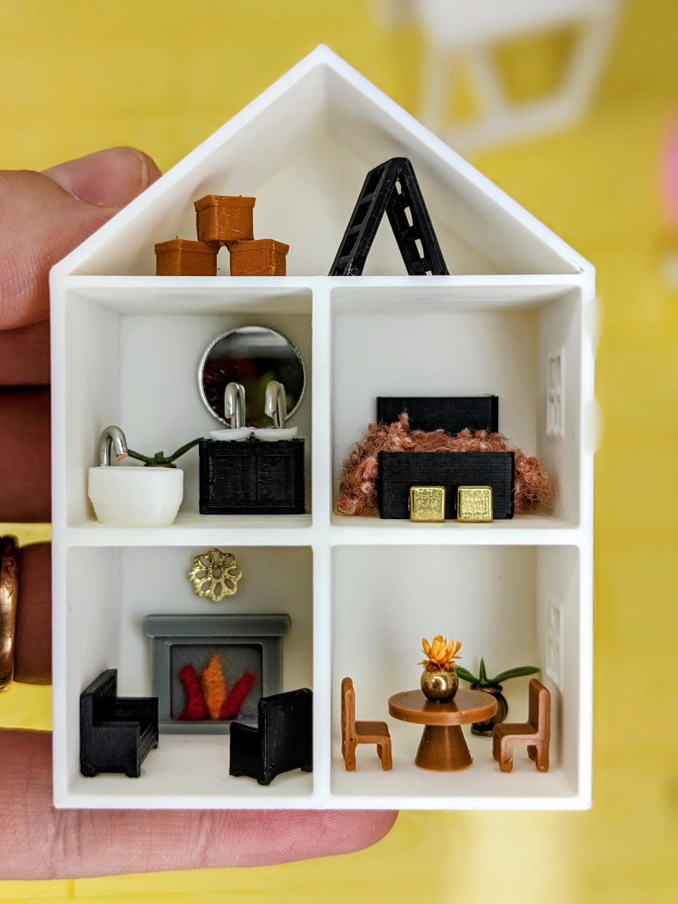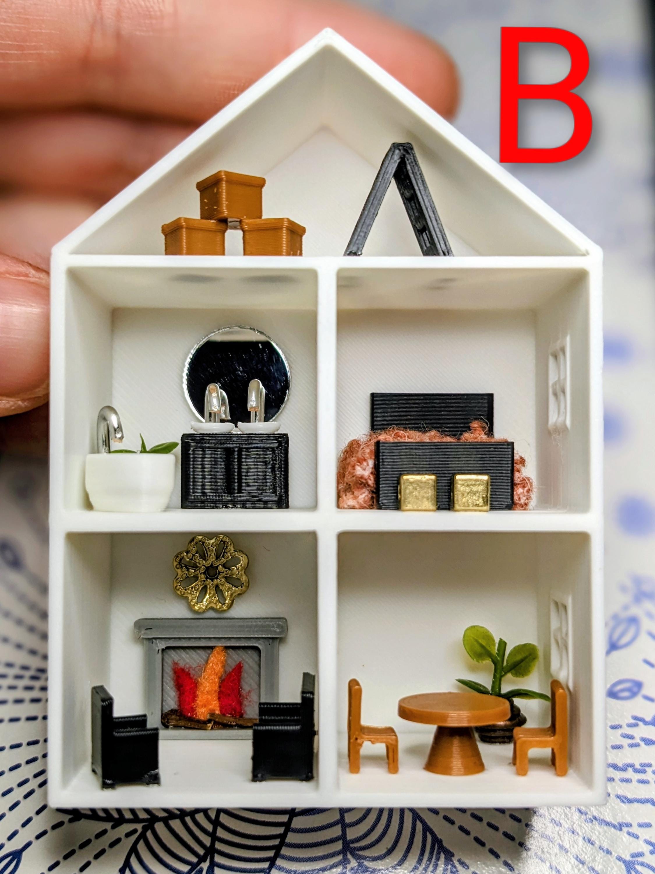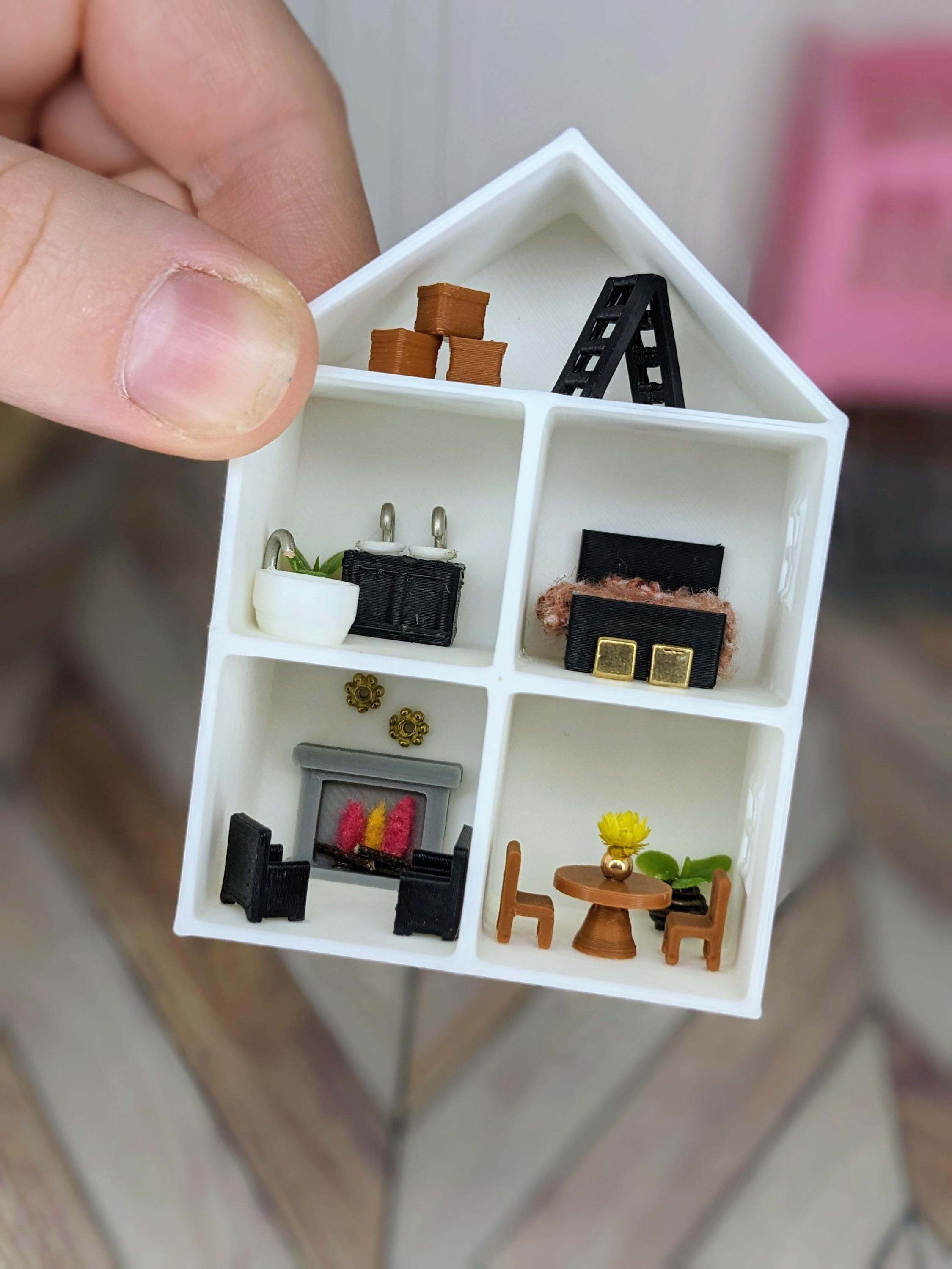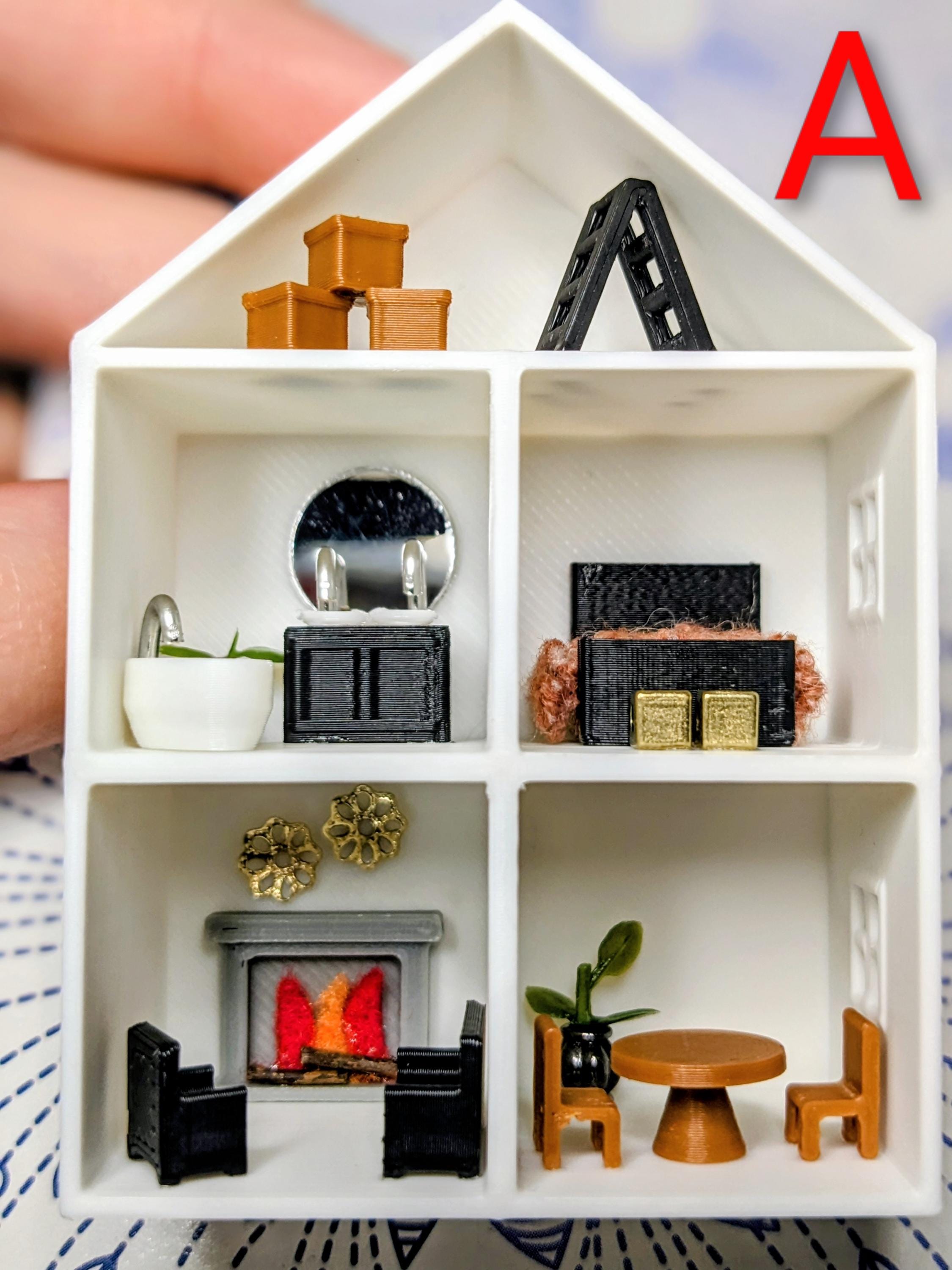 *Original Design!* A dollhouse for your dollhouse in 1:12 scale! This dollhouse is 3D printed with high quality PLA plastic, featuring 3D printed furniture, metal beads, faux plants, and other embellishments. Each piece of furniture is fixed inside, the furniture is NOT moveable. Different styles available, please see photos for variations! Styles will change from time to time based on material availability.