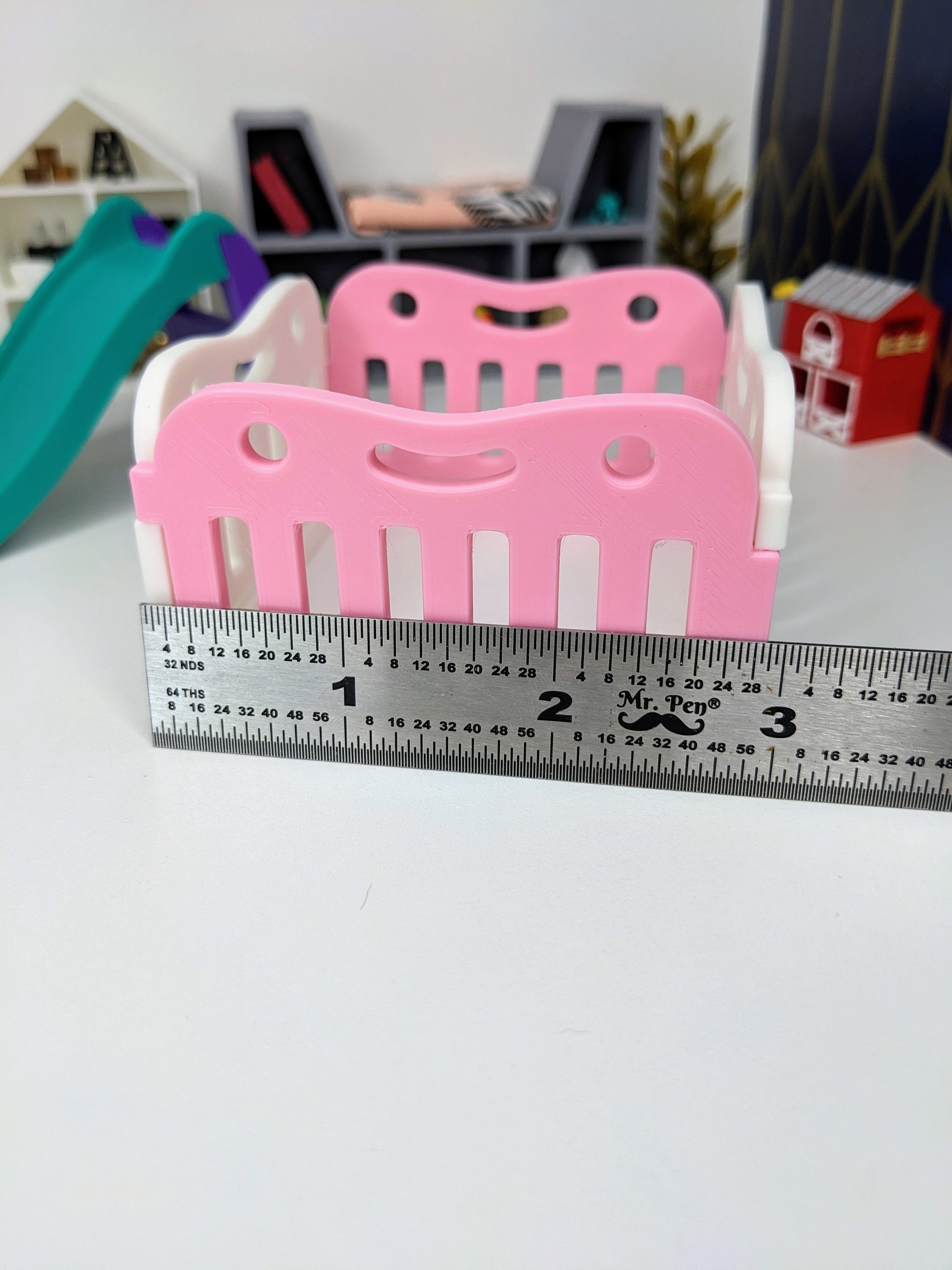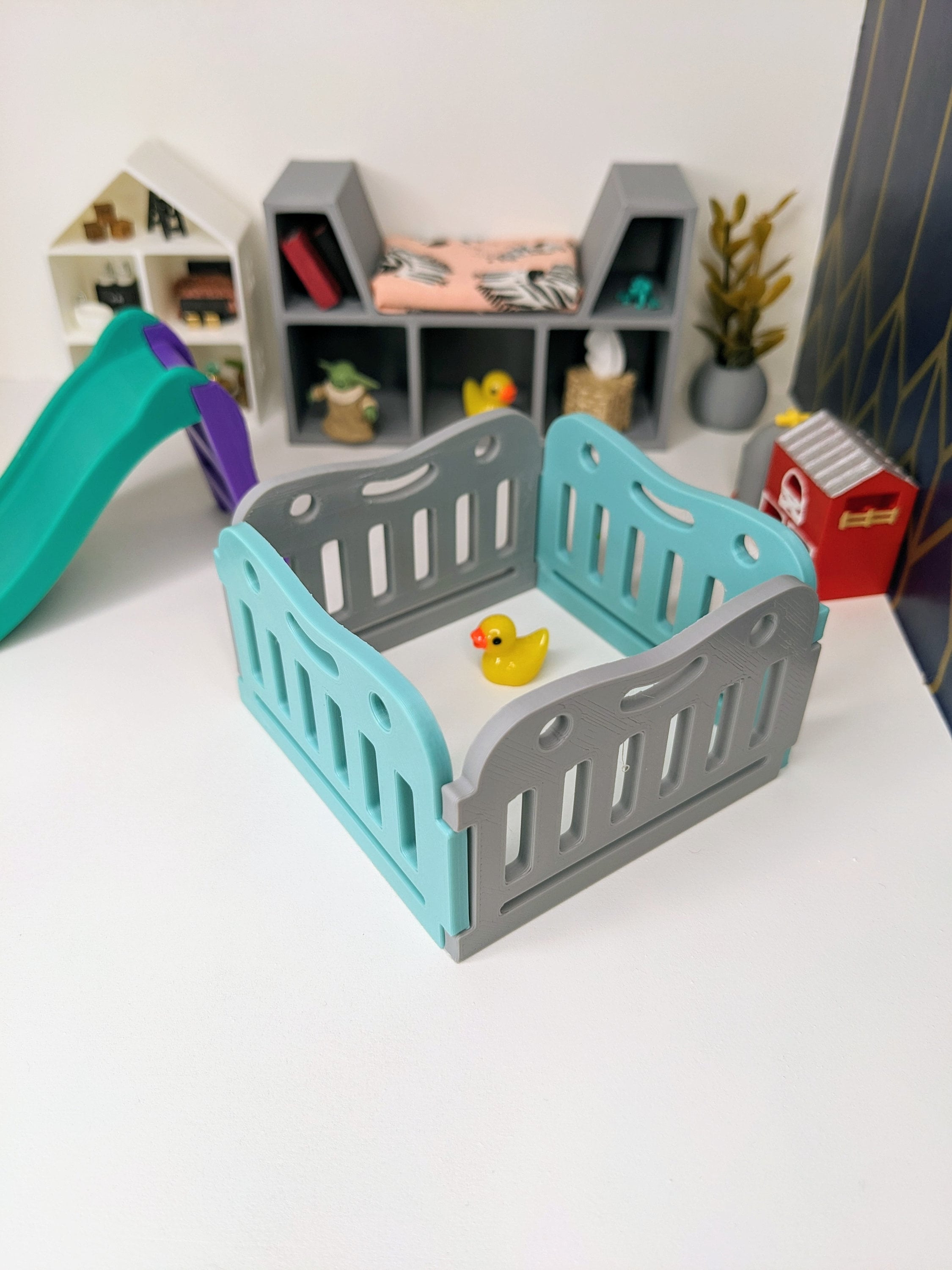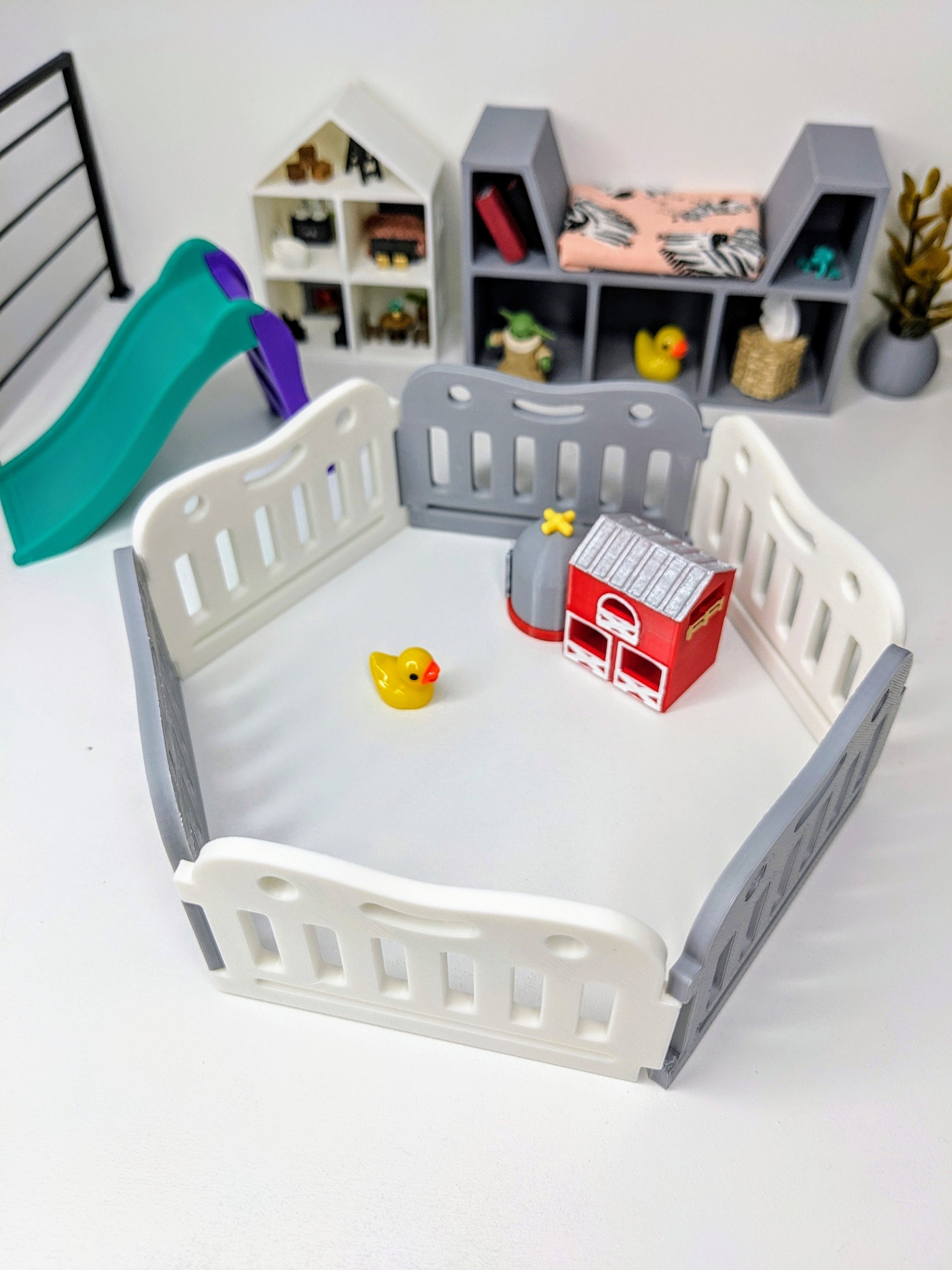*Original Design!* A super cute baby play pen in 1:12 scale! This item is 3D printed with high quality PLA plastic and available in multiple colors. Choose either a square play pen (4 pieces) or rectangle play pen (6 pieces). The rectangle size of 6 pieces allows you to make a circular play pen. Each fence panel snaps together, and can easily be moved around into other shapes, or use as one long baby gate. Other decor and accessories not included. Not intended for rough play. Please use personalization section only for color choices, up to TWO colors.