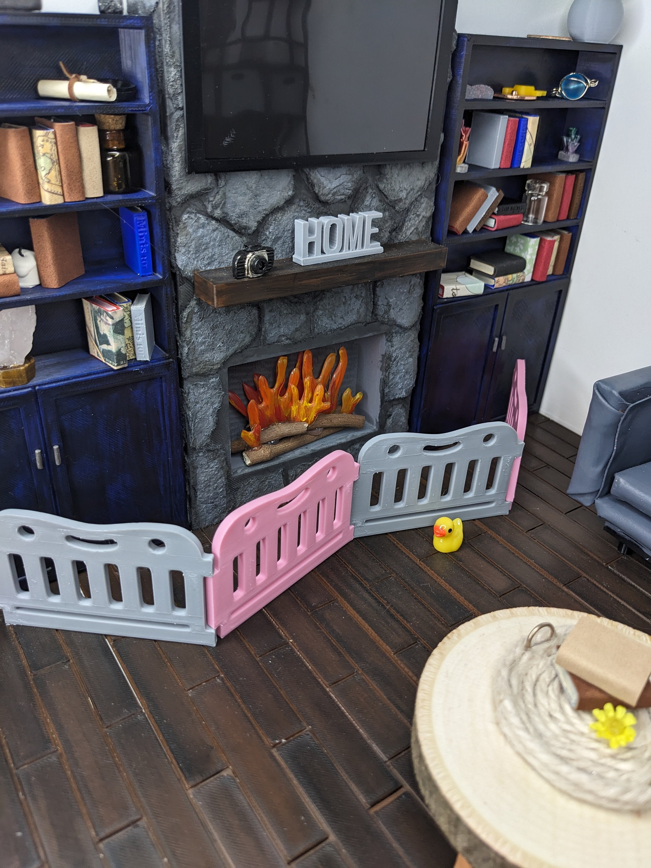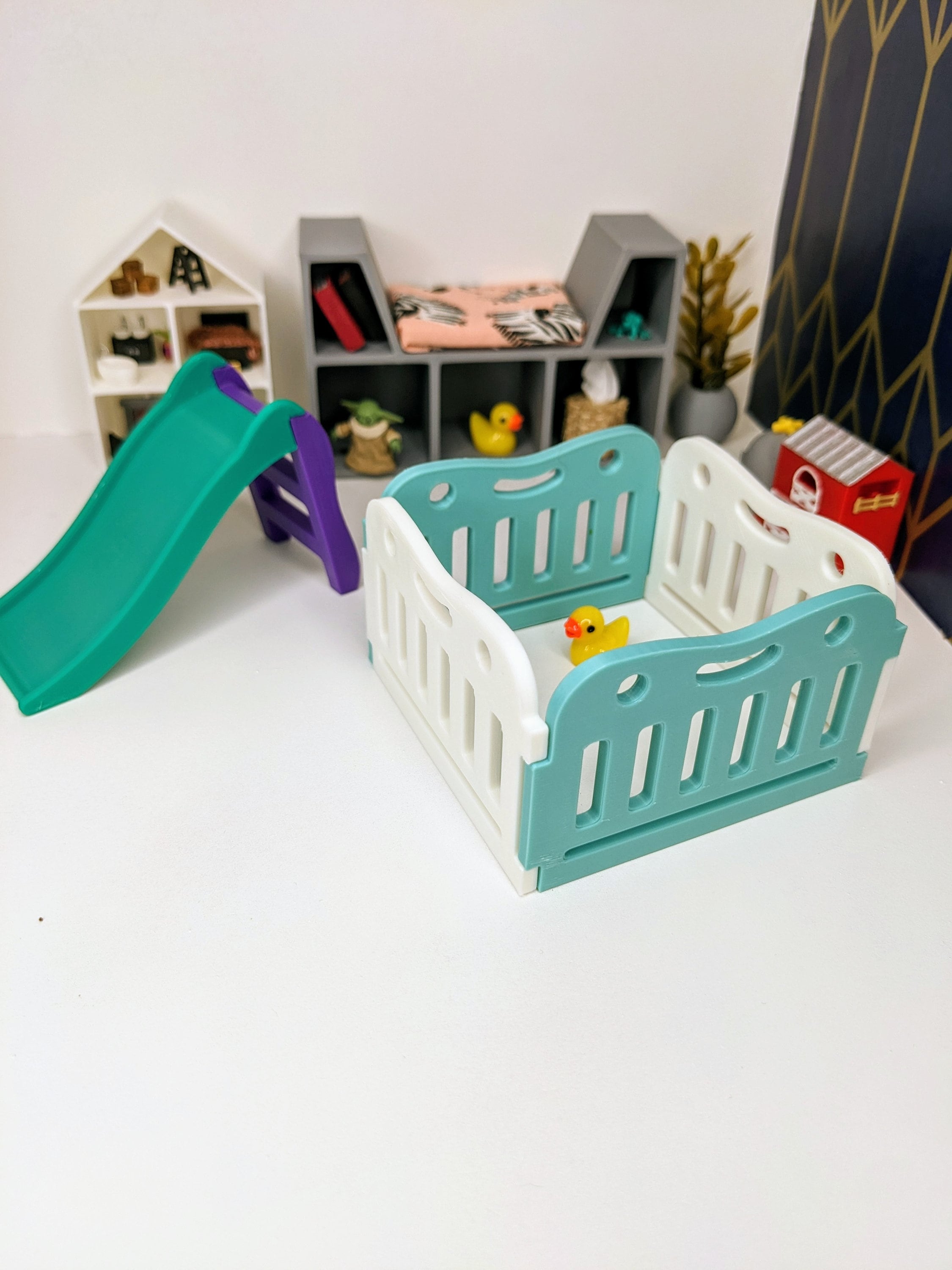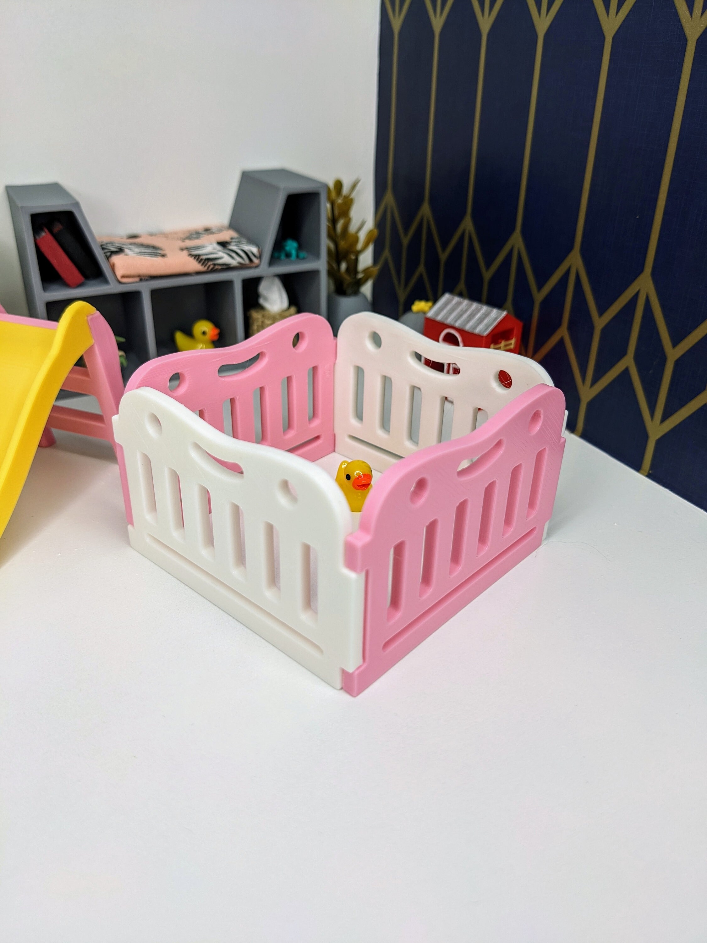 *Original Design!* A super cute baby play pen in 1:12 scale! This item is 3D printed with high quality PLA plastic and available in multiple colors. Choose either a square play pen (4 pieces) or rectangle play pen (6 pieces). The rectangle size of 6 pieces allows you to make a circular play pen. Each fence panel snaps together, and can easily be moved around into other shapes, or use as one long baby gate. Other decor and accessories not included. Not intended for rough play. Please use personalization section only for color choices, up to TWO colors.