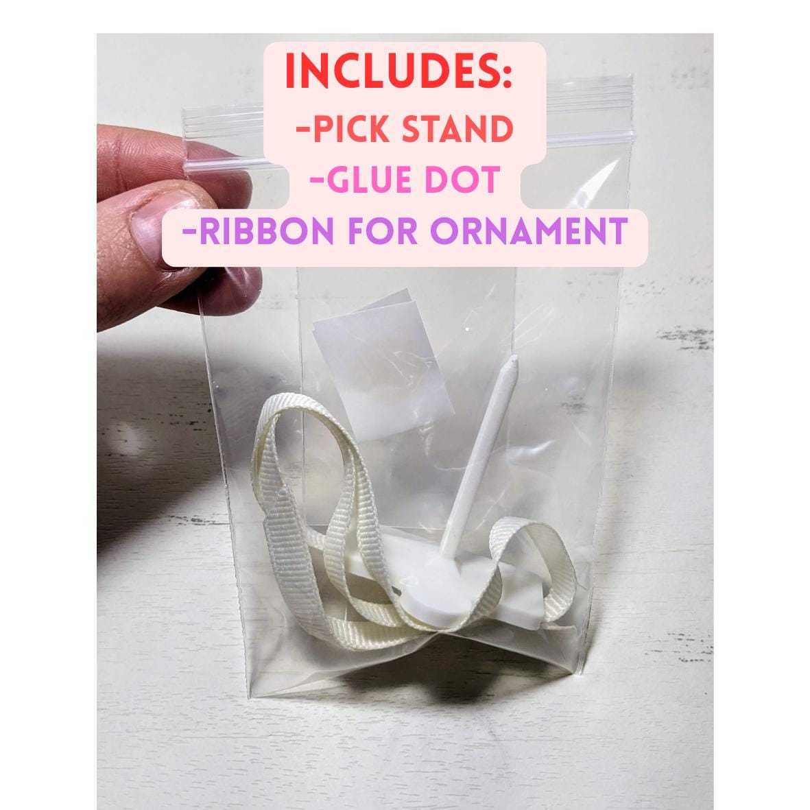 What's included: 1 vacuum cake topper, 1 topper stand (white), 1 piece of ribbon (colors vary), 1 glue dot