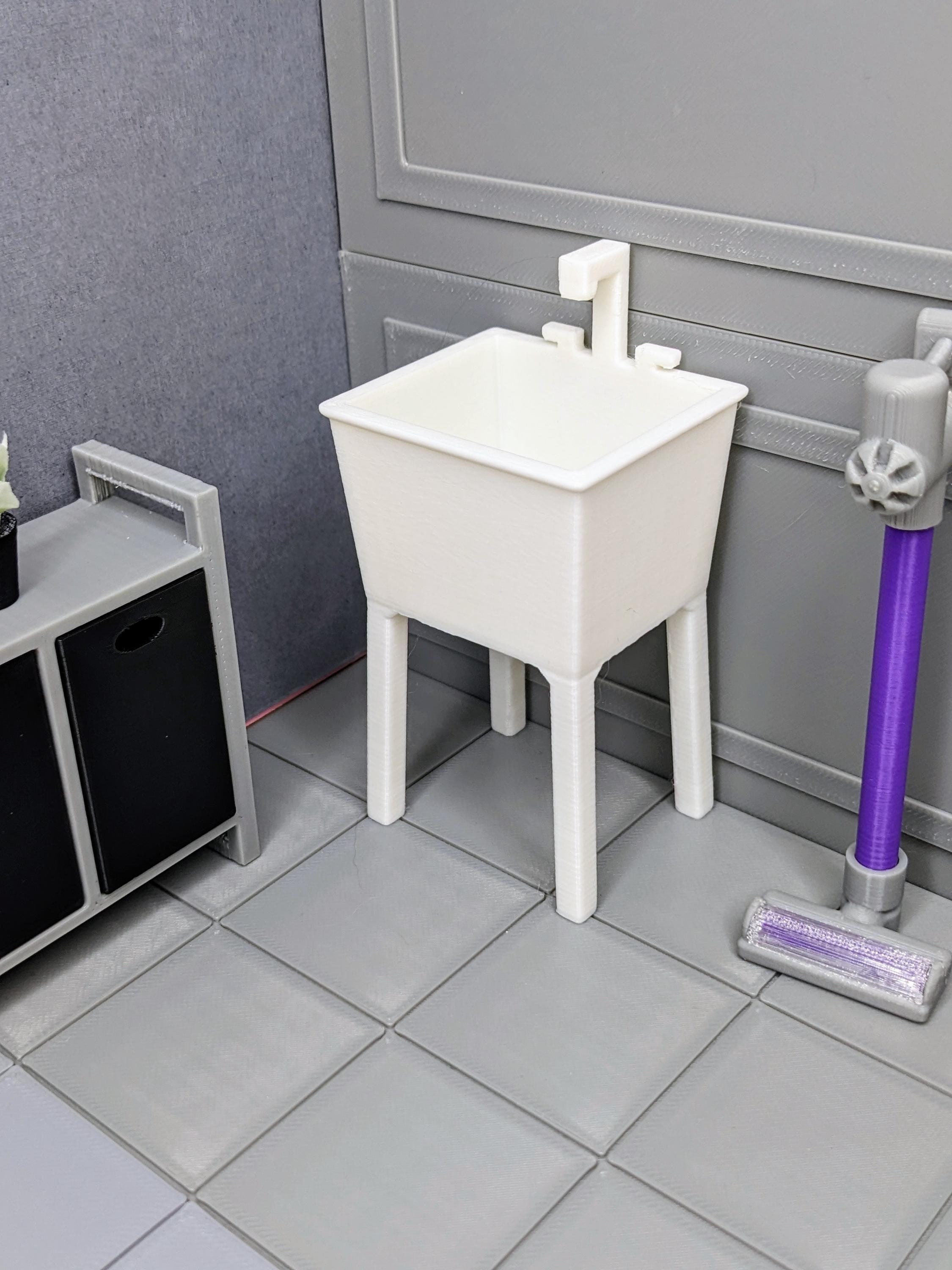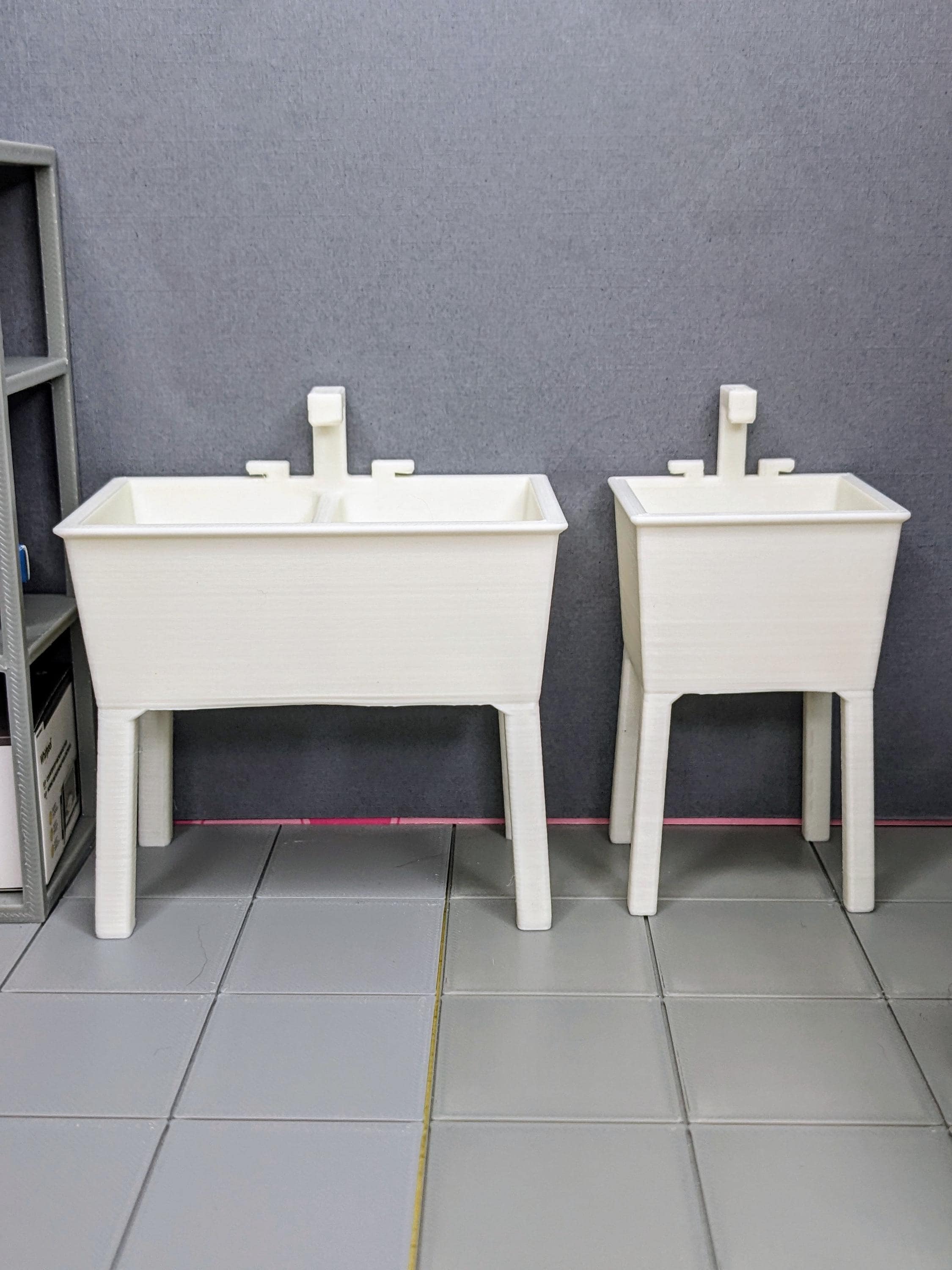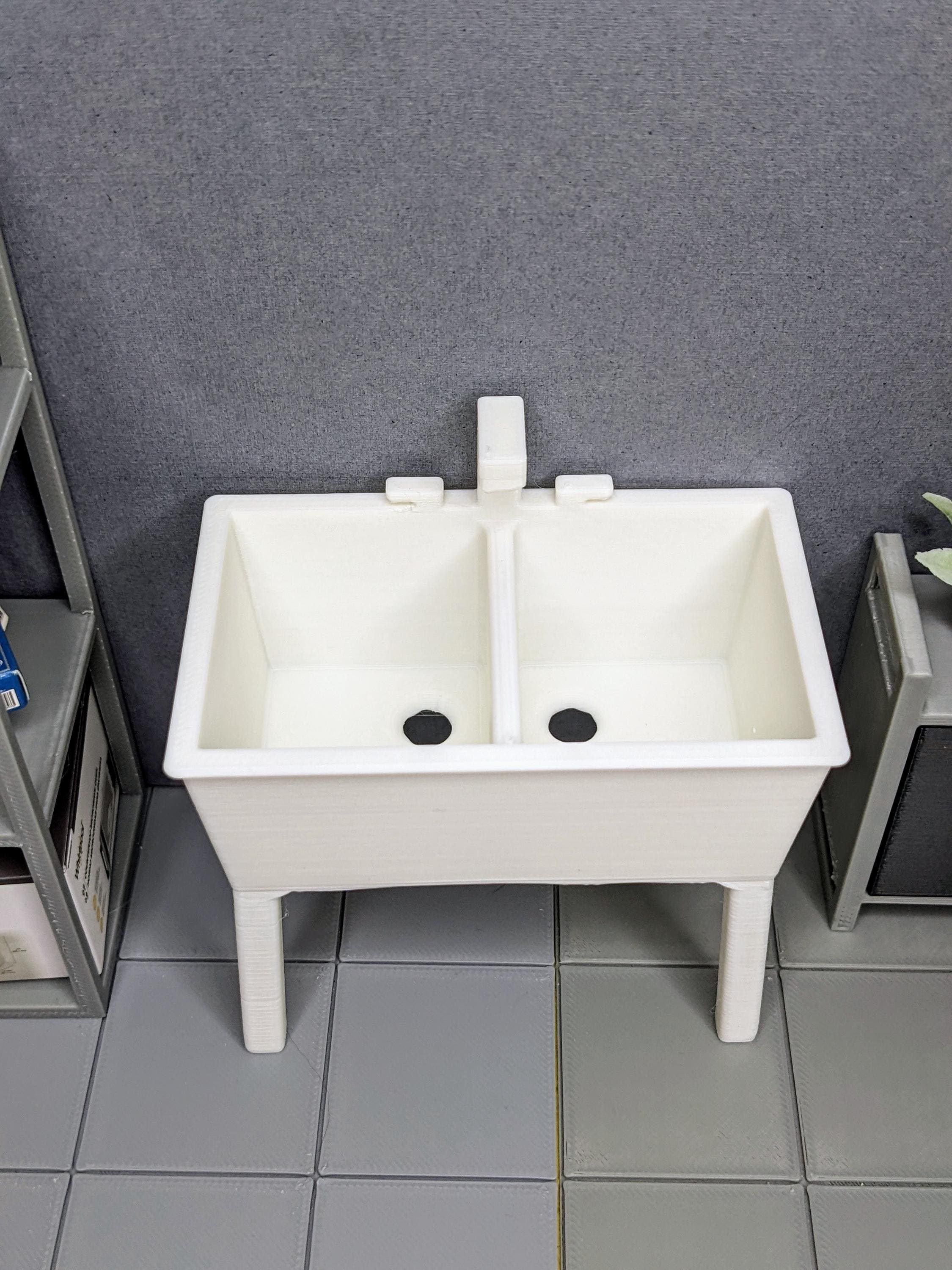 *Original Design!* A utility sink in 1:12 scale! Available as a single-basin sink or double-basin sink. This sink is super versatile and can be used many ways; it can be easily painted with acrylic paints to add scum, rust, or leave as is and fill with paint cups, brushes, or even use as a dog bath station! Ideal for your doll's laundry room, paint studio, dish pit, commercial kitchen, or warehouse diorama. This item is 3D printed with high quality PLA plastic. Not intended for rough play.