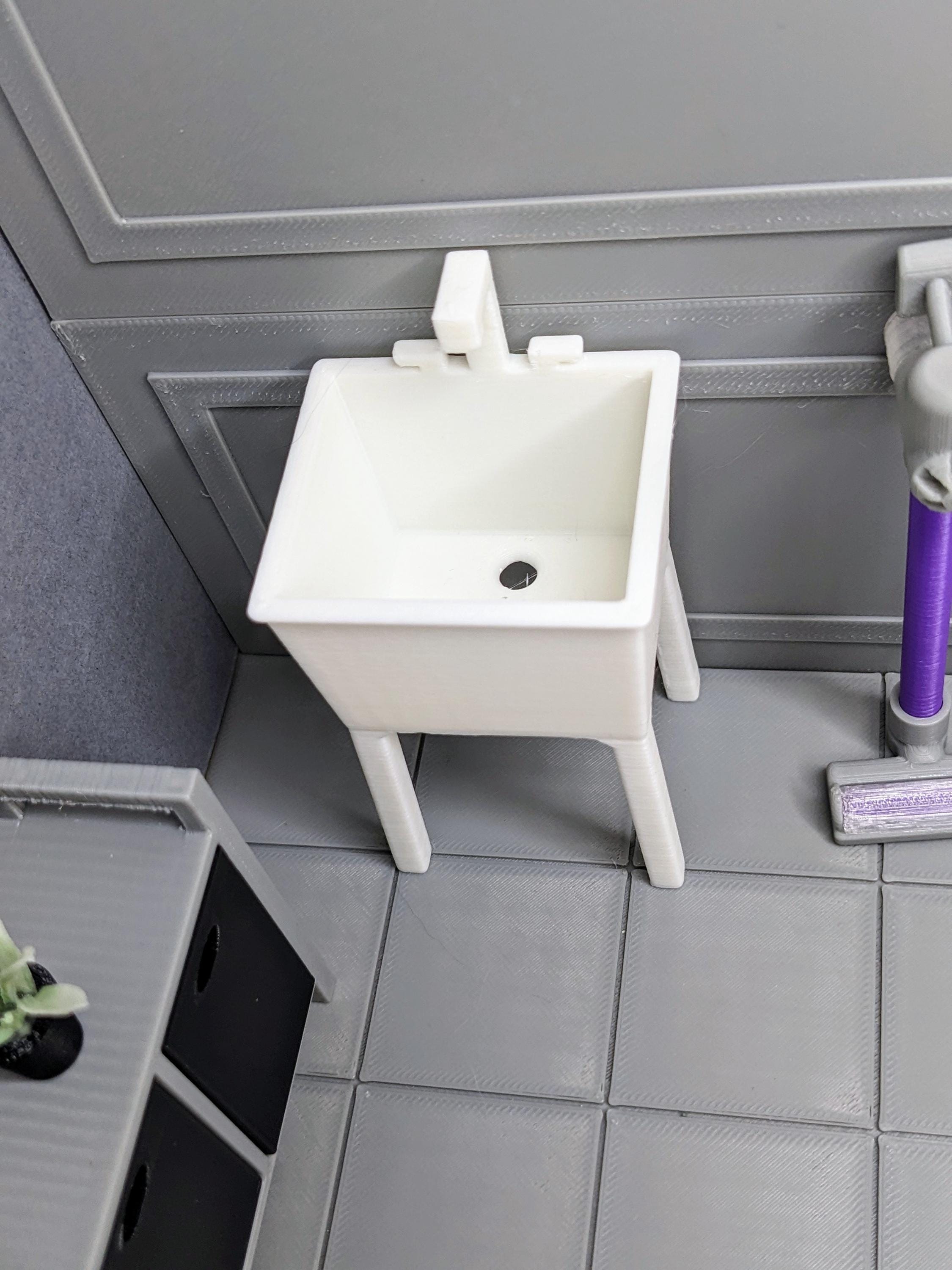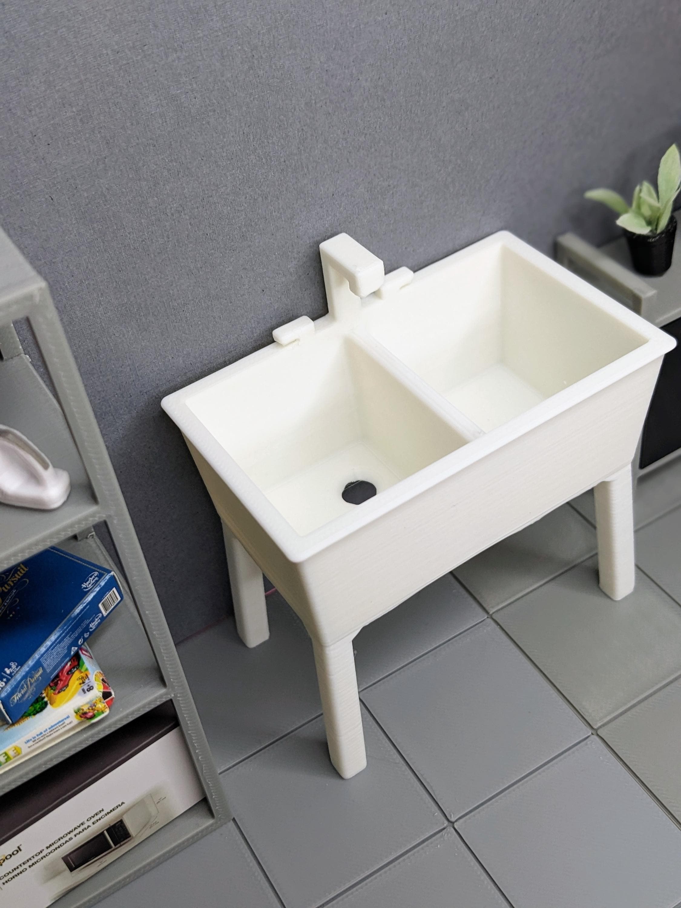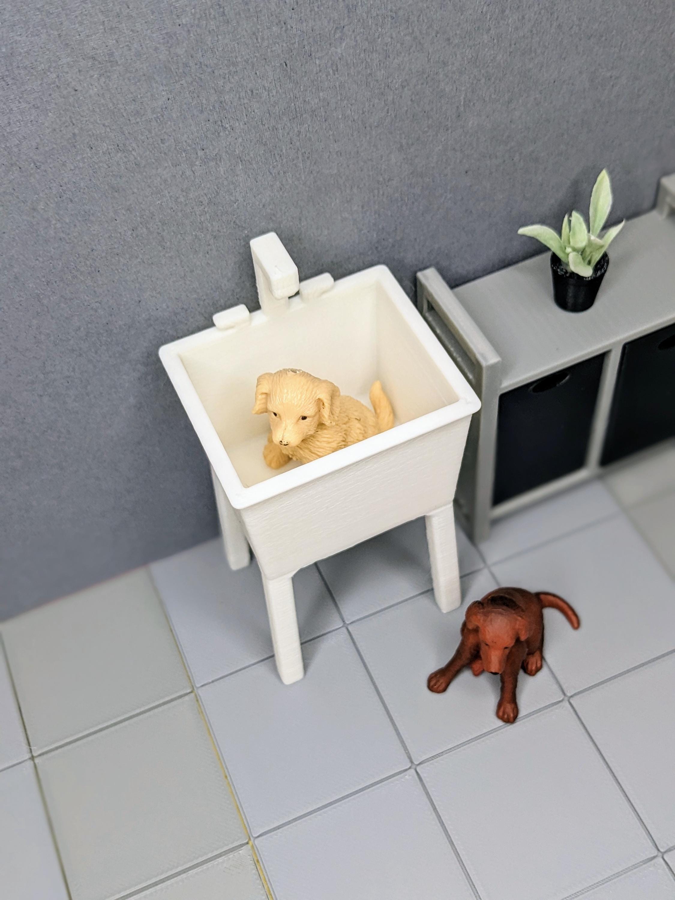 *Original Design!* A utility sink in 1:12 scale! Available as a single-basin sink or double-basin sink. This sink is super versatile and can be used many ways; it can be easily painted with acrylic paints to add scum, rust, or leave as is and fill with paint cups, brushes, or even use as a dog bath station! Ideal for your doll's laundry room, paint studio, dish pit, commercial kitchen, or warehouse diorama. This item is 3D printed with high quality PLA plastic. Not intended for rough play.