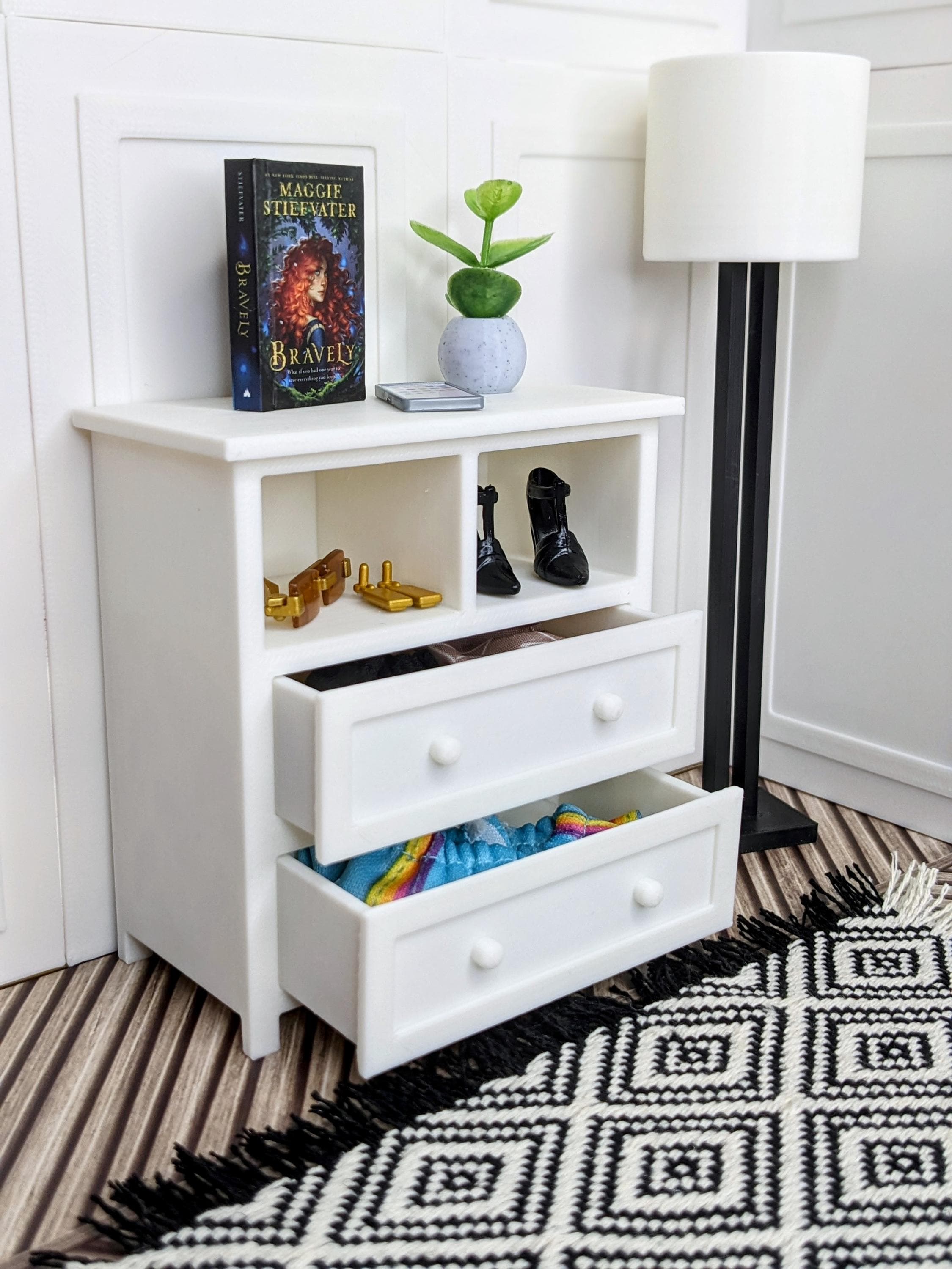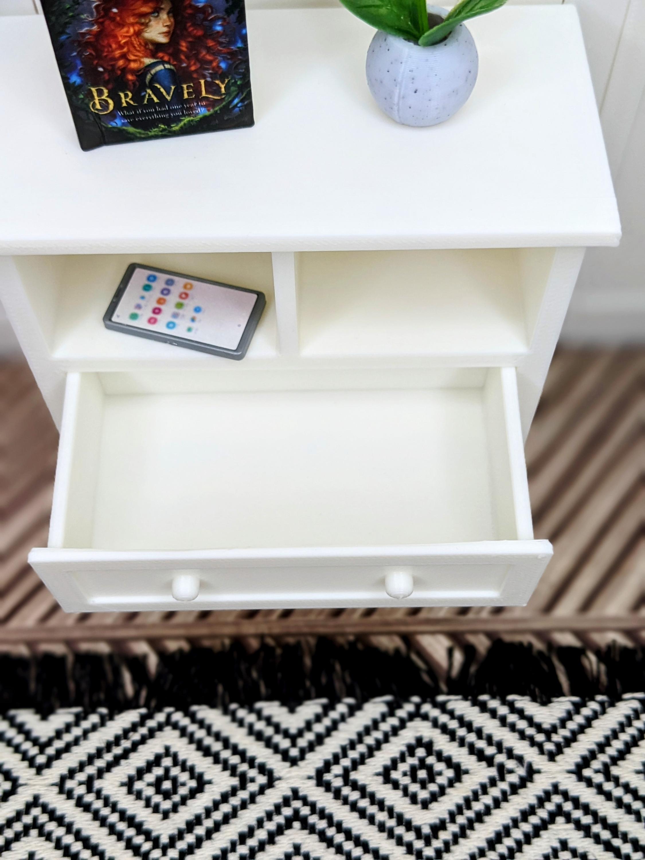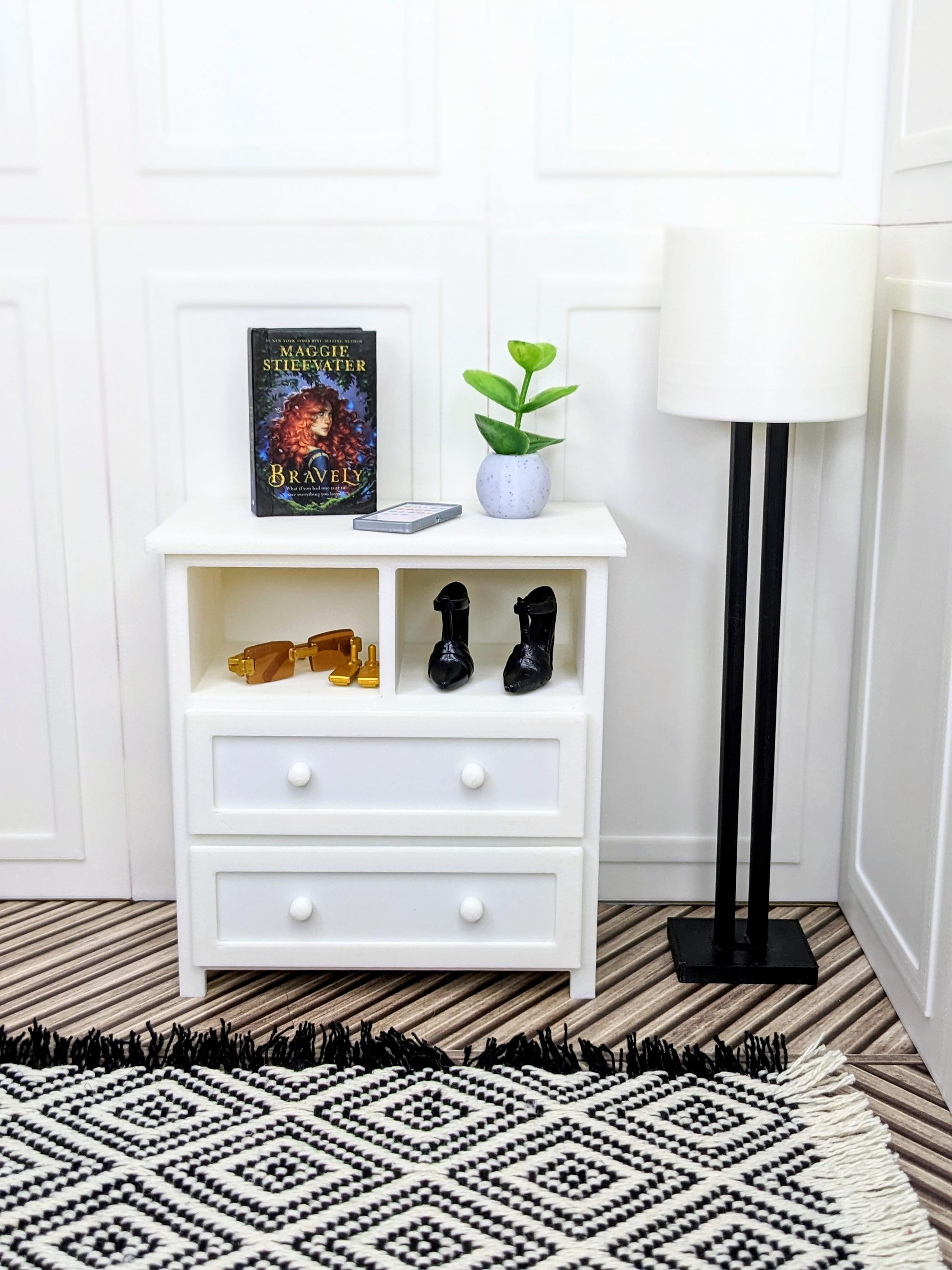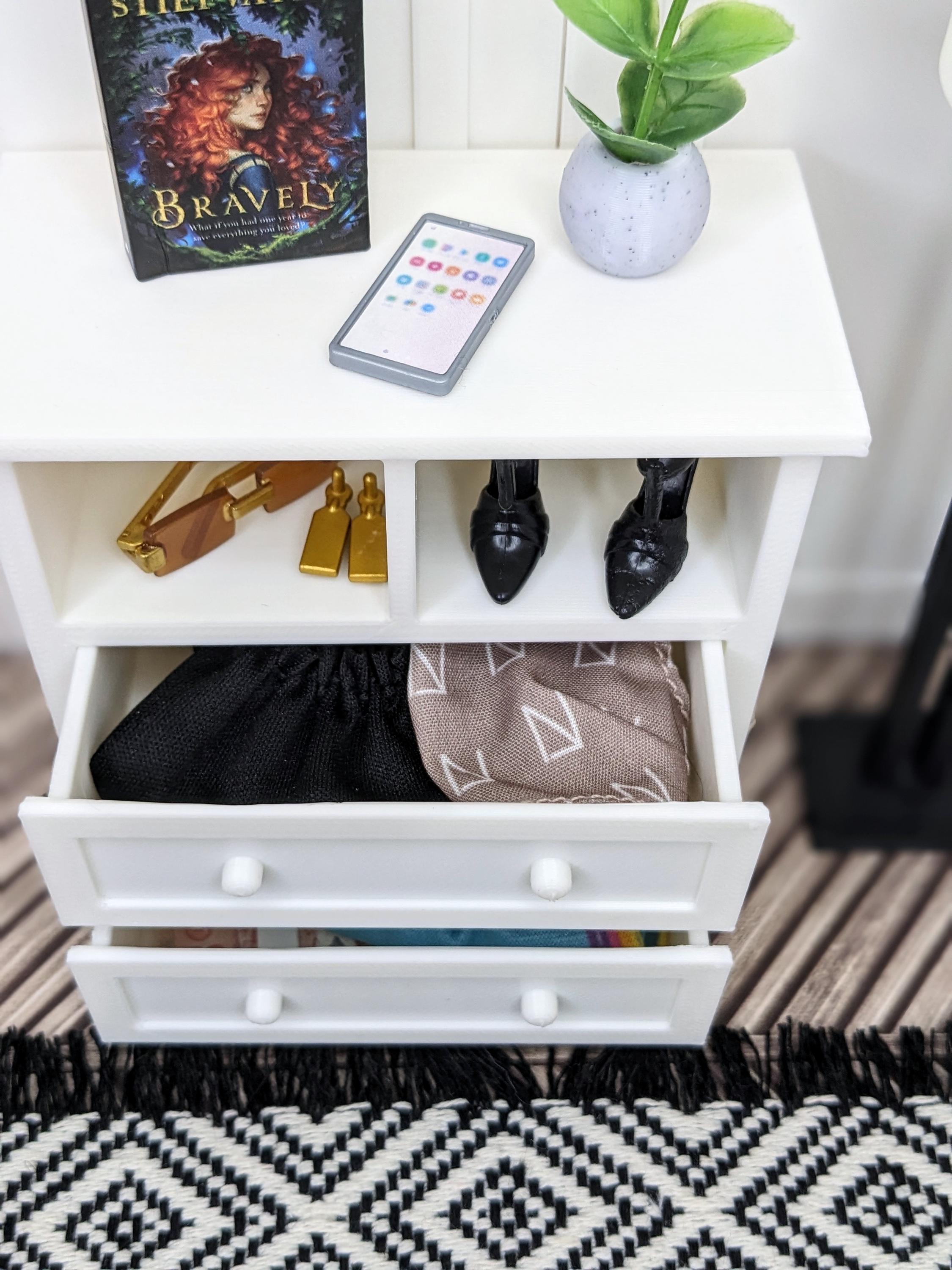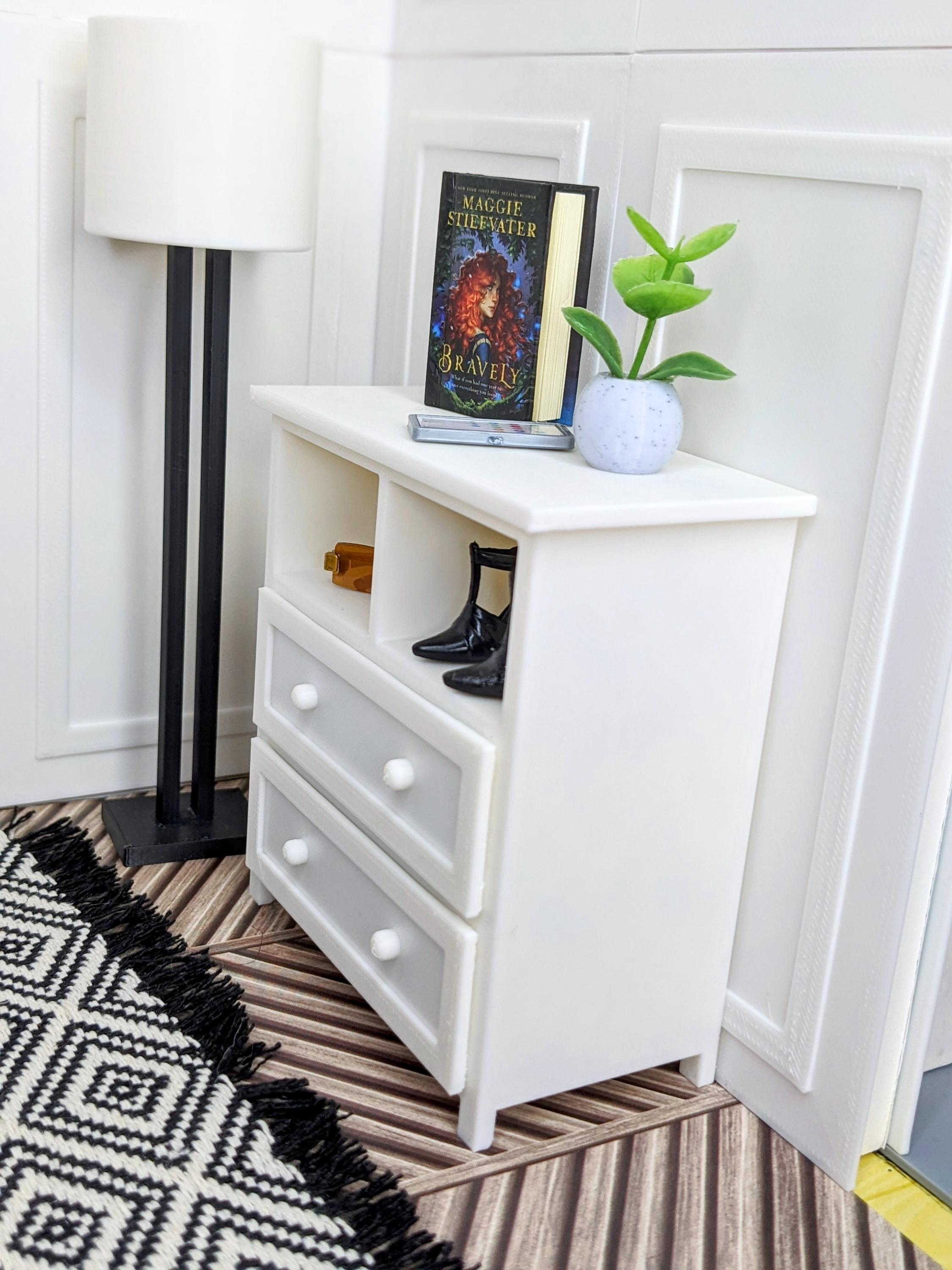 *Original Design!* A dresser in 1:12 scale! This dresser is perfect for any bedroom or baby's nursery. With two cubbies and two functional drawers, it can hold basic necessities, books, toys, and decor. Dresser only, other decor and accessories not included.