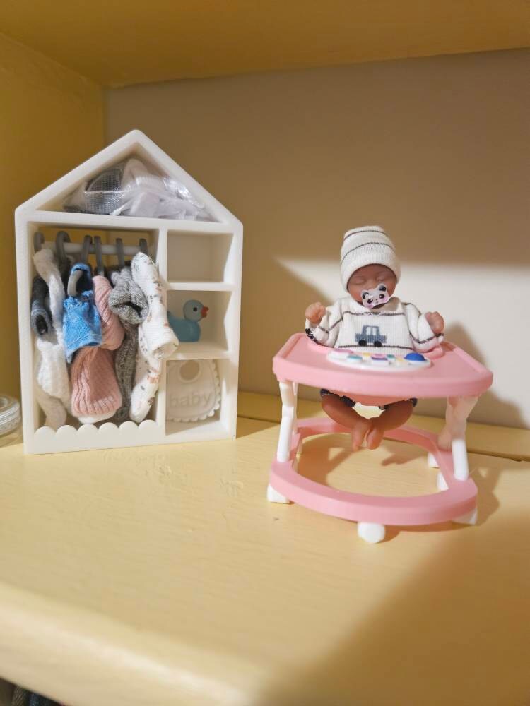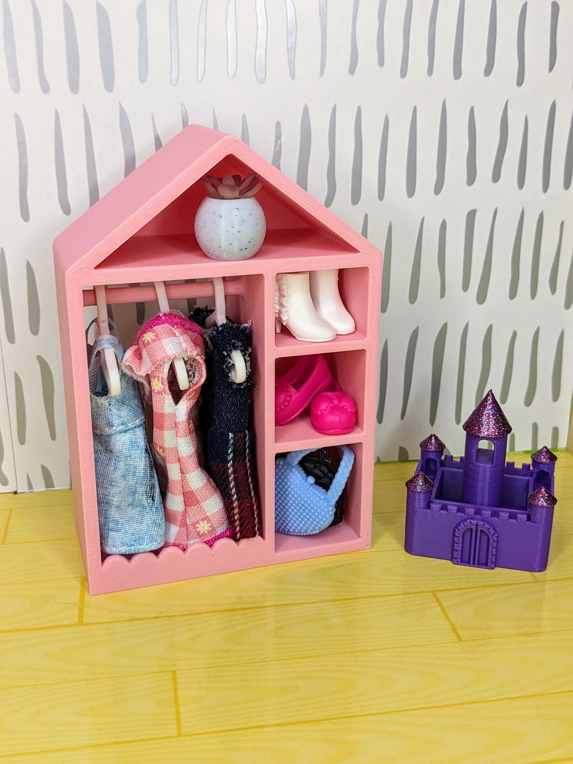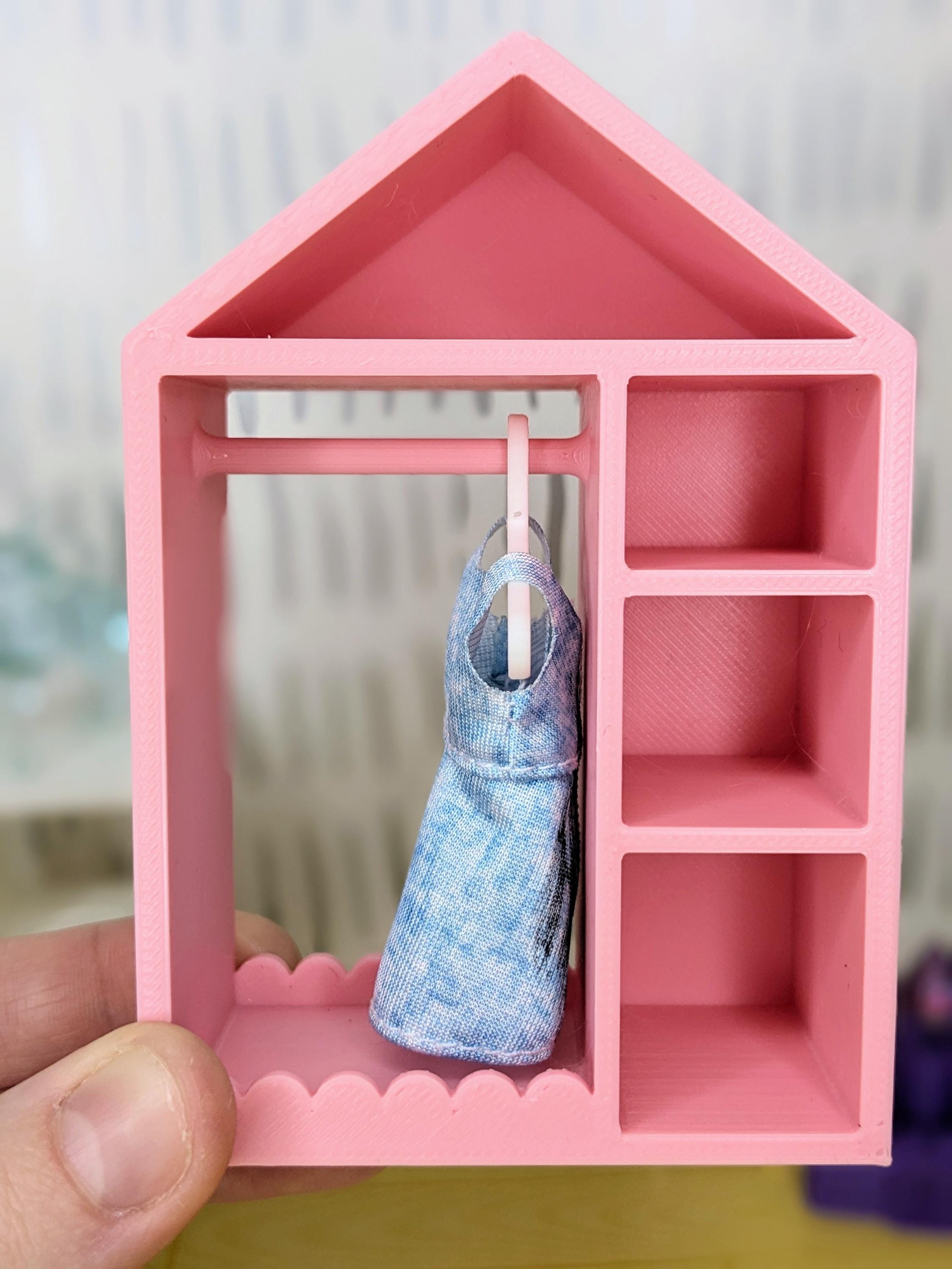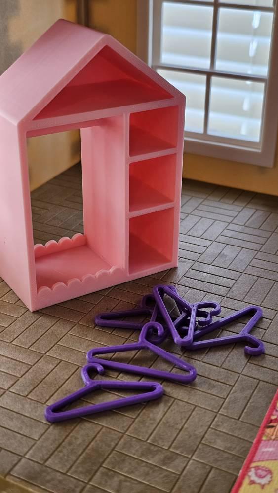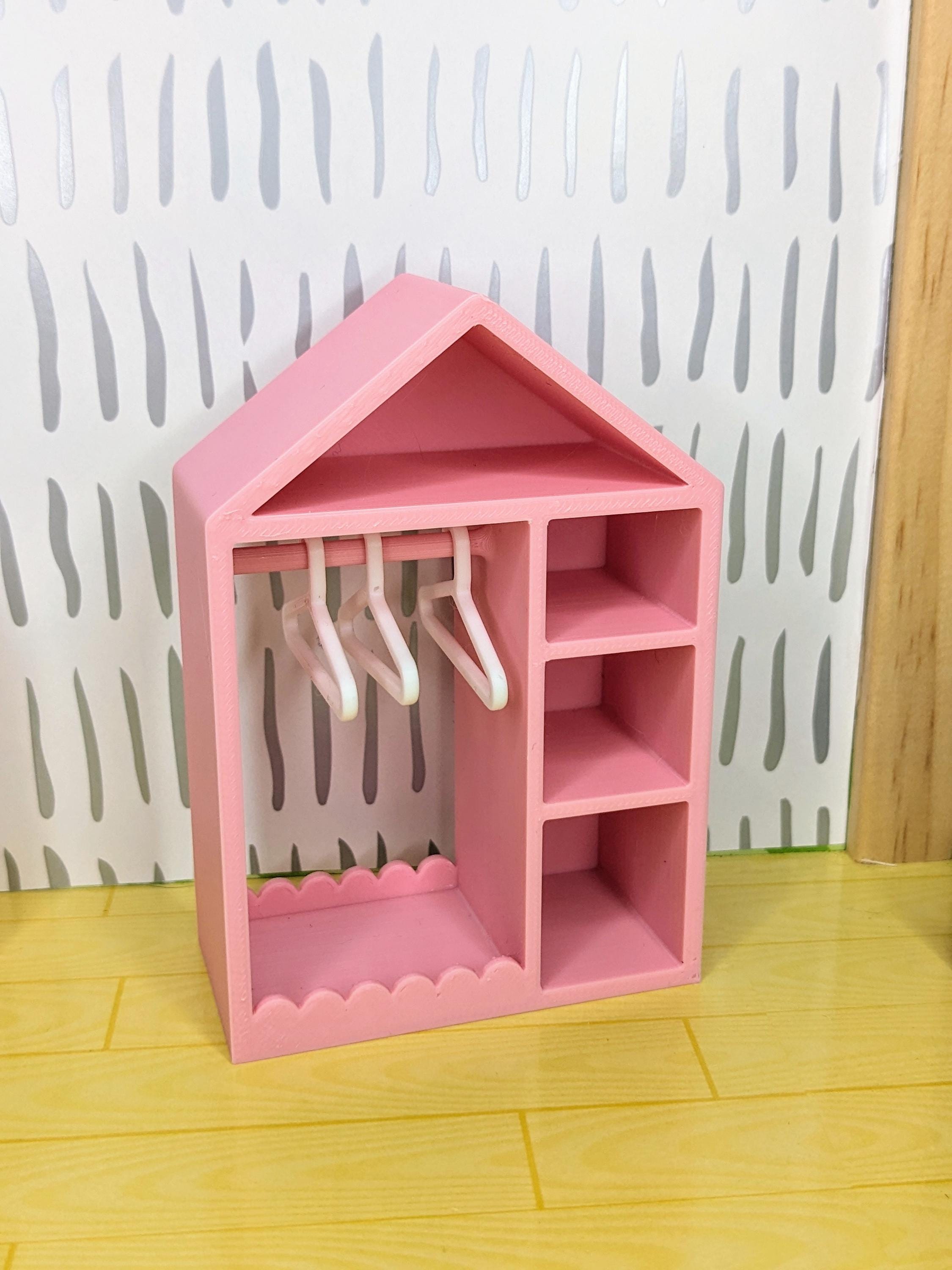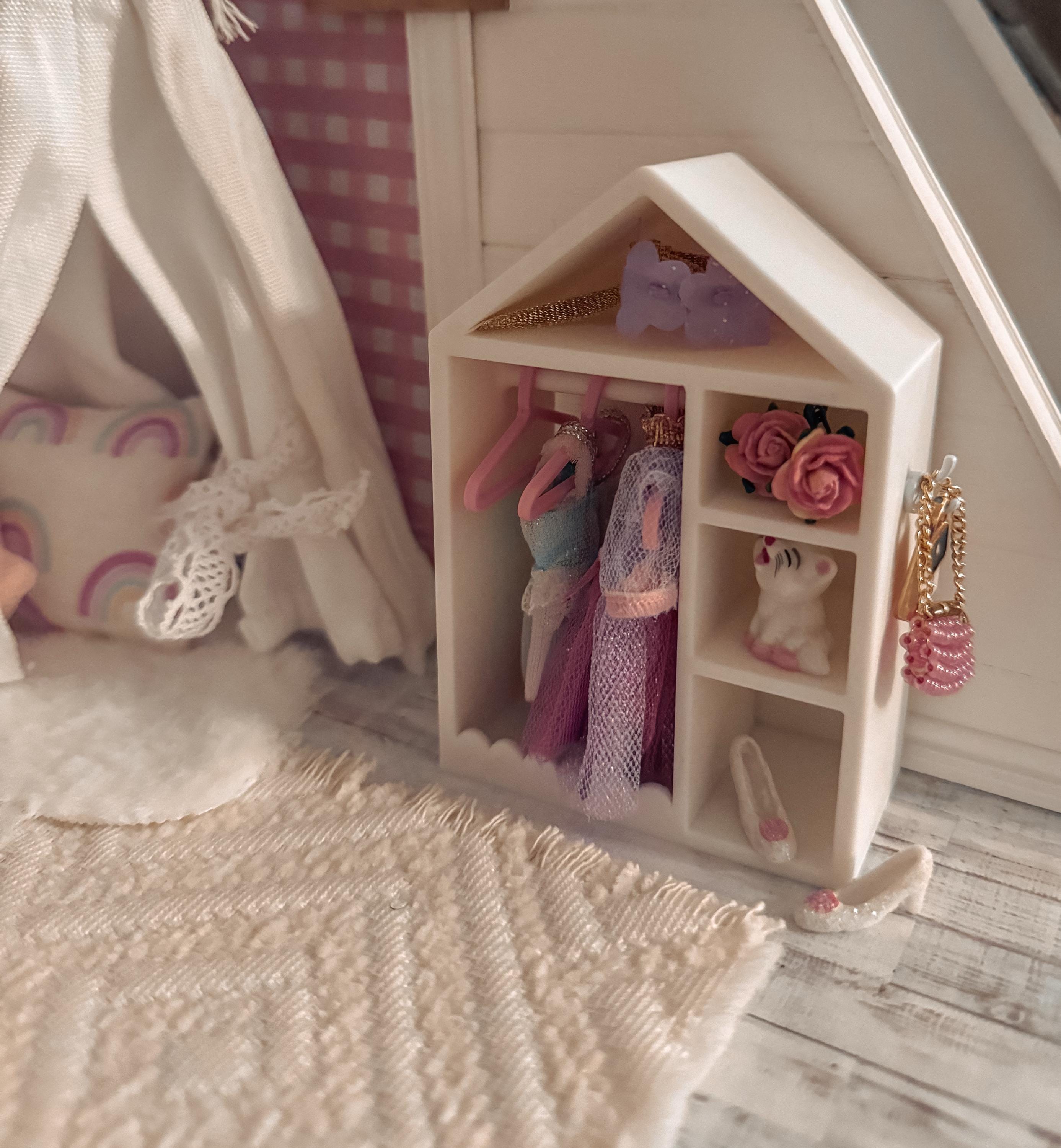 *Original Design!* A kids dress up closet in 1:12 scale! This tiny closet is 3D printed with high quality PLA plastic. It features 3 side cubbies for shoes, purses, hats; a clothing rack with 6 hangers; an upper cubby for toys or scarves; and a cute scalloped design. Ideal for your kids bedroom or playroom! Includes one closet and 6 hangers, other decor and accessories not included. Colors customizable. * For reference, the clothes I have pictured measure 1" wide by 2" long.