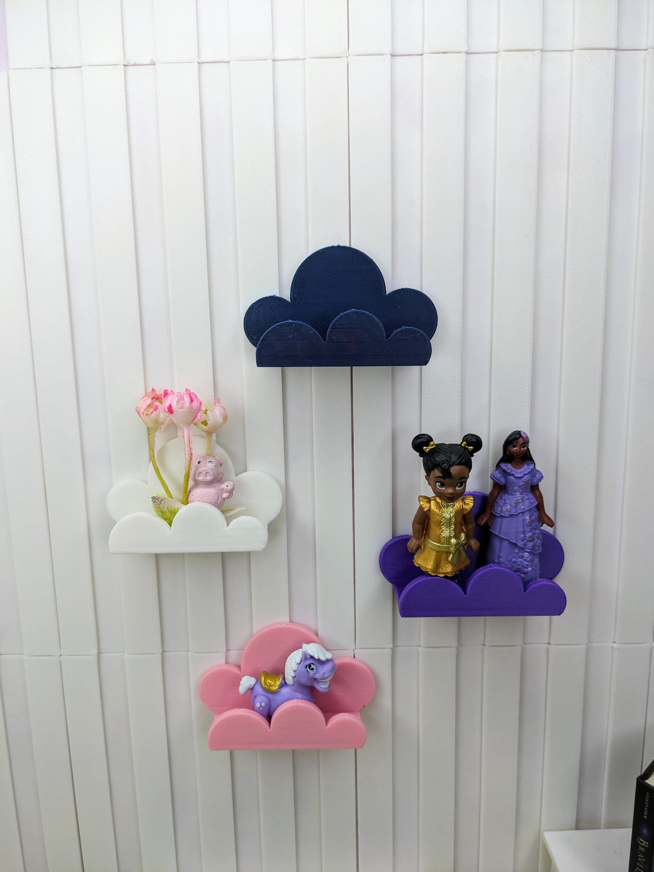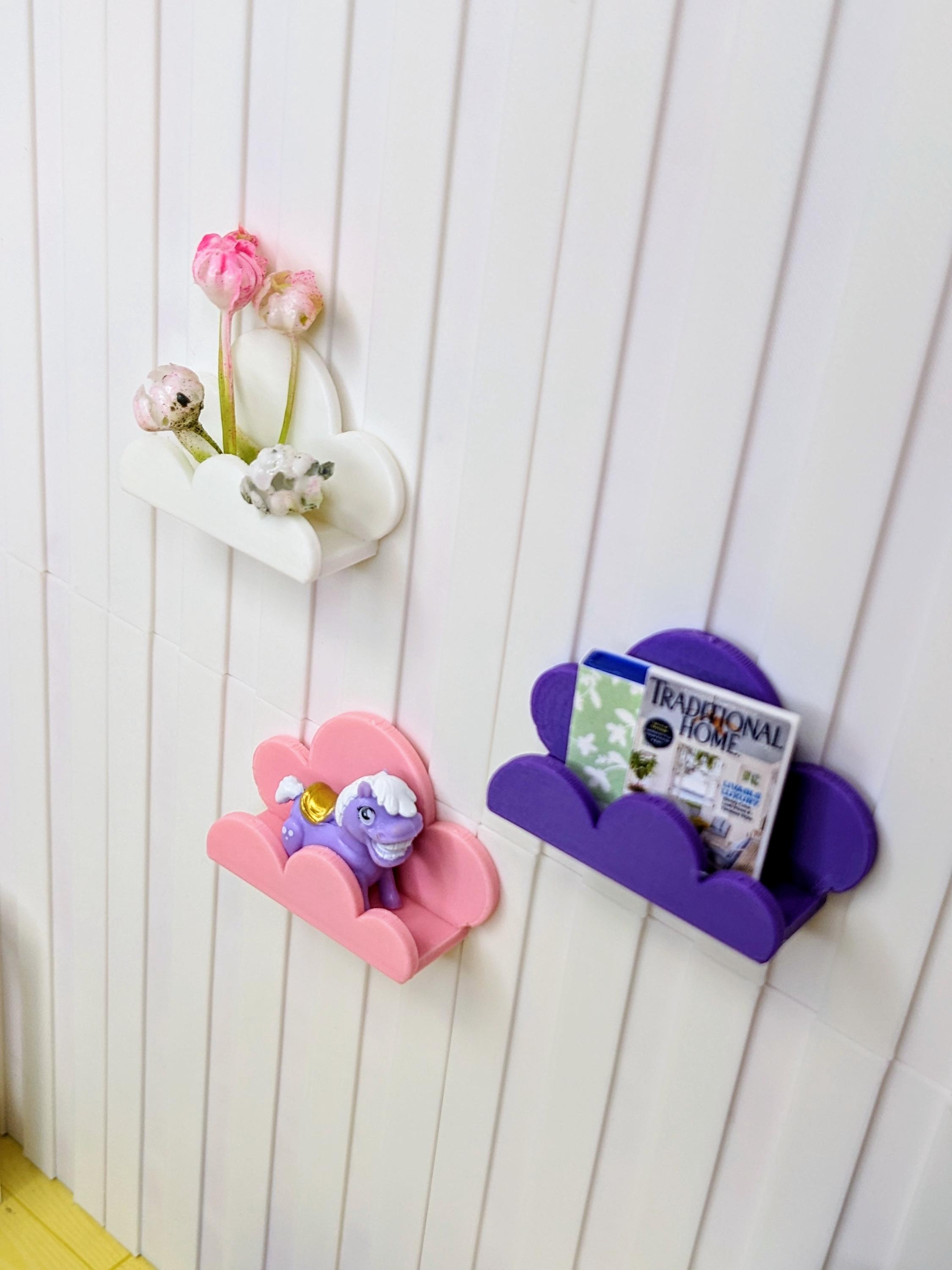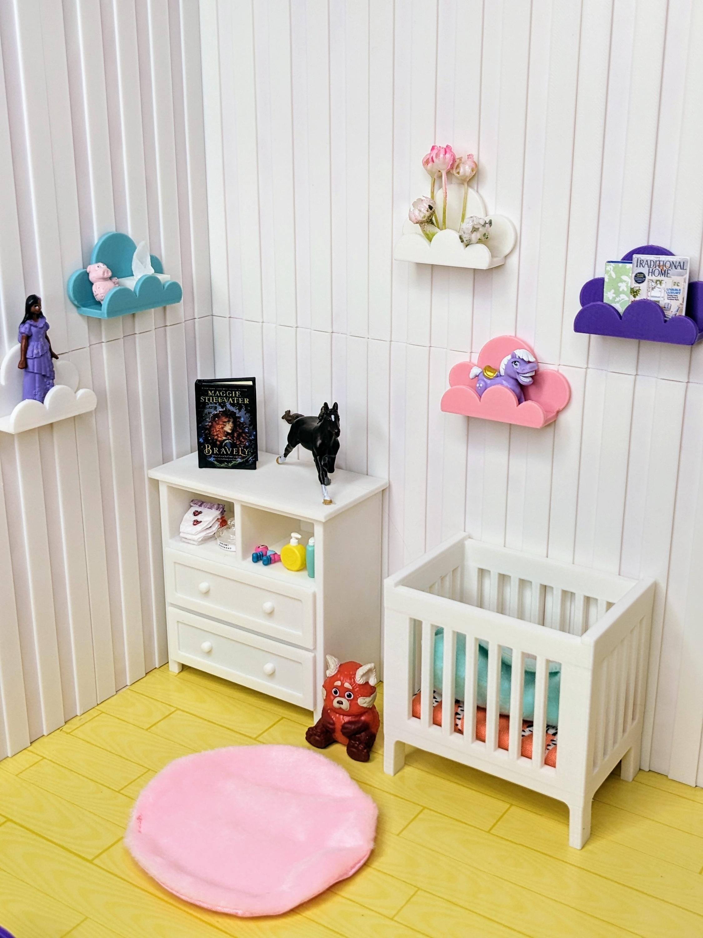 *Original Design!* A trio of cute cloud shelves in 1:12 scale! You will receive 3 shelves. These easily attach to walls via glue dots, museum wax, etc. Perfect for holding books, toys, and other small decor items. These shelves are 3D printed with high quality PLA plastic. Choose your desired set color, or choose "custom" for multiple colors.