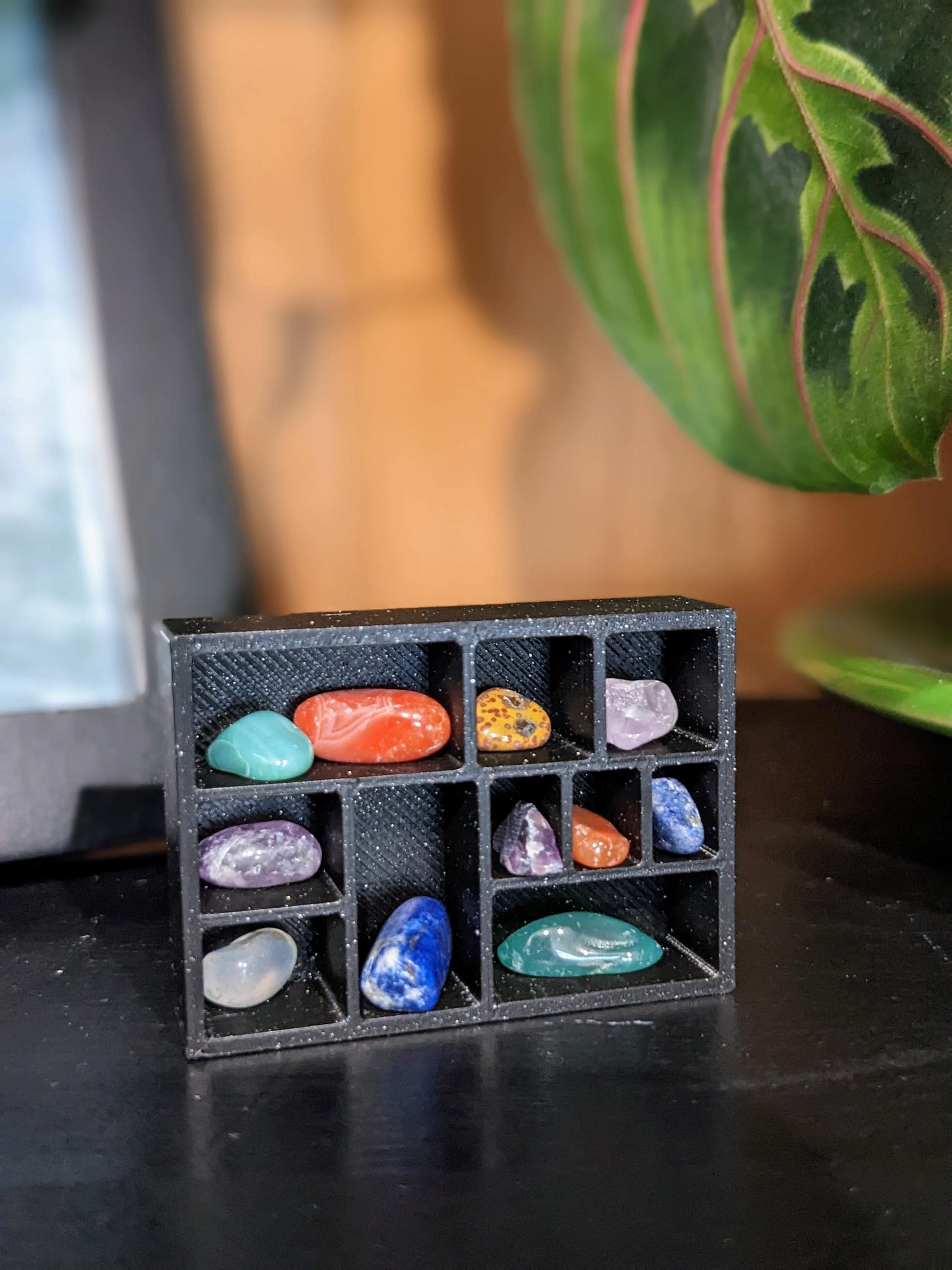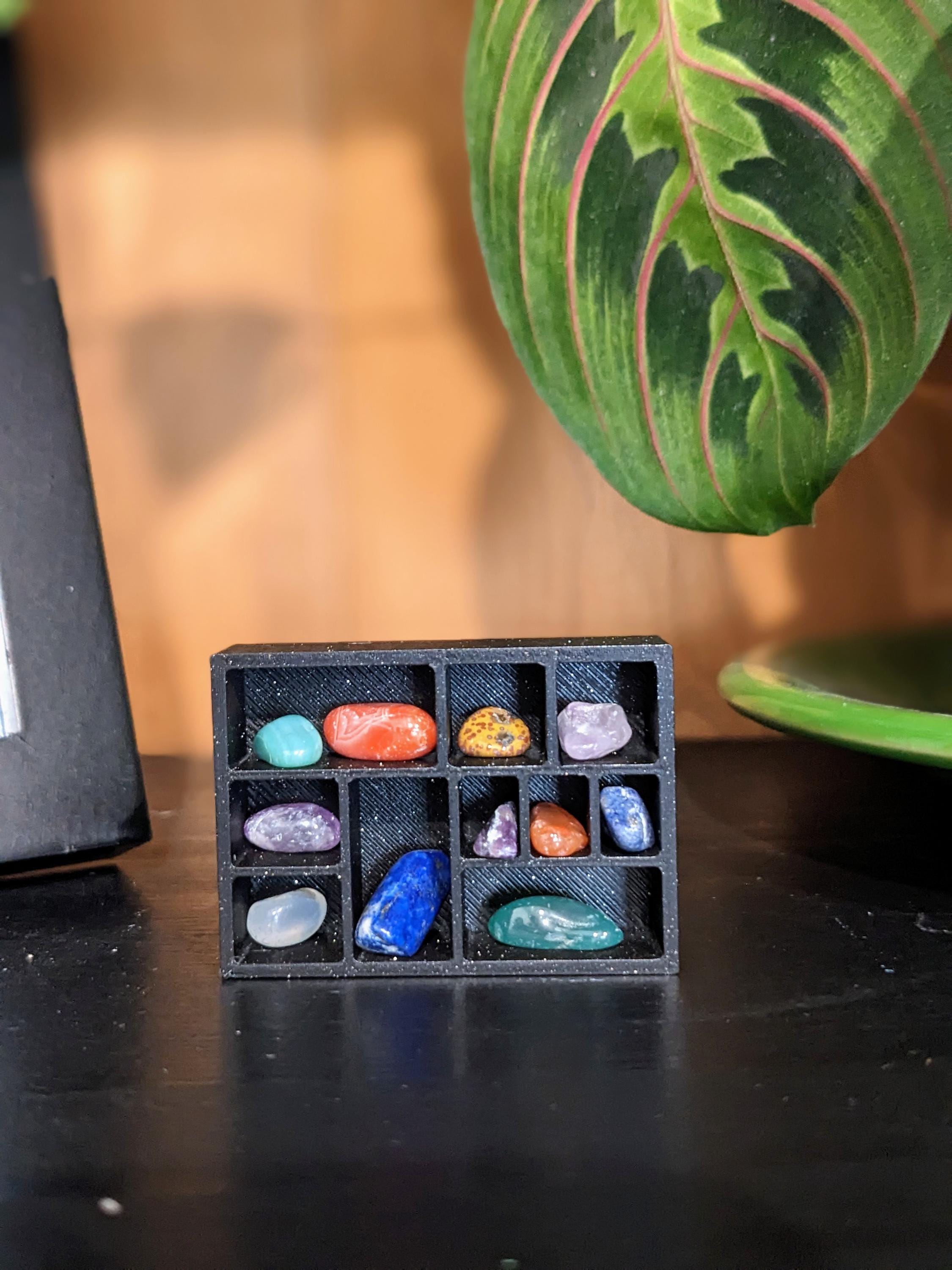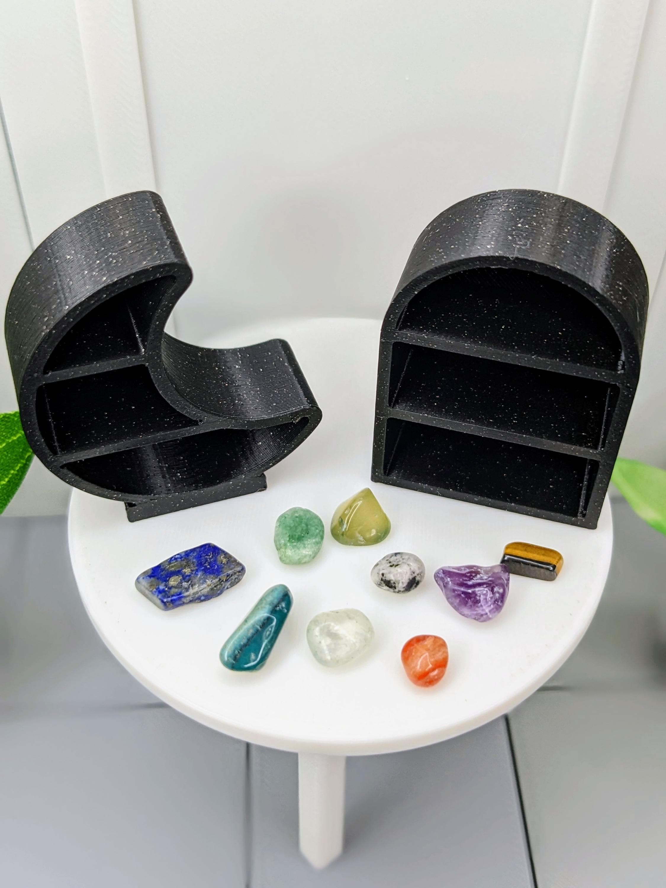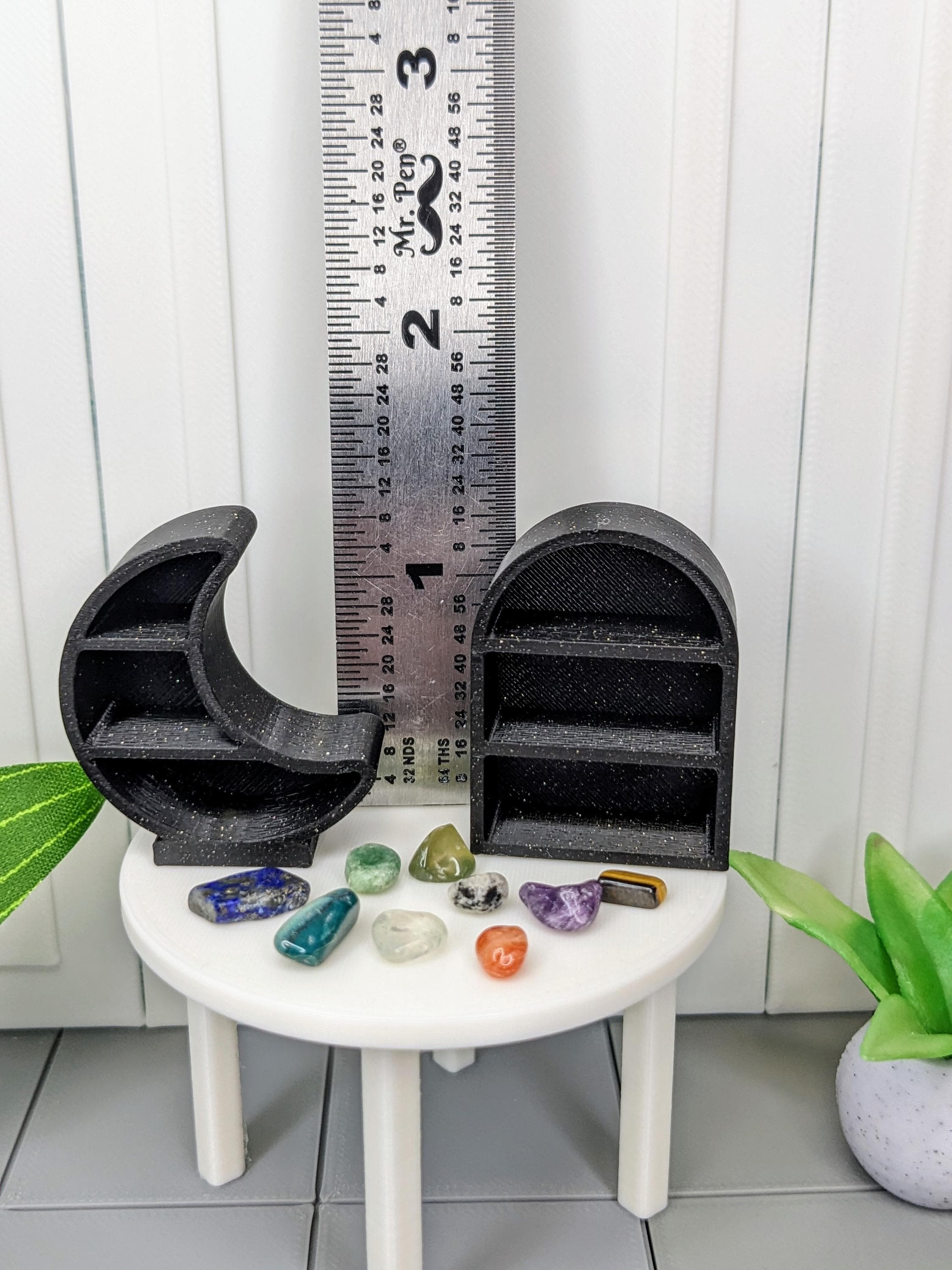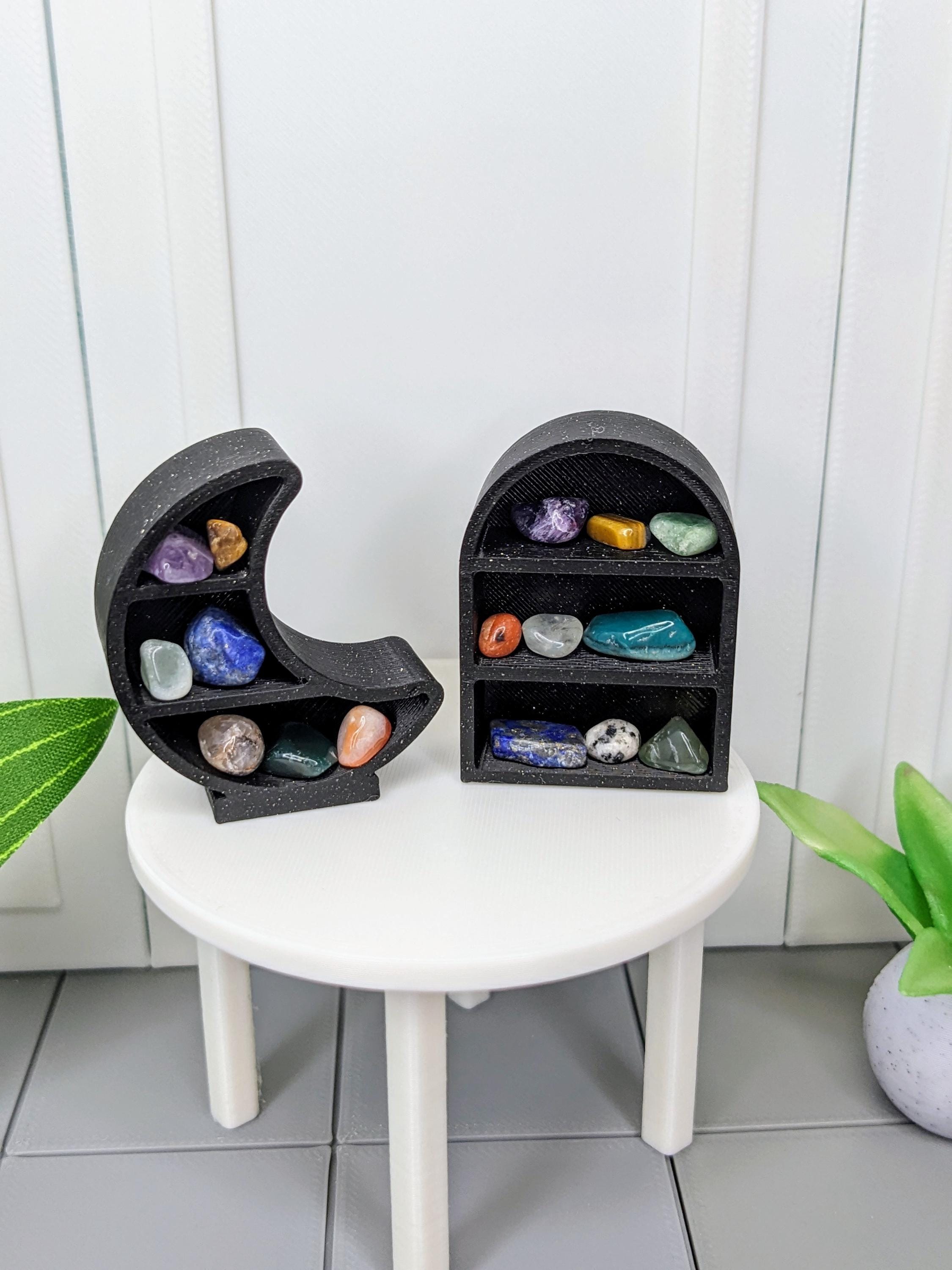 *DIY Item!* A DIY crystal decor shelf in 1:12 scale! These crystal shelves are 3D printed with high quality PLA plastic in a glitter black color. Includes 1 shelf and 10 random tiny crystals, ranging in color from red, blue, green, purple, white, black, etc. Crystals will vary in color, shape, and size. These shelves can be displayed on top of a cabinet or desk, or can be mounted to the wall via museum wax or strong glue.