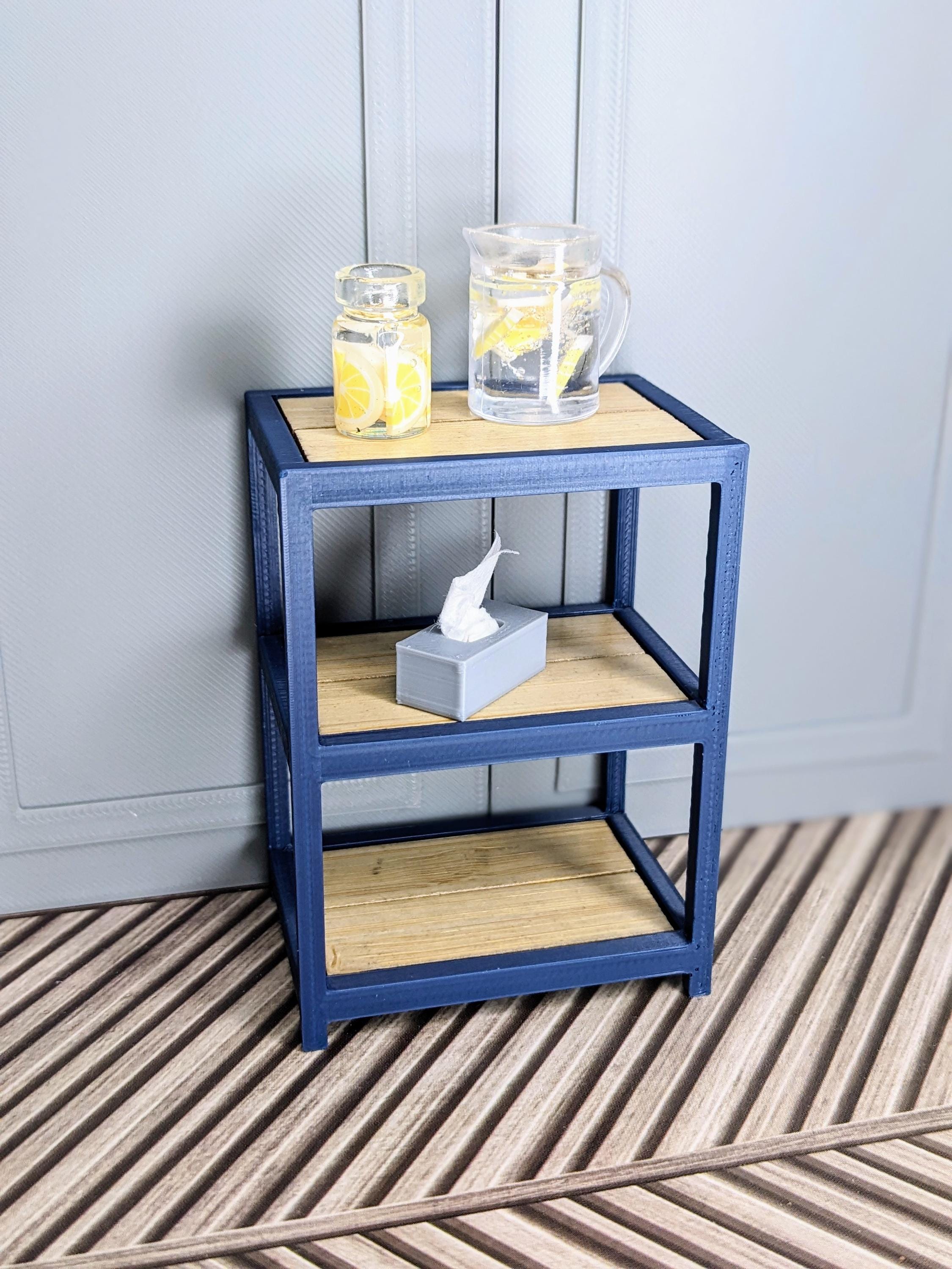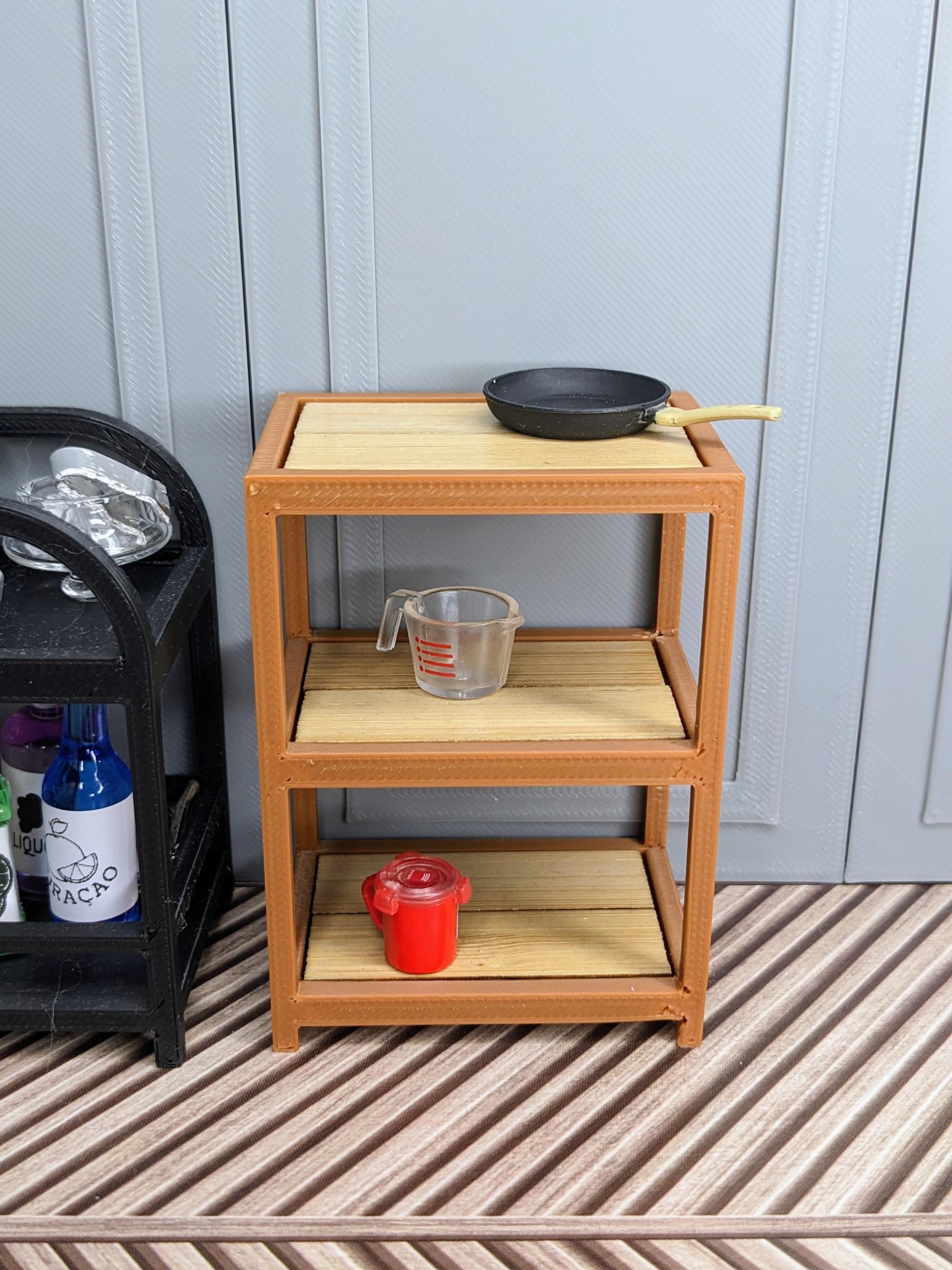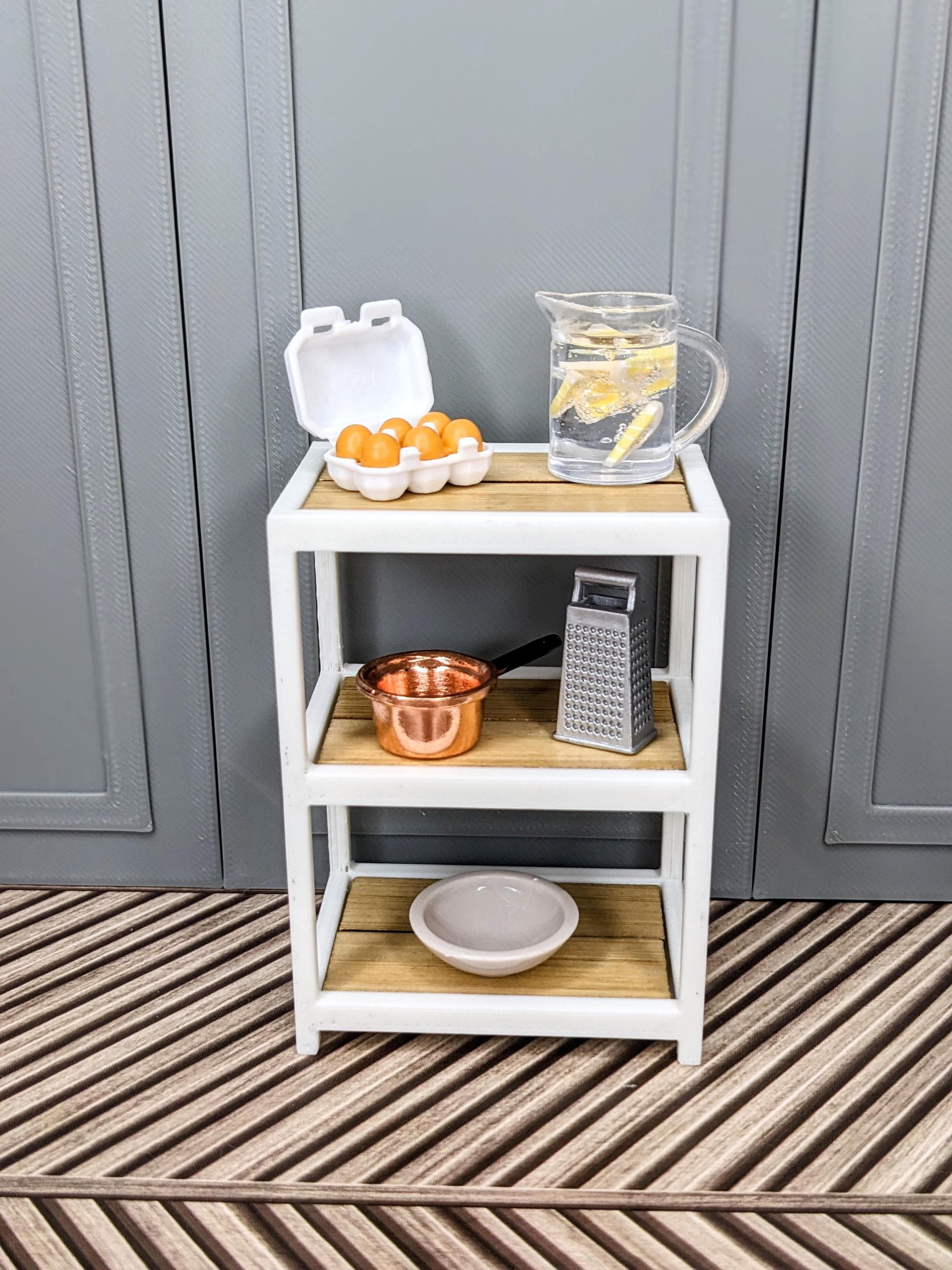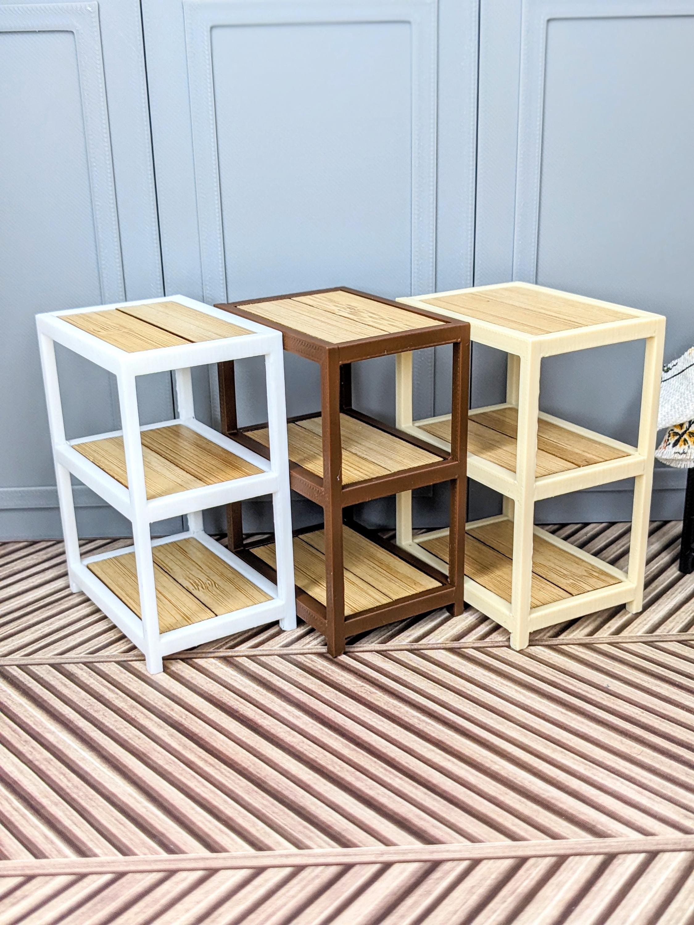 *Original Design! A multipurpose shelf in 1:12 scale! Ideal for organizing your kitchen, craft supplies, plant pots, laundry supplies, etc! This item is 3D printed with high quality PLA plastic with wood tiles inserts. It is countertop height, so it would make a perfect kitchen island.