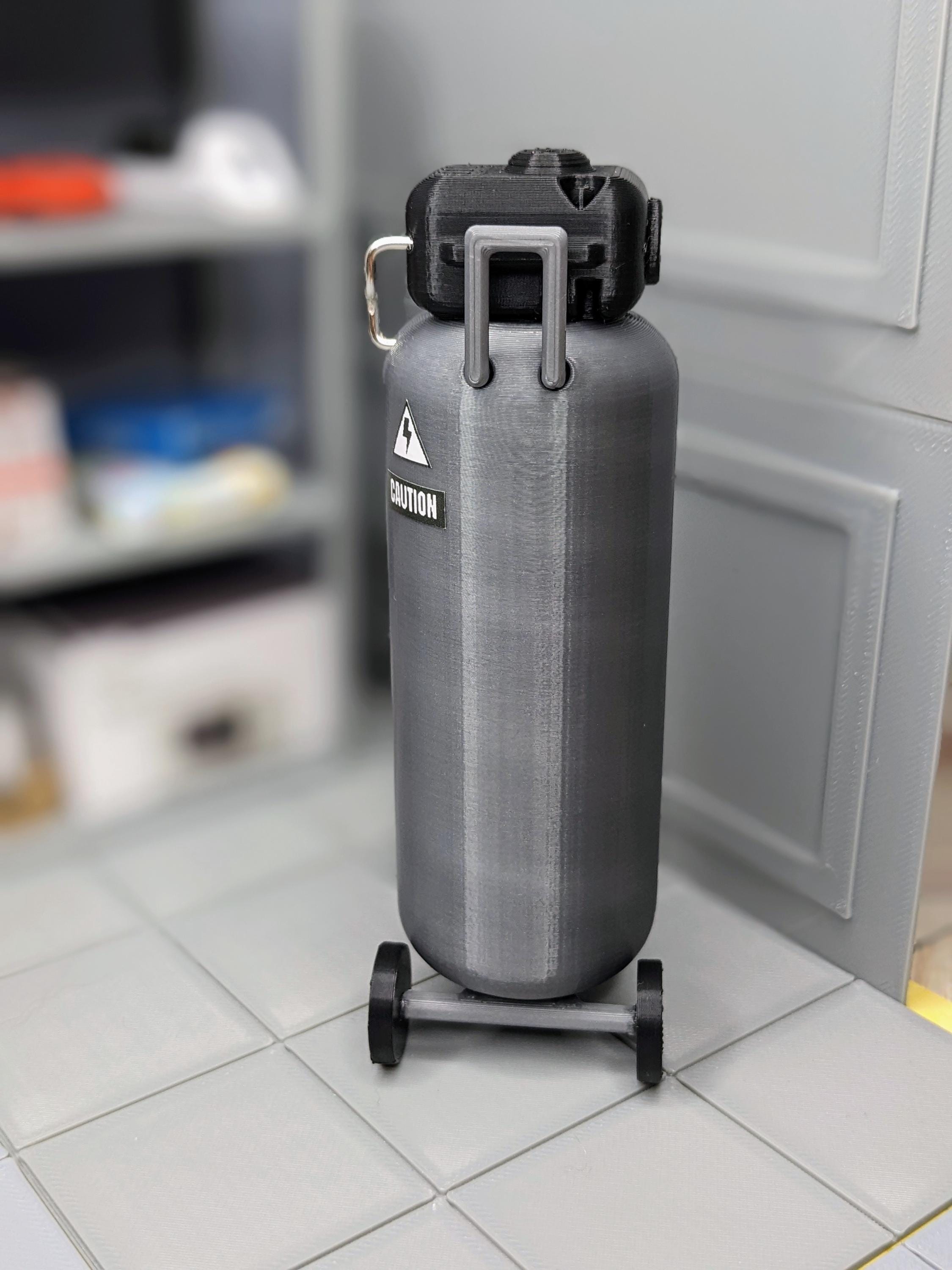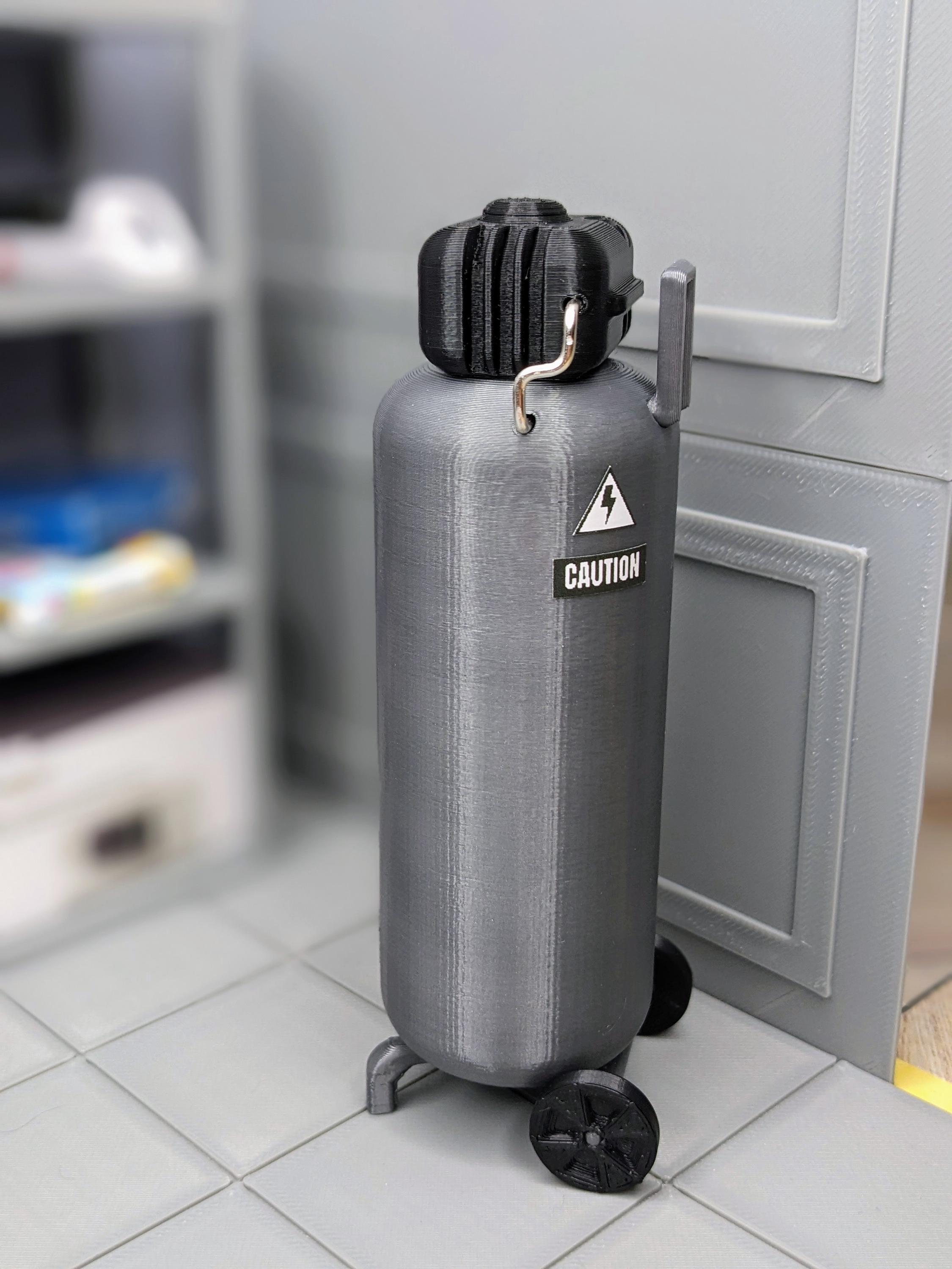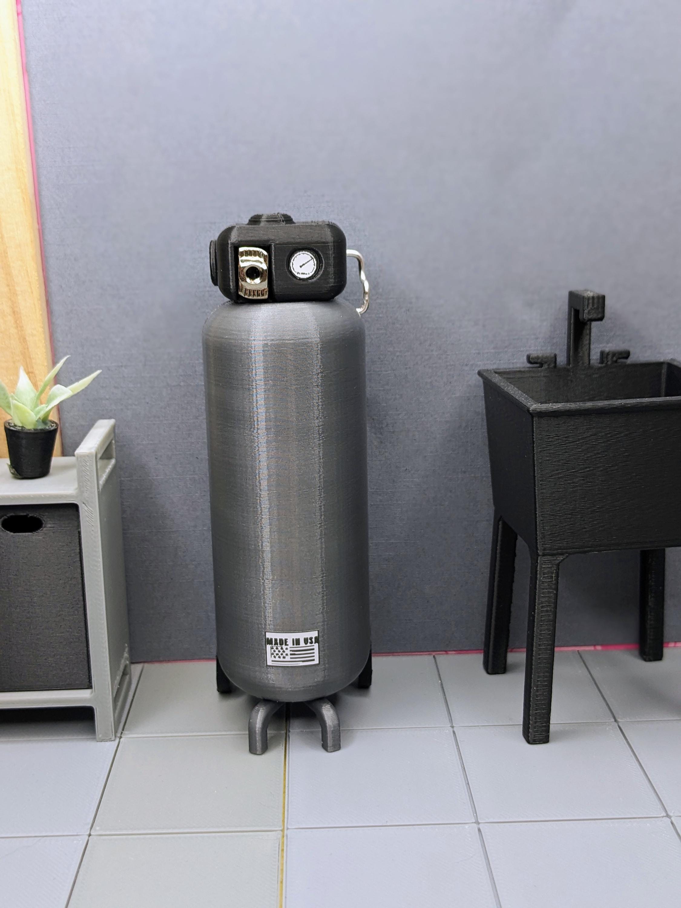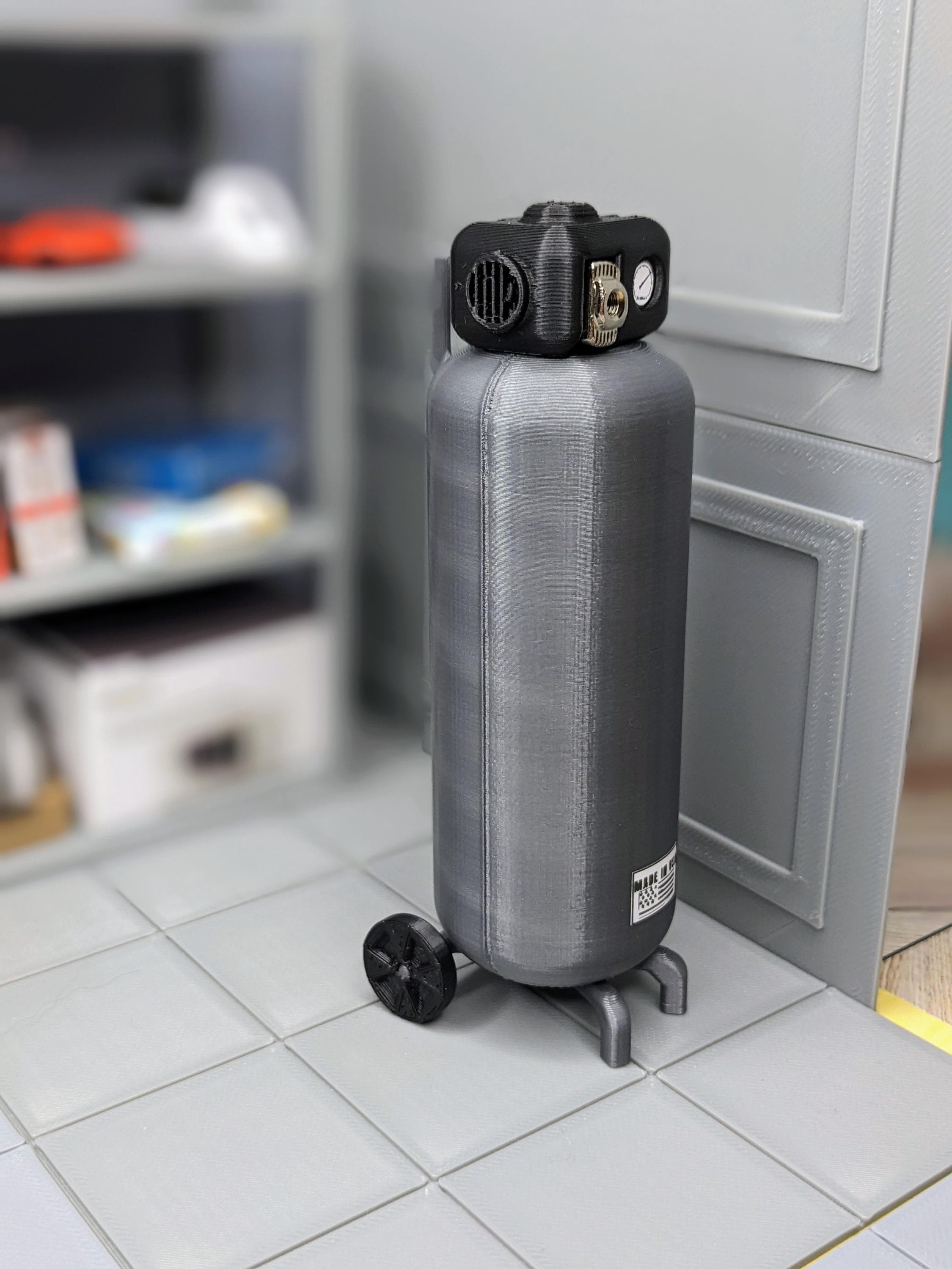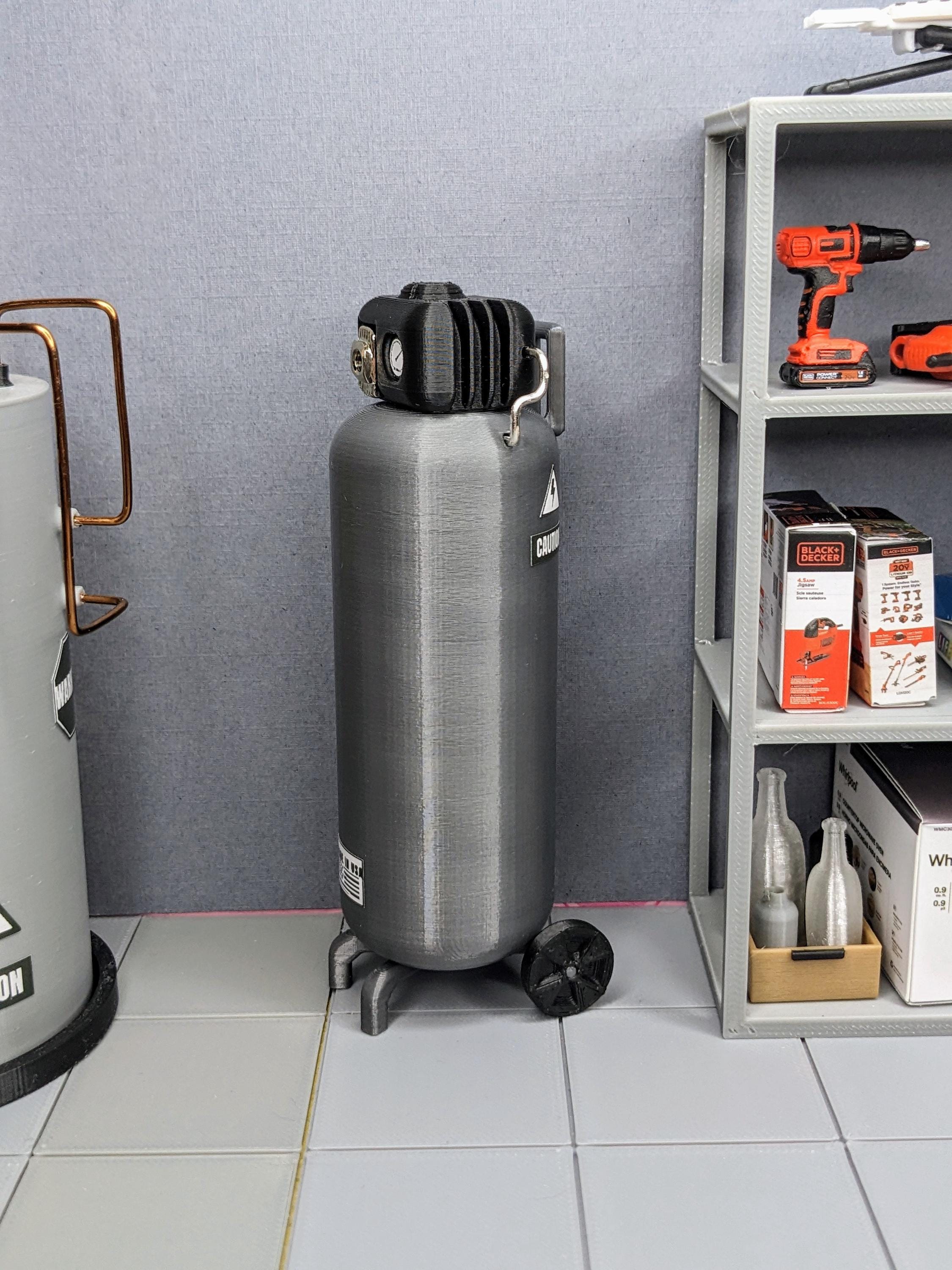*Original Design!* A vertical air compressor in 1:12 scale! Perfect for your dolls garage, workshop, or machine shop diorama. This item is 3D printed with high quality PLA plastic, assembled with multiple pieces in dark metallic grey and black, with metal accents. This item does not move or rotate, the wheels do not turn. Not intended for rough play.