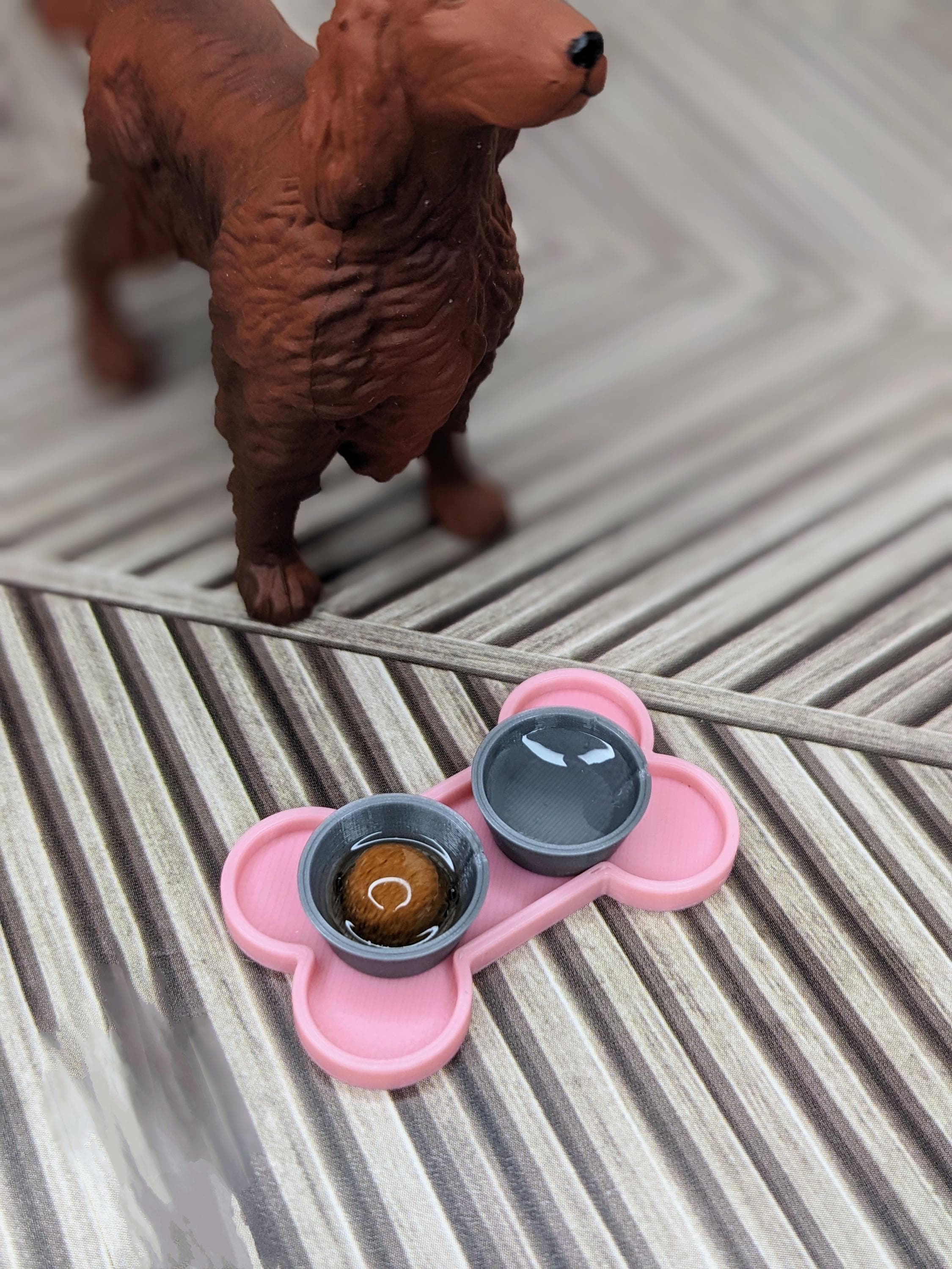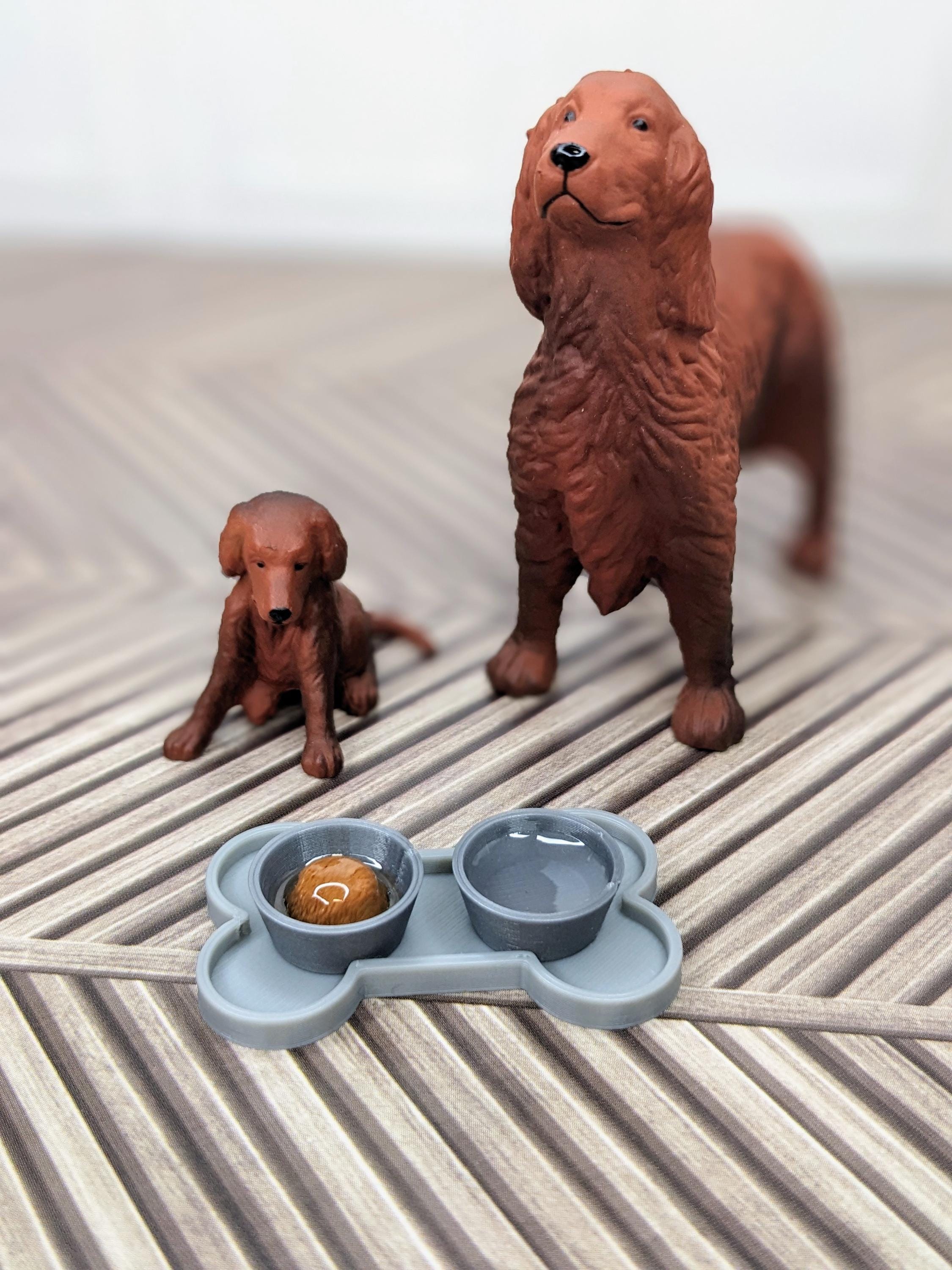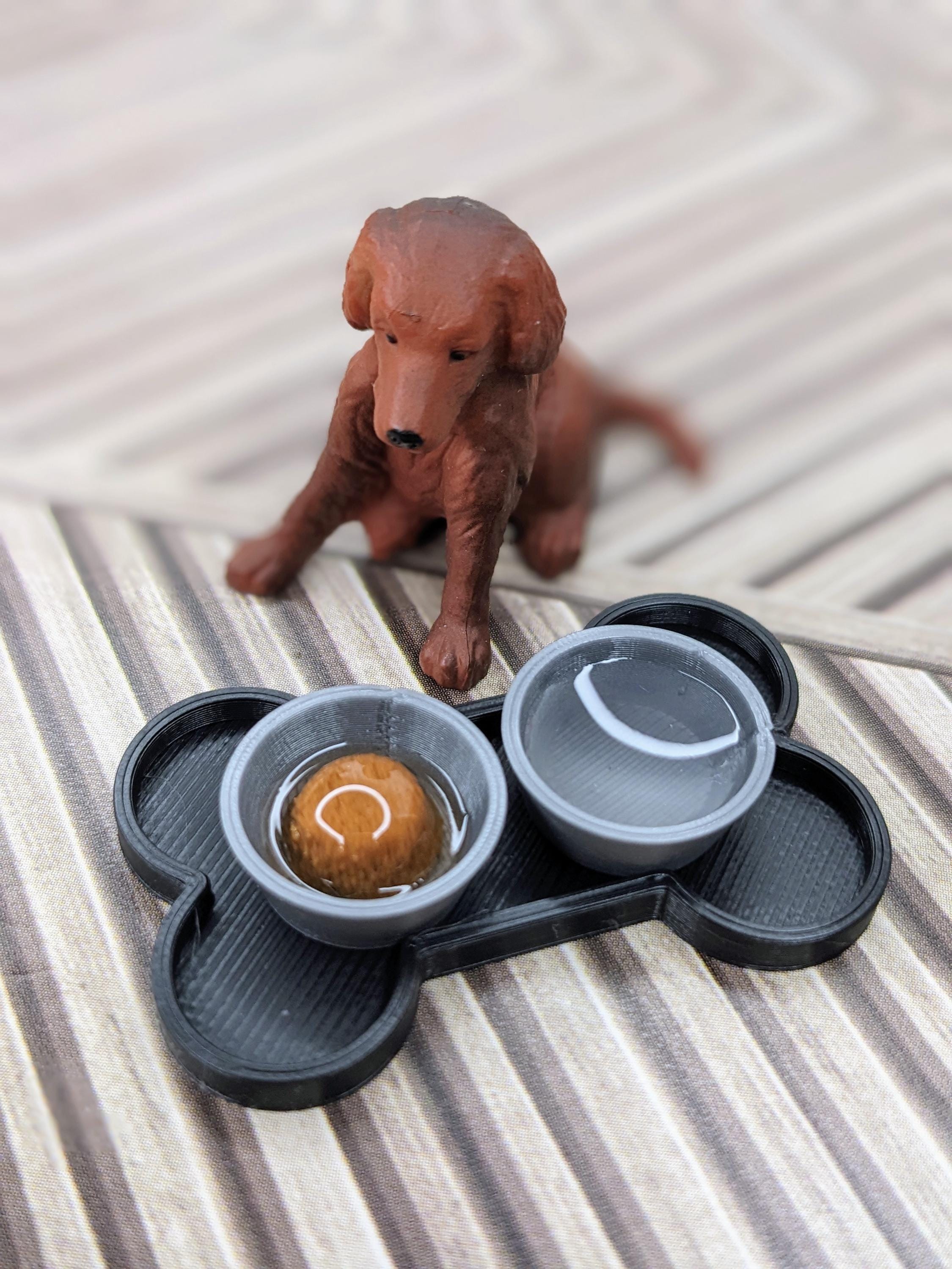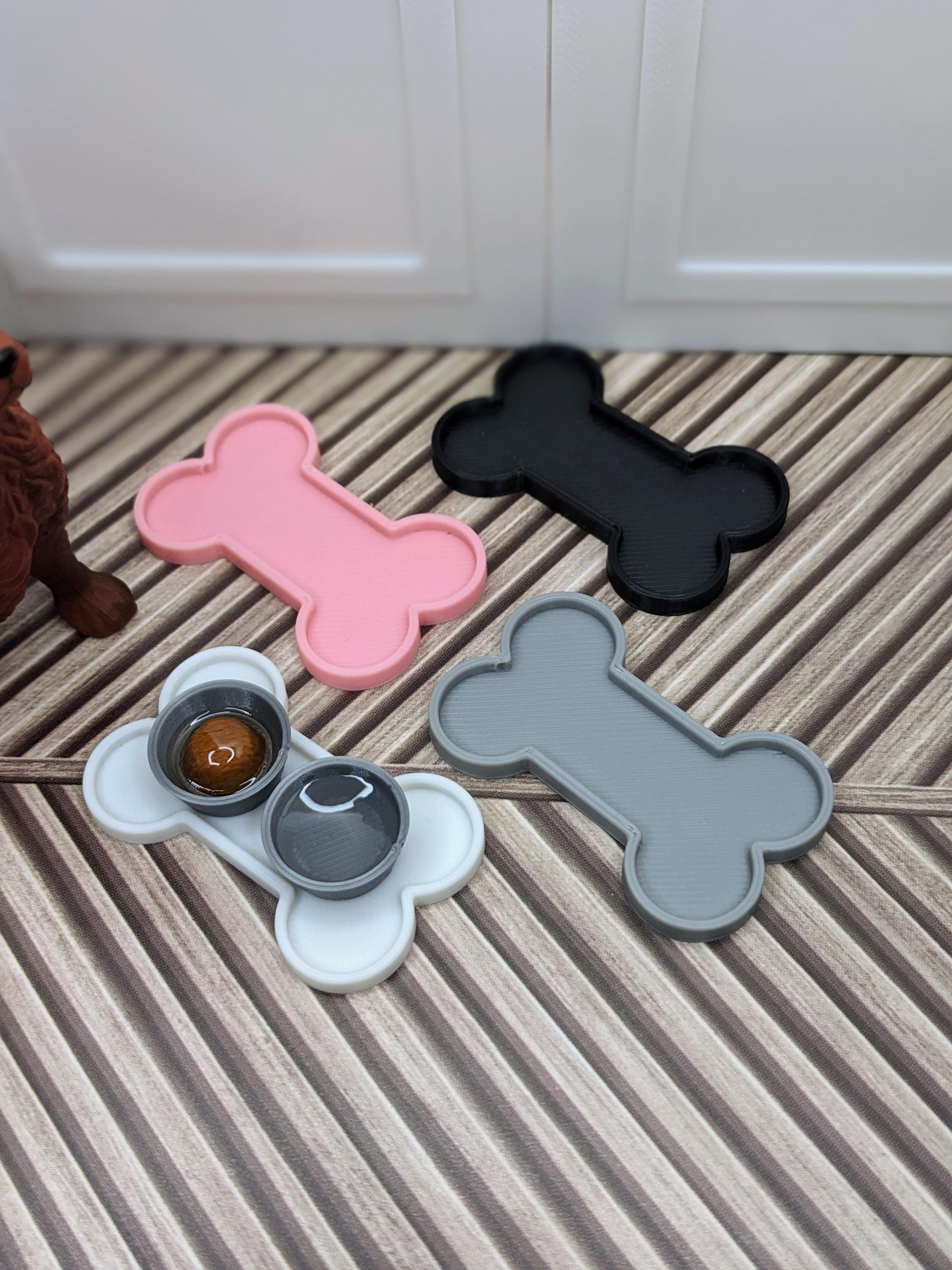 *Original Design!* A 3 piece dog food set in 1:12 scale! This set is 3D printed with high quality PLA plastic. The bowls feature clear resin water and a brown paté puck covered in caramel colored resin, with a bone-shaped mat. The mat is customizable in color! The bowls are a metallic grey. Please note, I do my best to eliminate resin bubbles during the process, but small bubbles may be present in the final product.