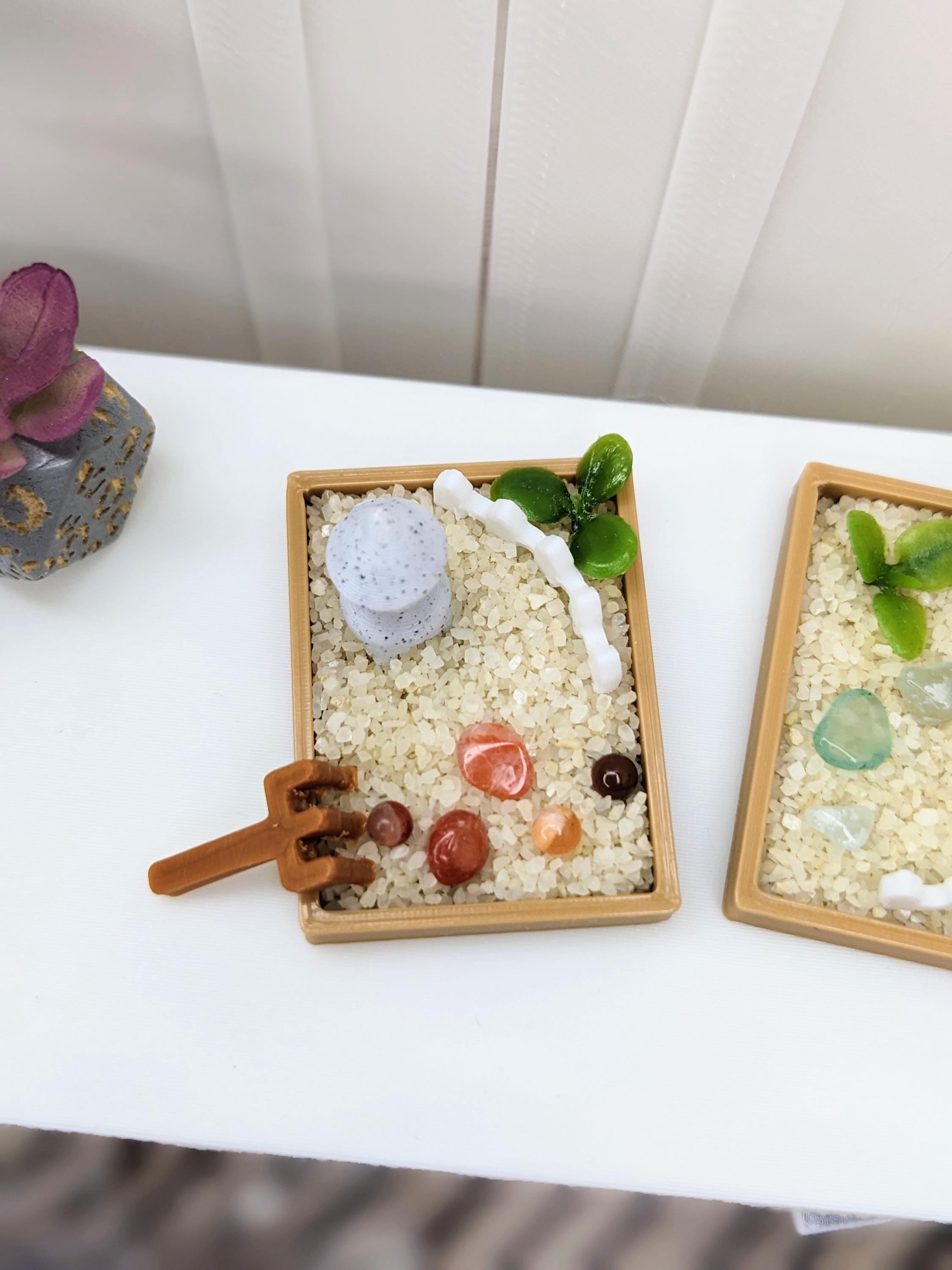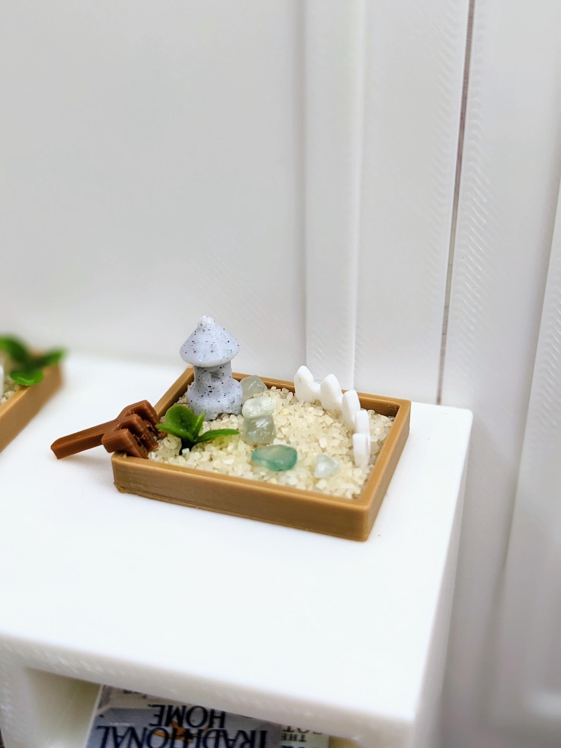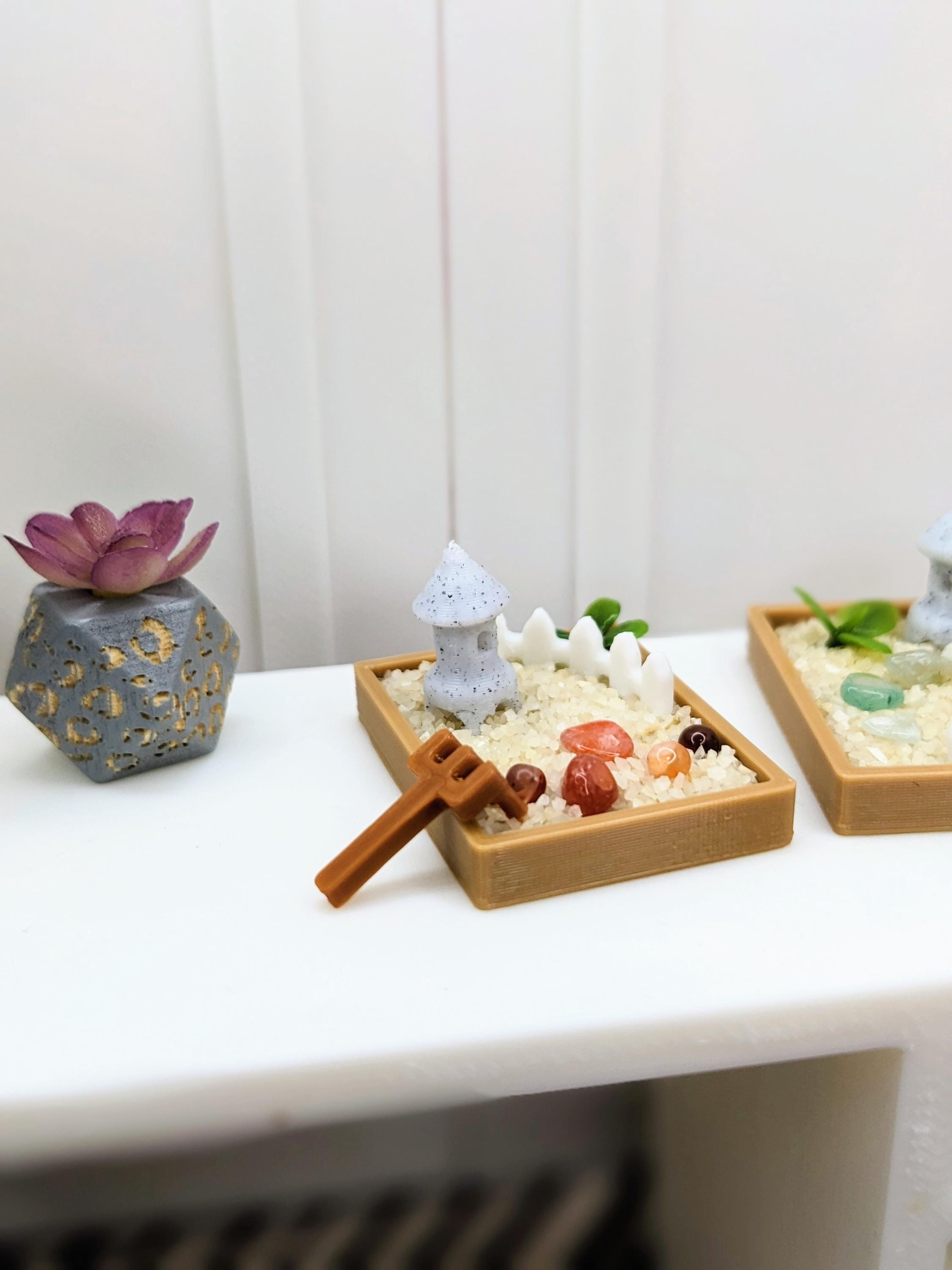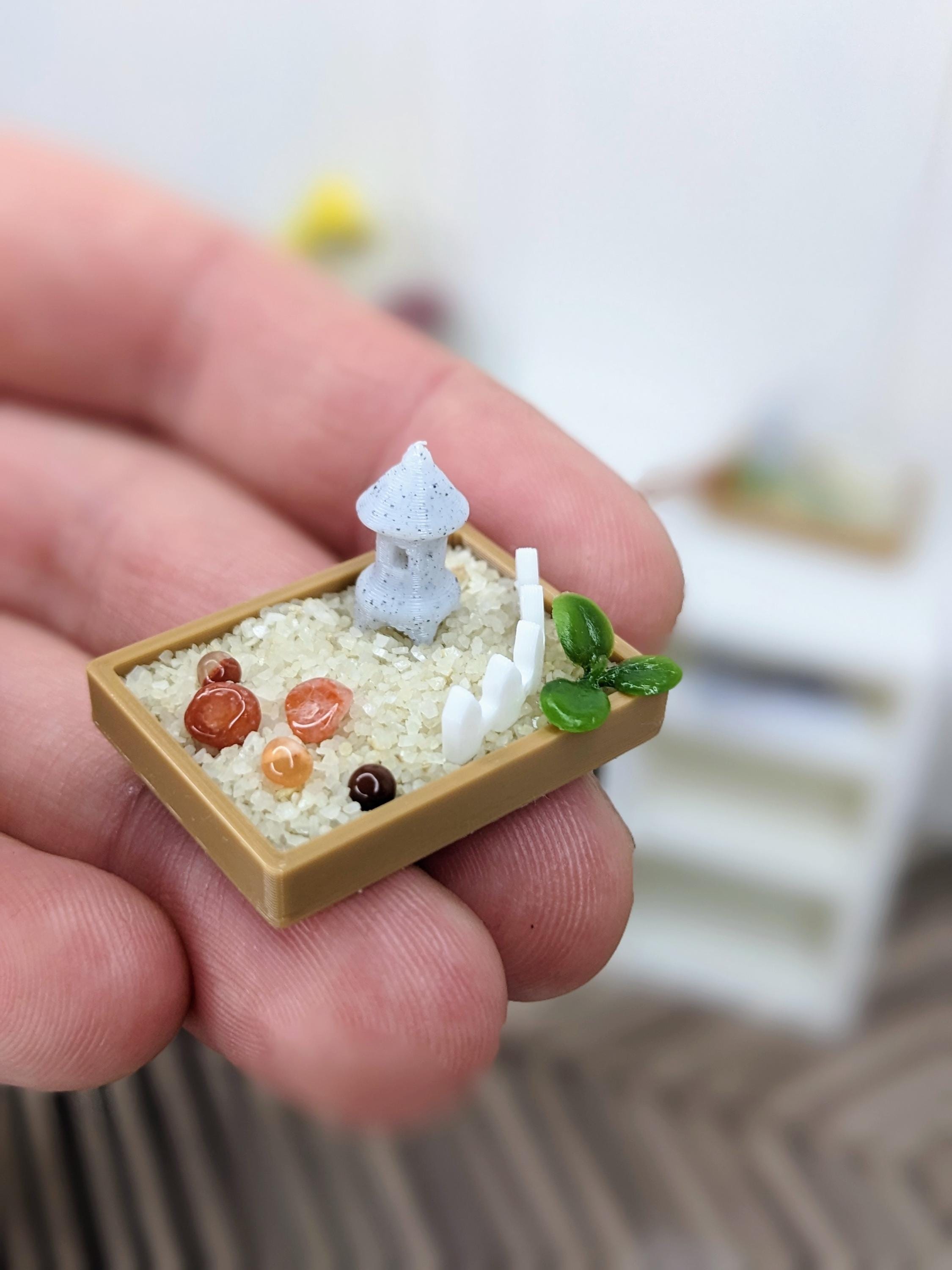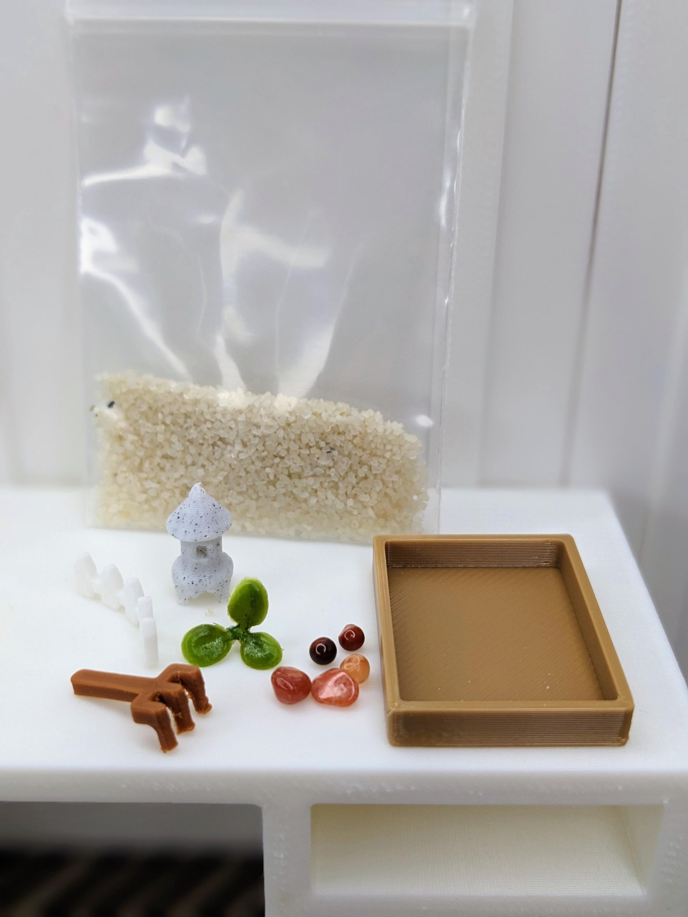 A DIY zen garden kit for your dollhouse! Ideal for 1:12 or 1:6. 1" LONG X .75" WIDE. This kit includes all the bits and pieces needed to decorate your own tiny zen garden; all you need is tweezers, patience, and creativity! The picket fence, "stone" building, and tray are 3D printed with high quality PLA plastic. Other components are mixed materials. Please read below carefully for a full understanding of what you'll receive! For display only, not intended for rough play.
