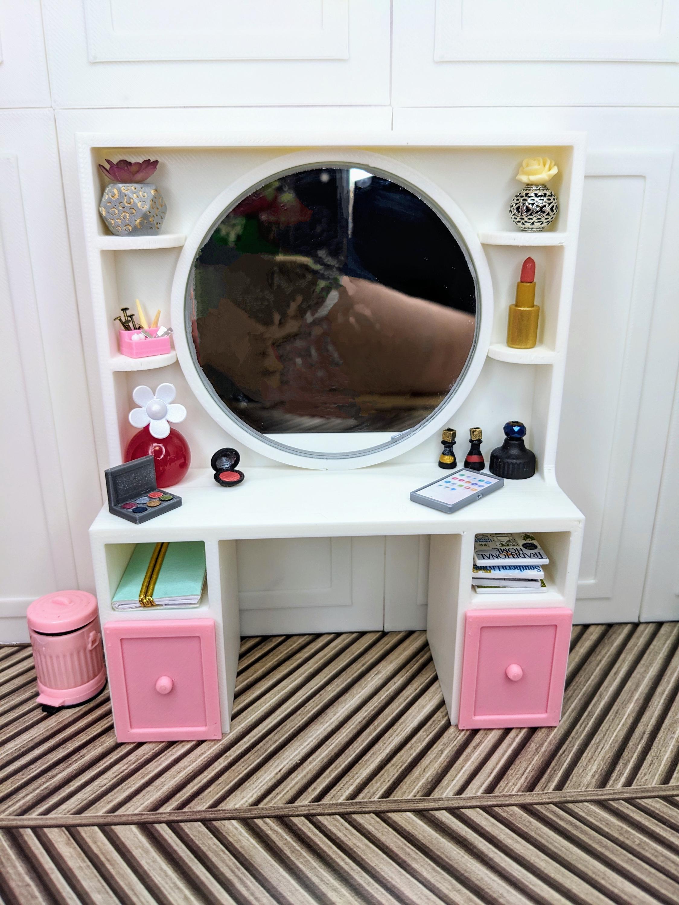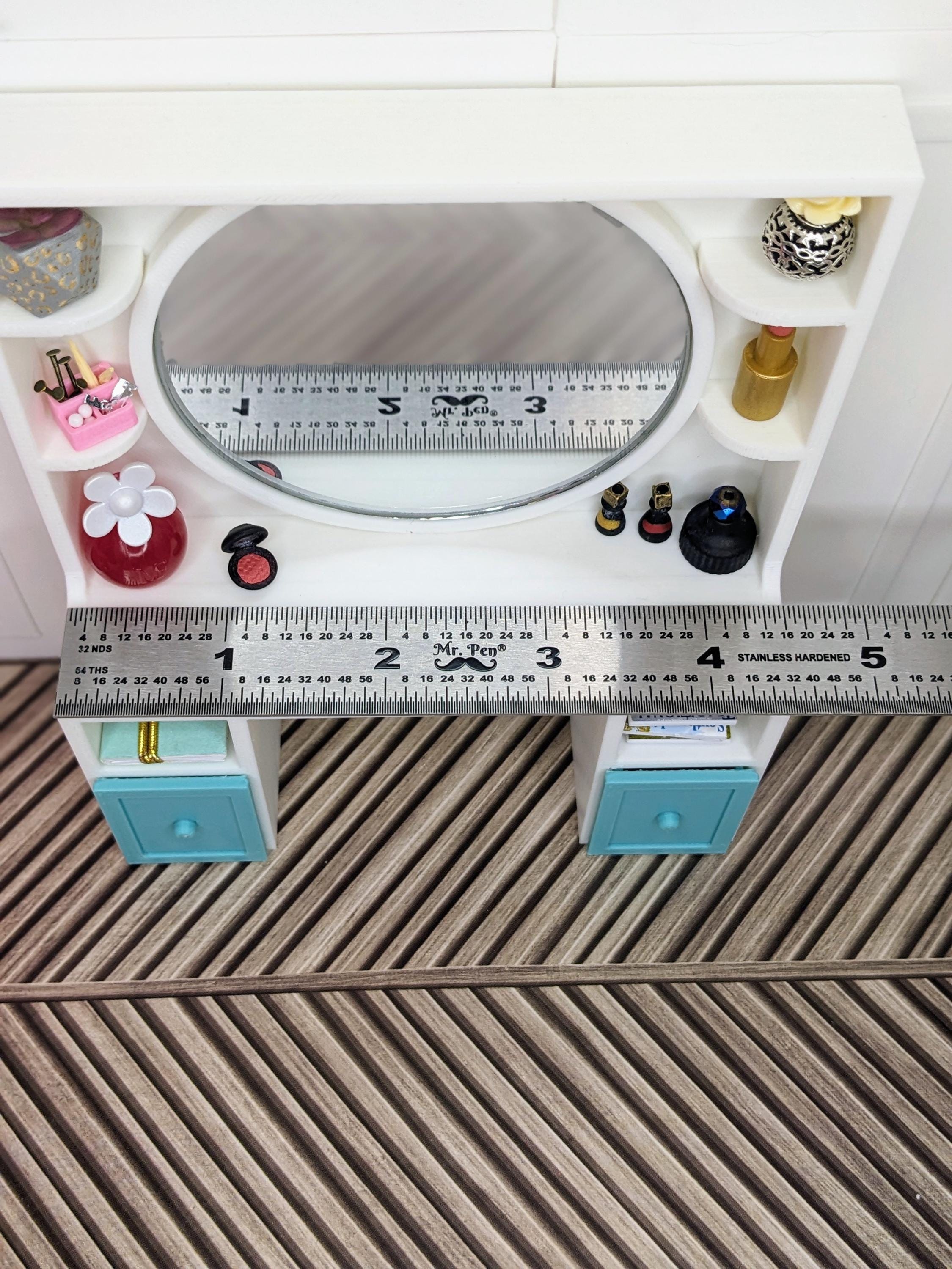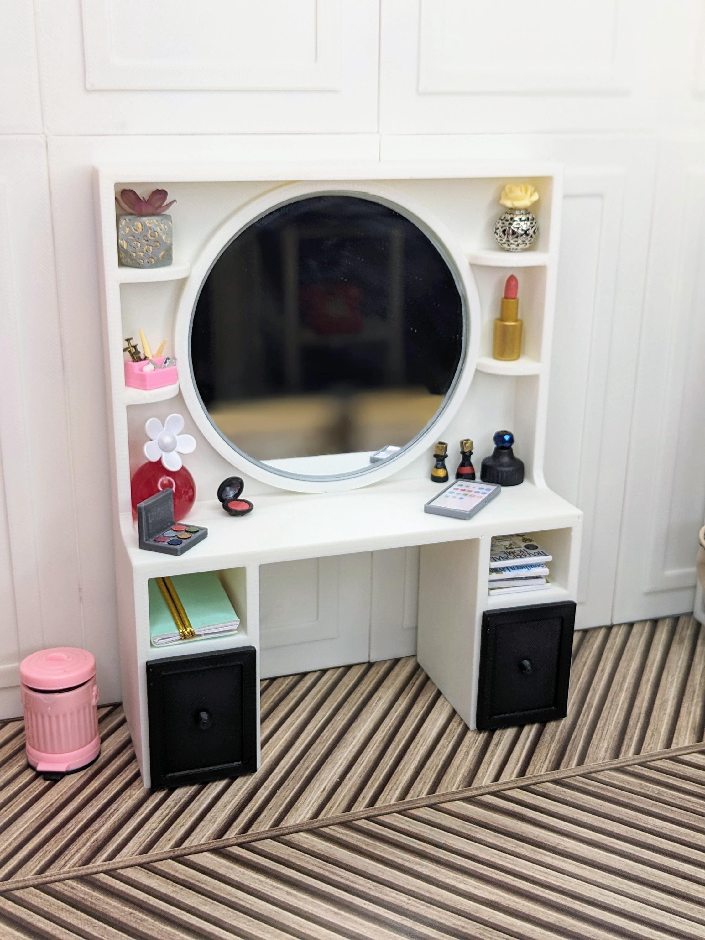*Original Design!* An adorable beauty vanity in 1:12 scale! This item is 3D printed with high quality PLA plastic. This vanity features a crystal clear 3" mirror, multiple shelves, cubbies, and two drawers, with ample space to store all your make-up and essentials! The mirror is glued to the vanity, it does not come apart. Other decor and accessories not included.