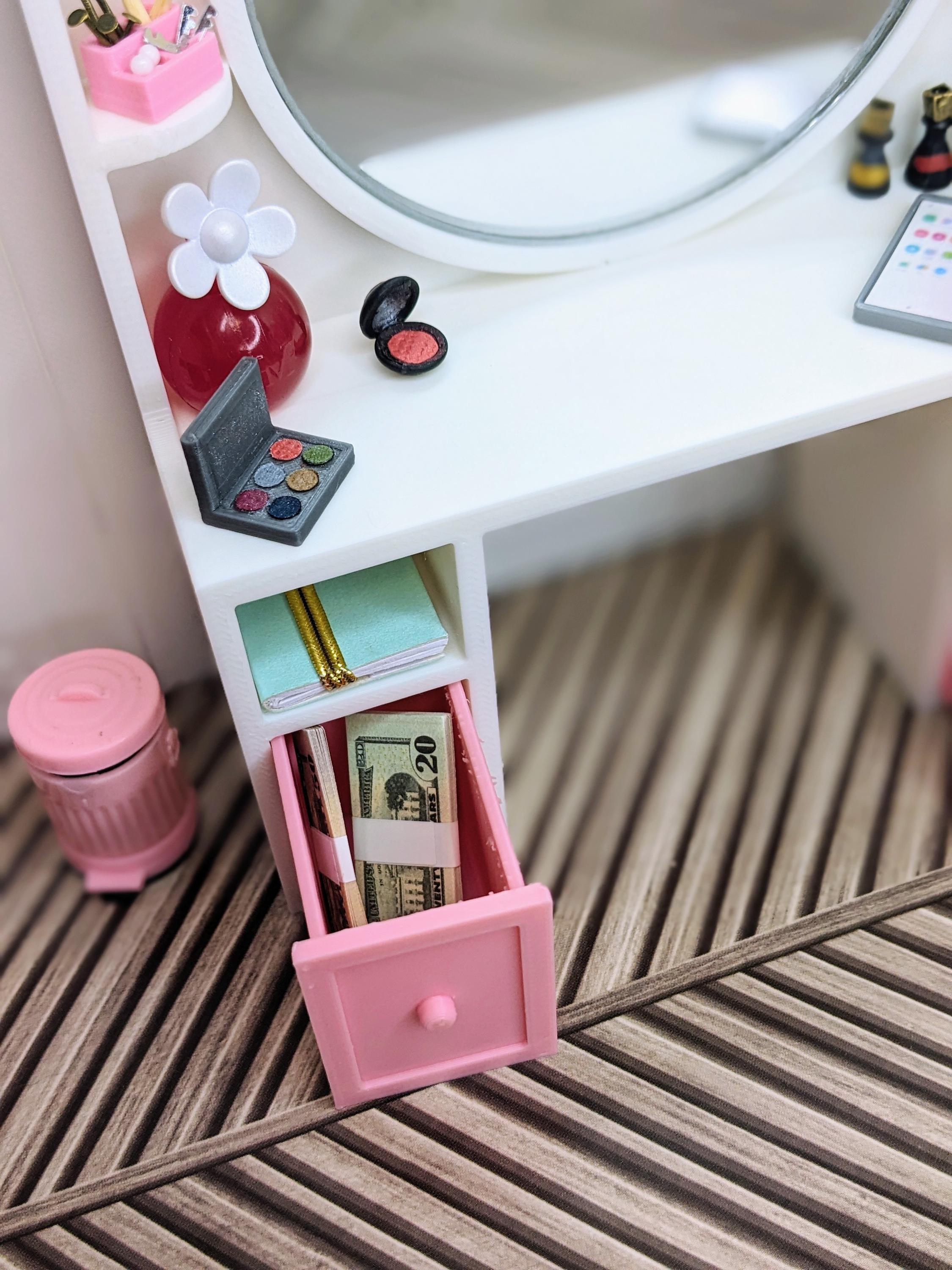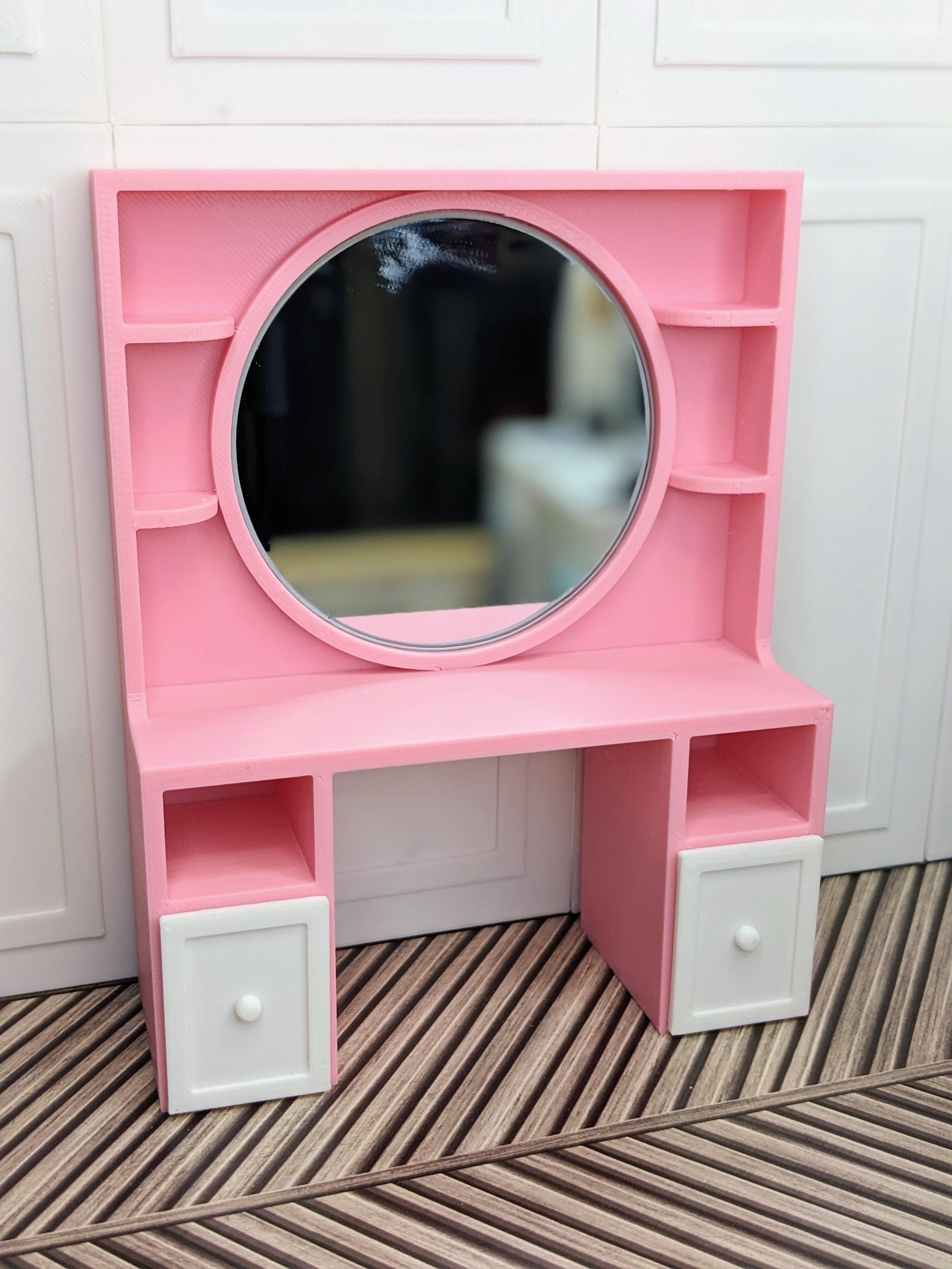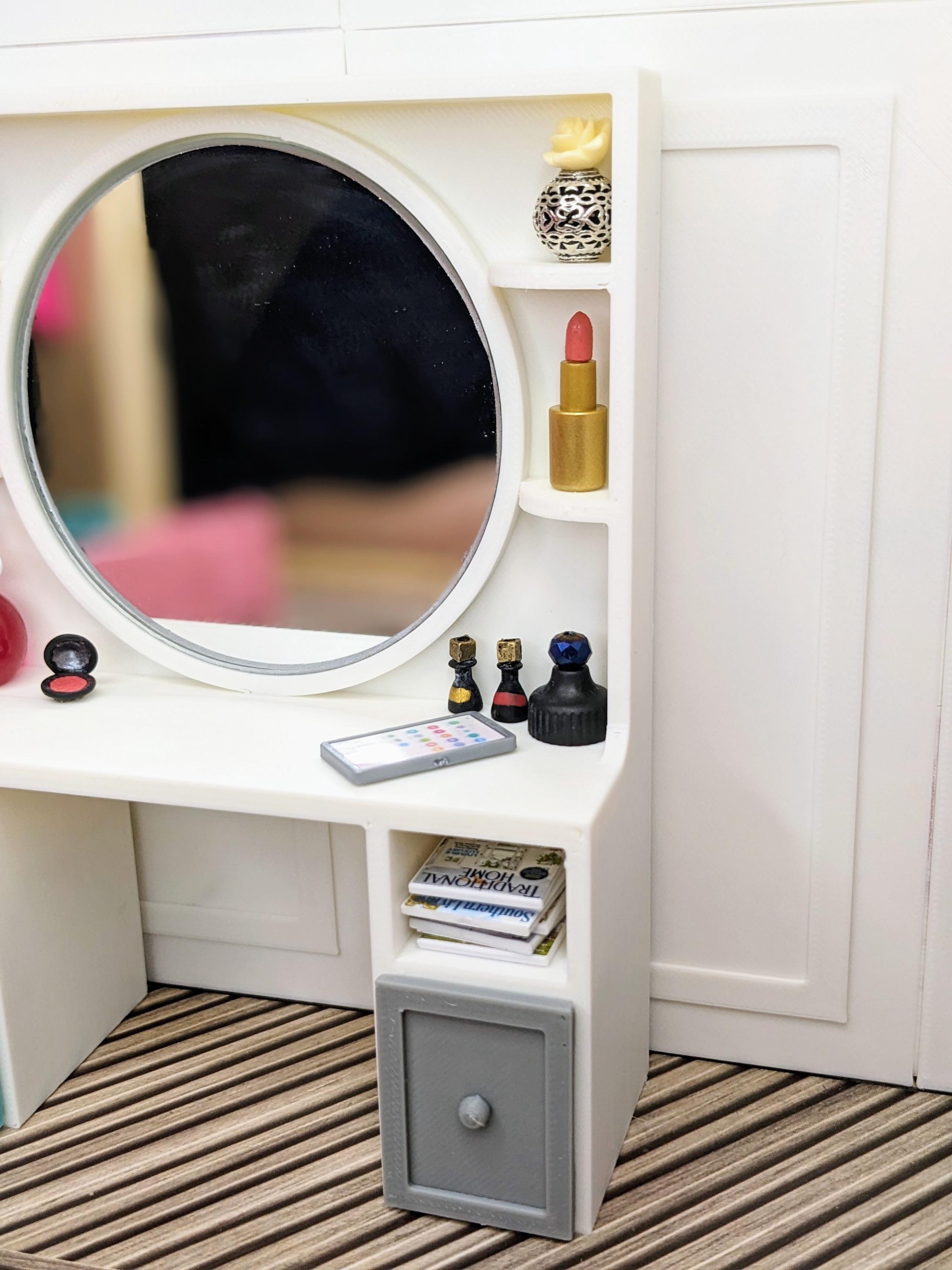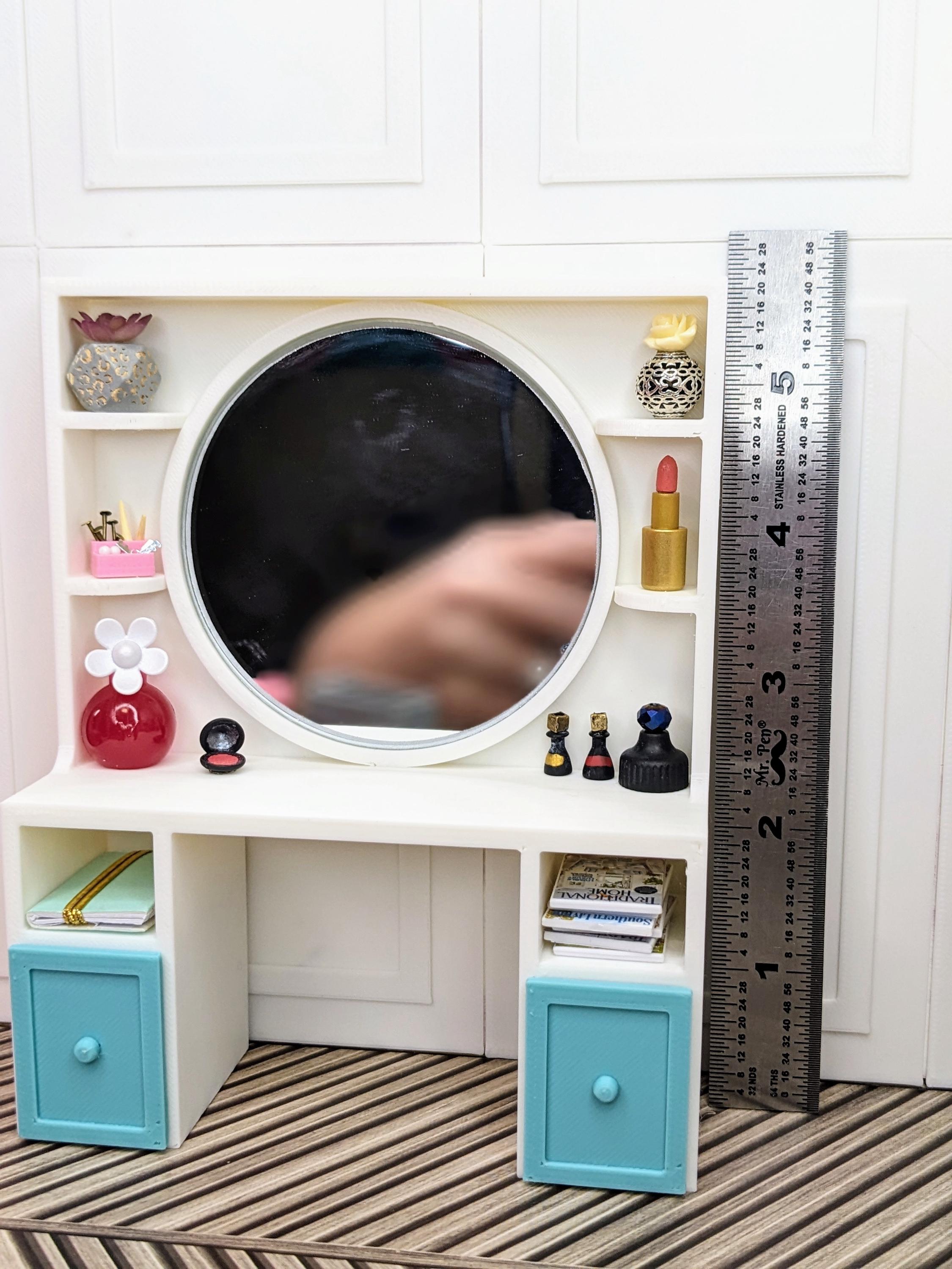 *Original Design!* An adorable beauty vanity in 1:12 scale! This item is 3D printed with high quality PLA plastic. This vanity features a crystal clear 3" mirror, multiple shelves, cubbies, and two drawers, with ample space to store all your make-up and essentials! The mirror is glued to the vanity, it does not come apart. Other decor and accessories not included.
