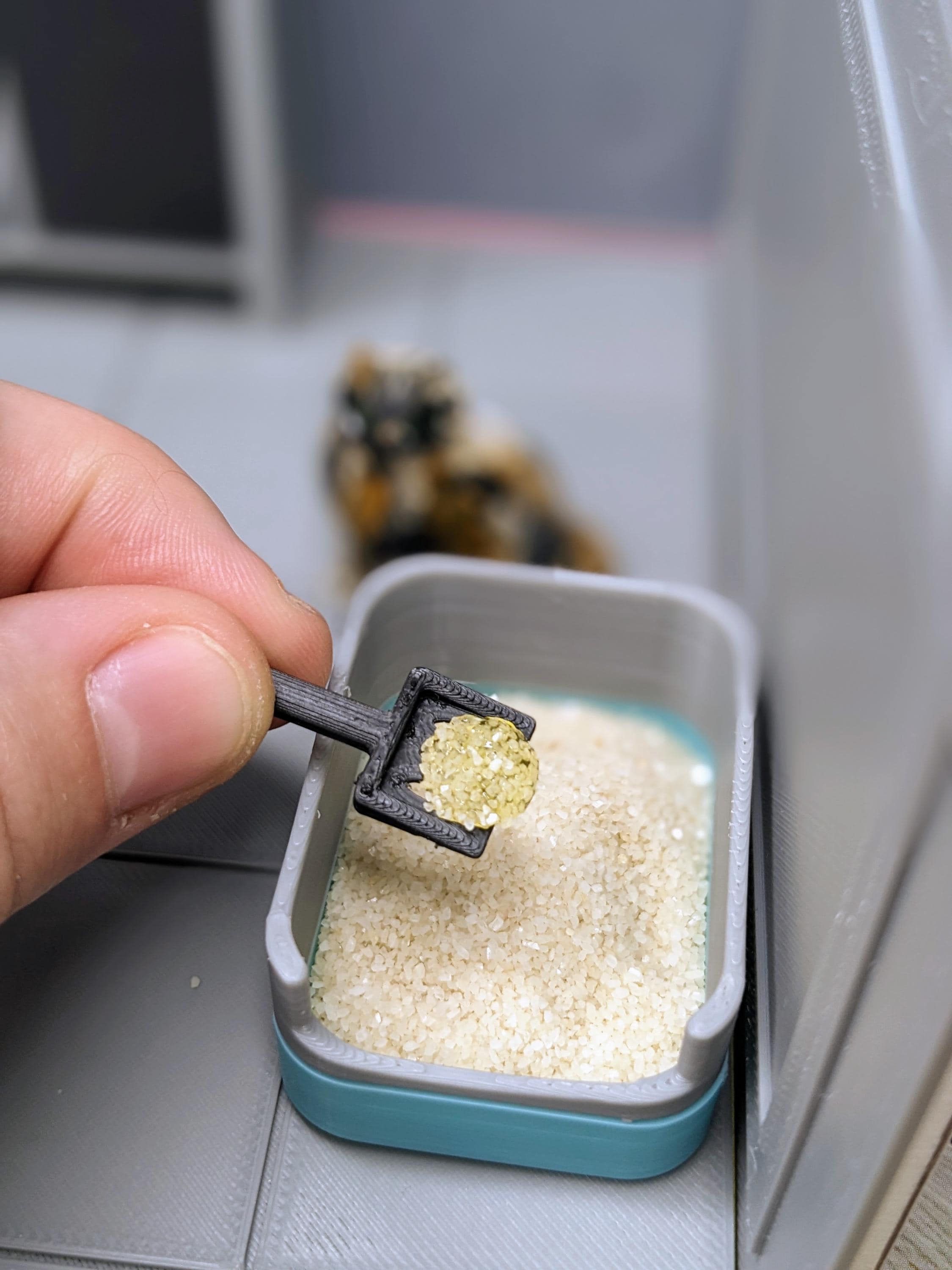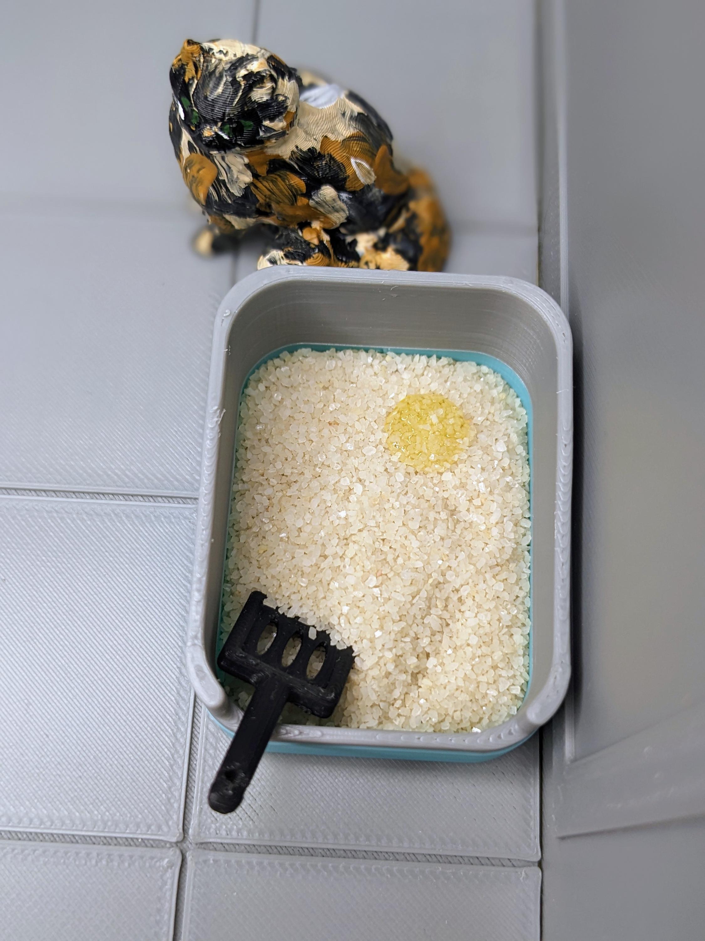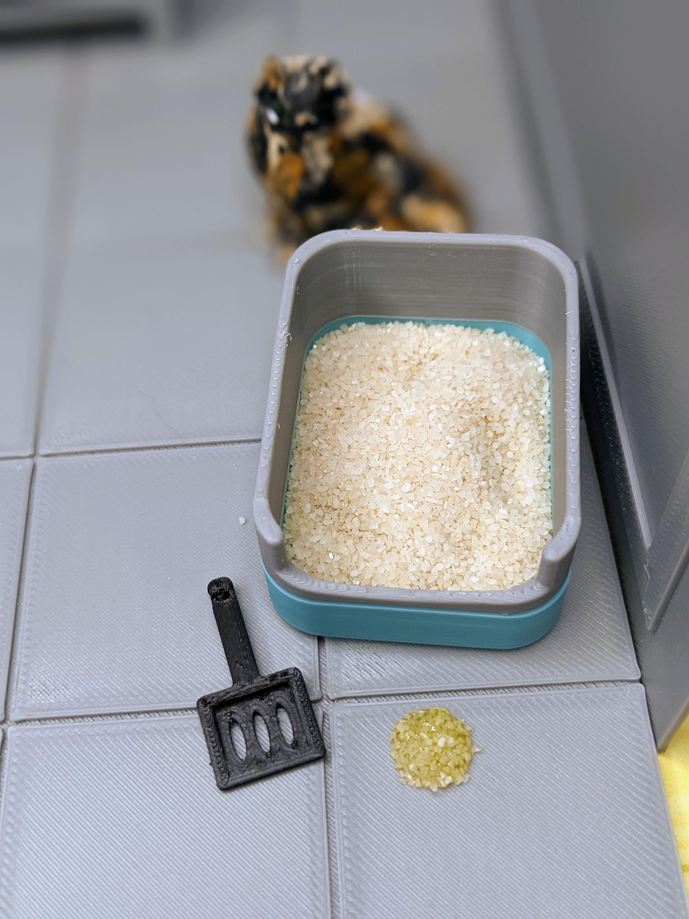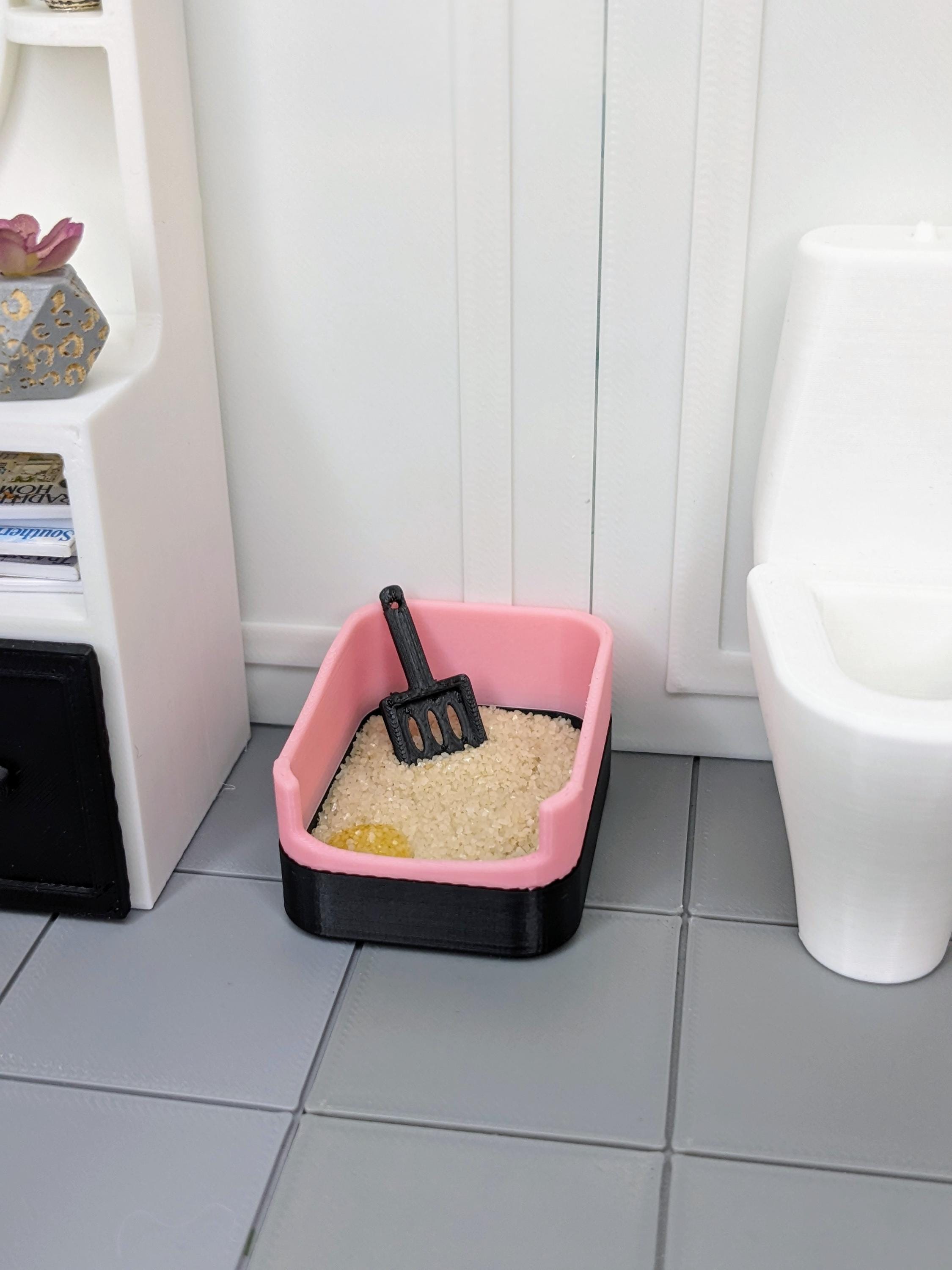 *Original Design!* A litterbox in 1:12 scale! Featuring two colors, the lid and bottom detach for interactive cleaning. Comes with the cutest little black scoop, a tiny bag of sand, and a resin pee clump! The litterbox is 3D printed with high quality PLA plastic.