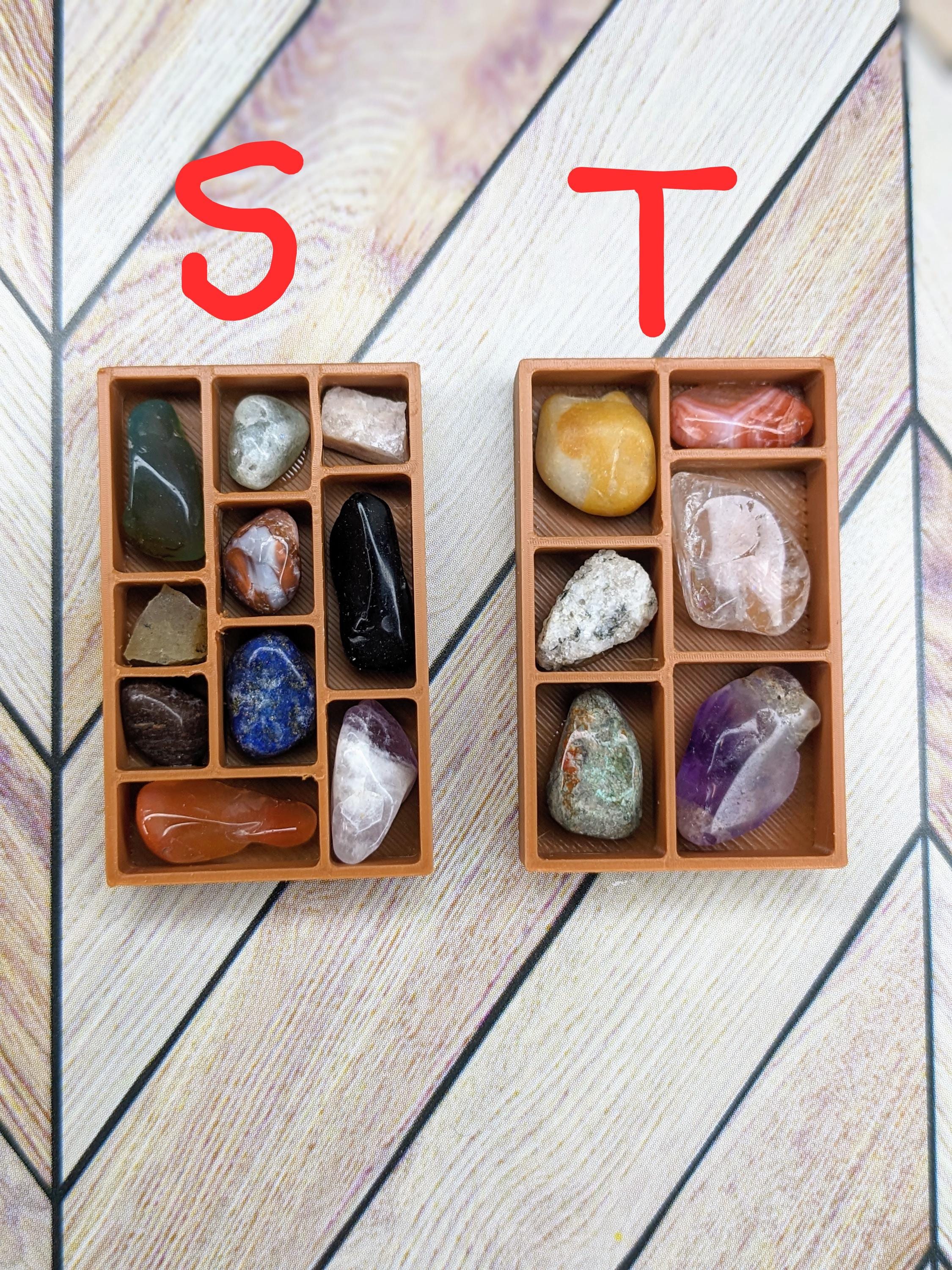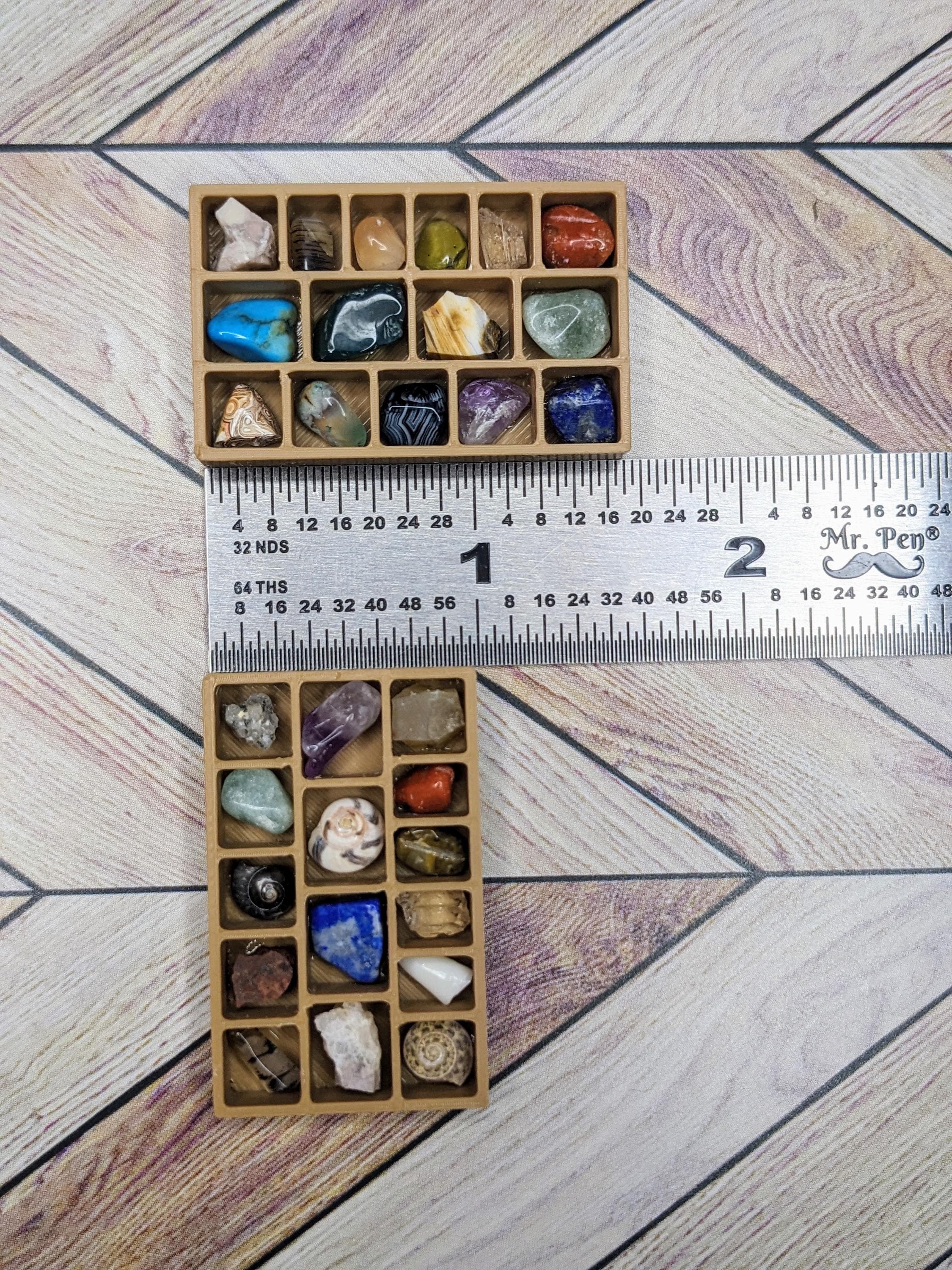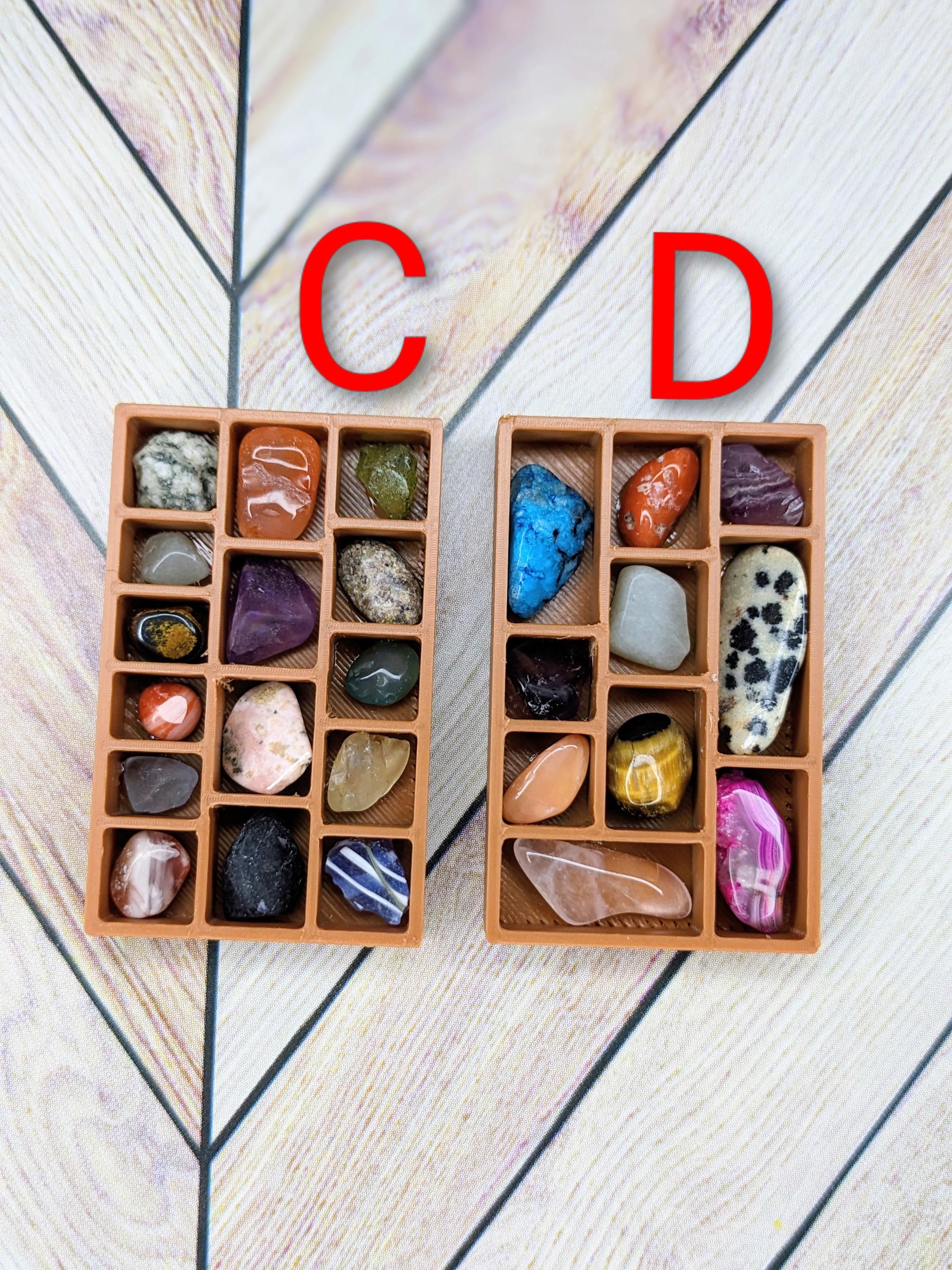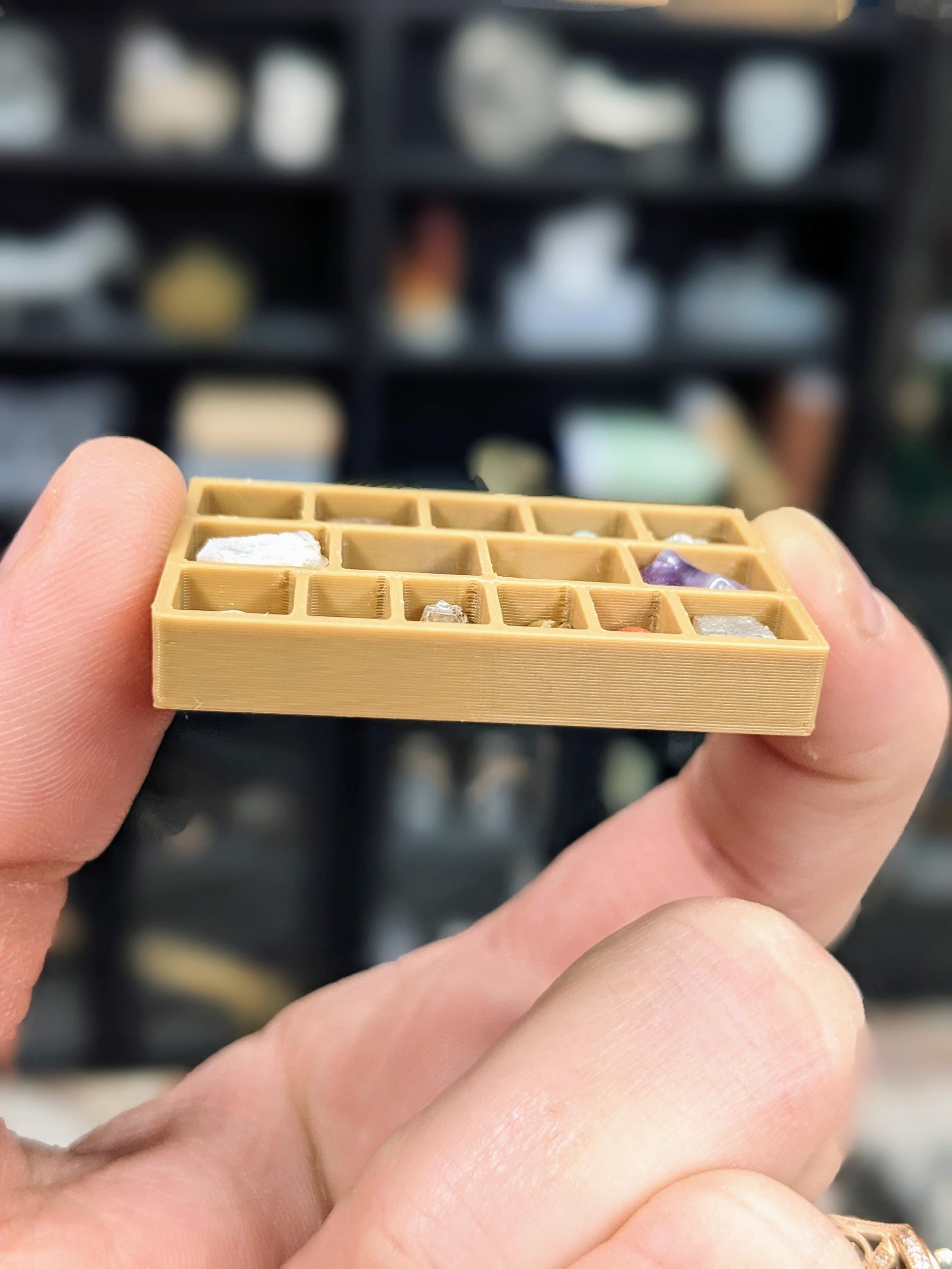 *Handmade Item!* A rock display in 1:12 scale! Could also work for 1:6. These are the perfect addition to your dollhouse study, geology classroom, or apothecary store. With several different styles available, each display case is 3D printed with high quality PLA plastic in red brown, chocolate brown, or tan brown, featuring different rocks/gems/fossils. The rocks vary from polished to rough, and are sourced from both online retailers and from a local rock shop. Each display case is assembled and curated with attention to detail and variety. All rocks are glued in place, they are not removable. Please refer to pictures for styles.