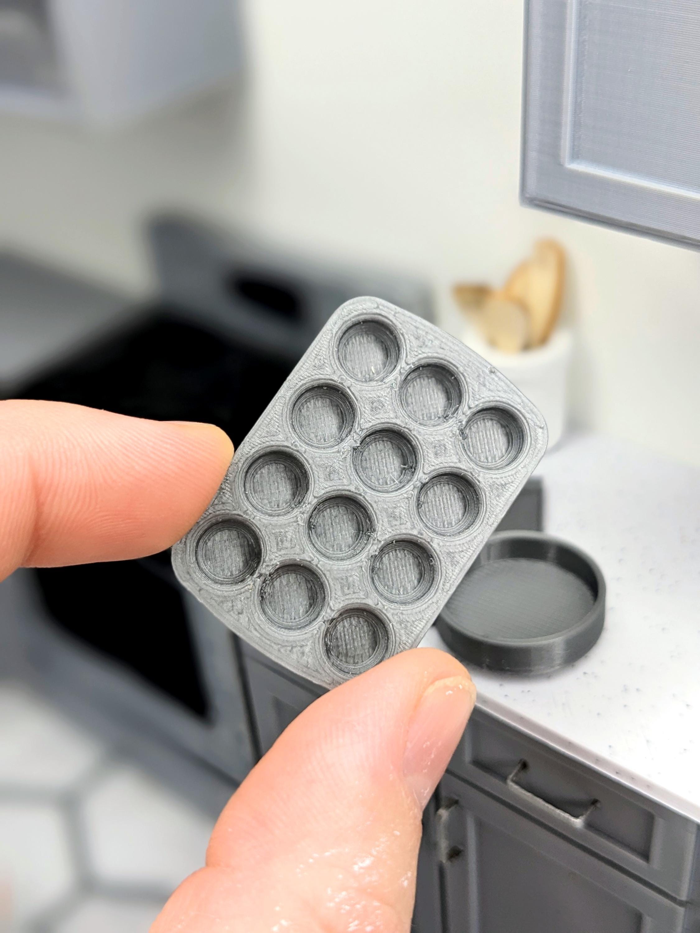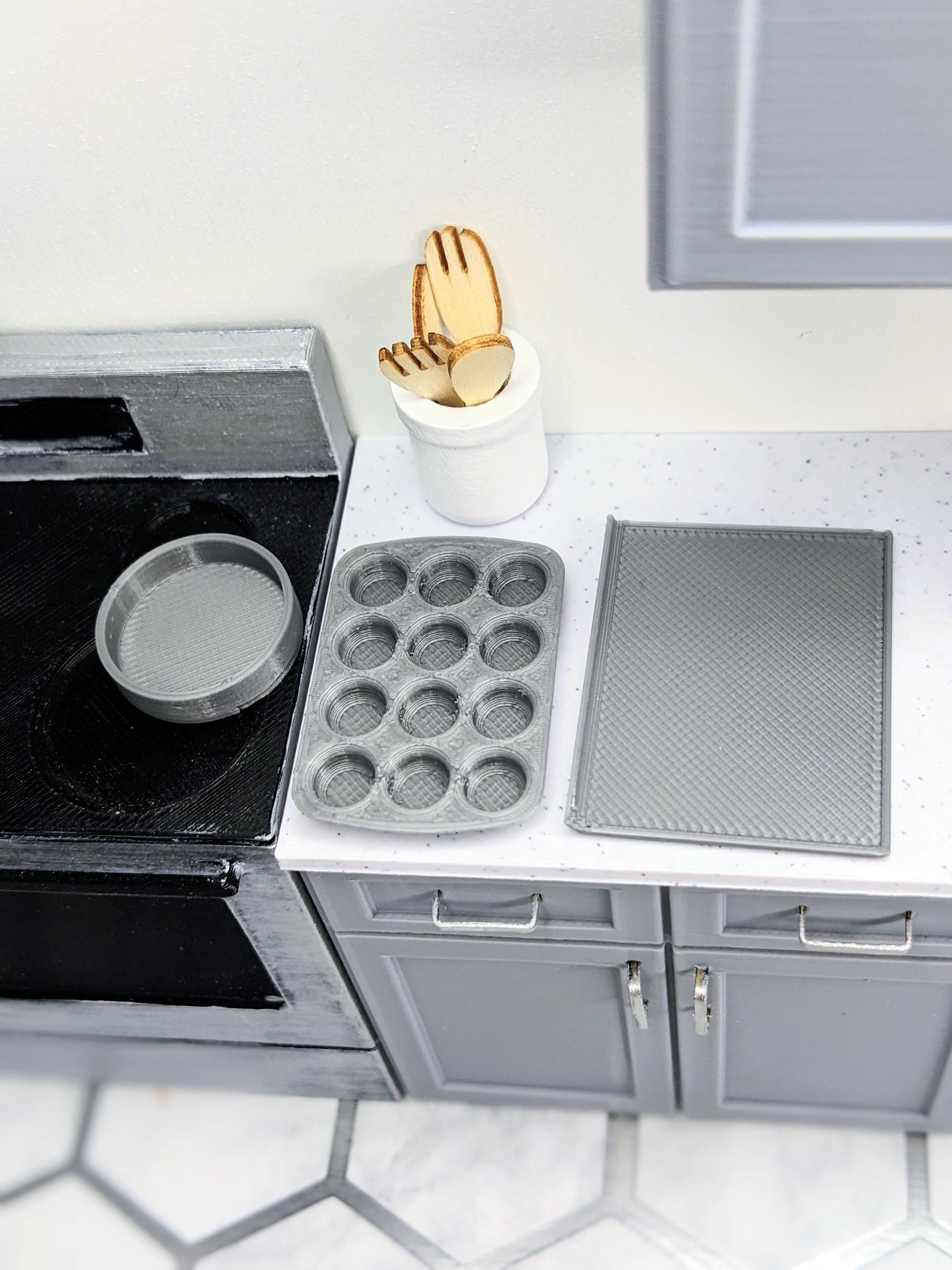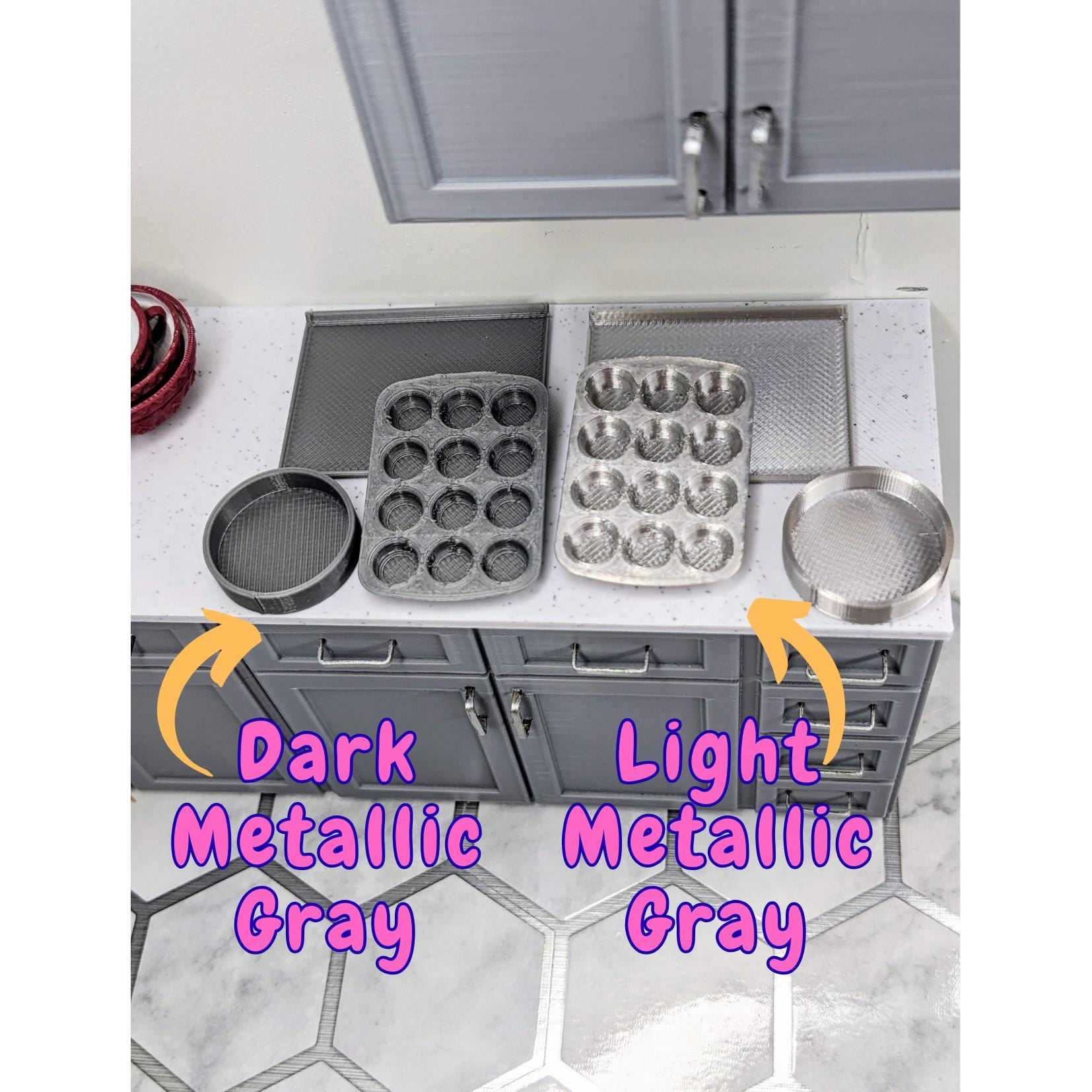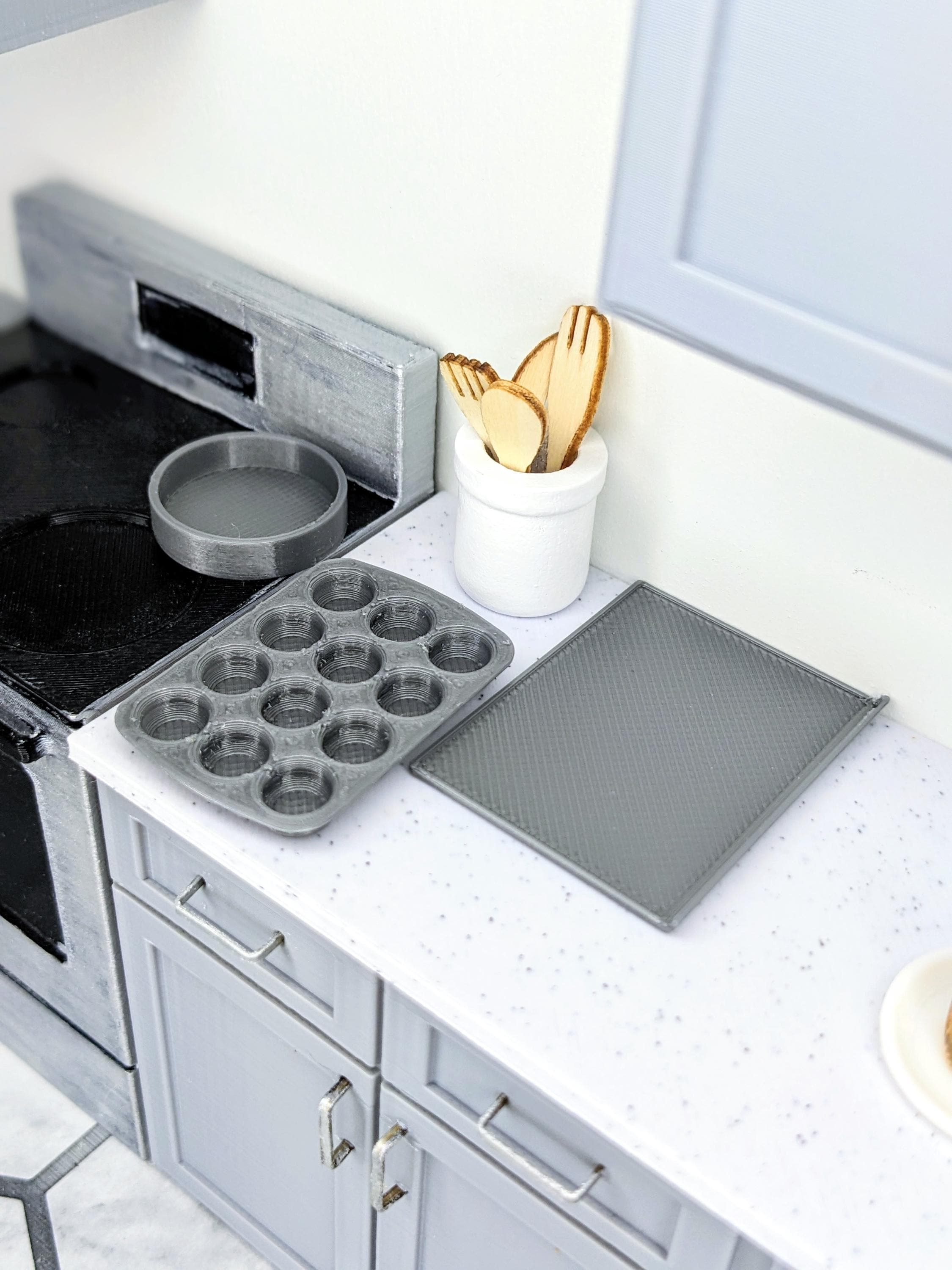 *Original Design!* Adorable baking dishes in 1:12 scale! Each dish is 3D printed with high quality PLA plastic in a metallic gray color. Price is per item, except FULL SET includes 1 of each piece (3 pcs total). Perfect for your kitchen, bakery display, or cafe!