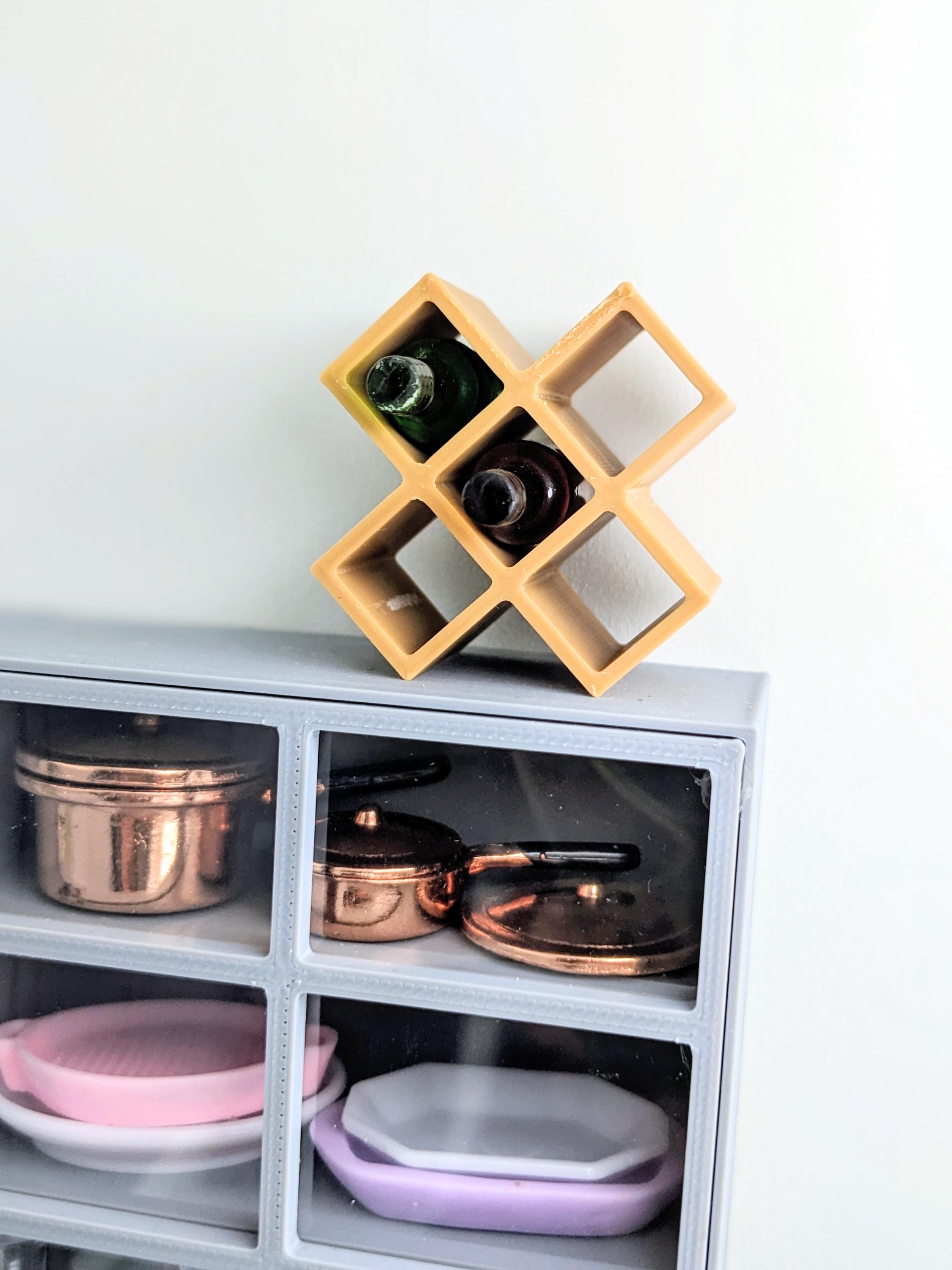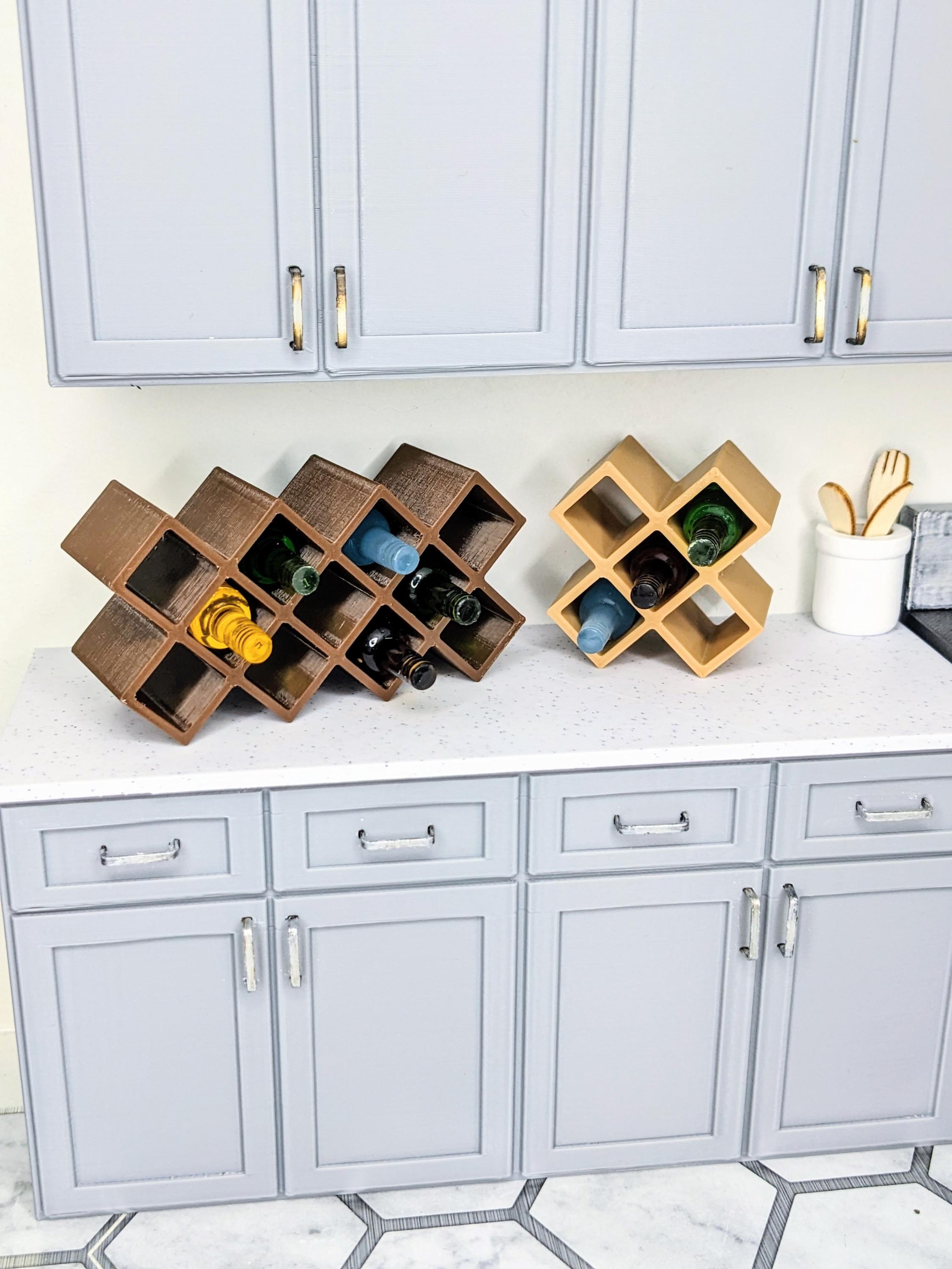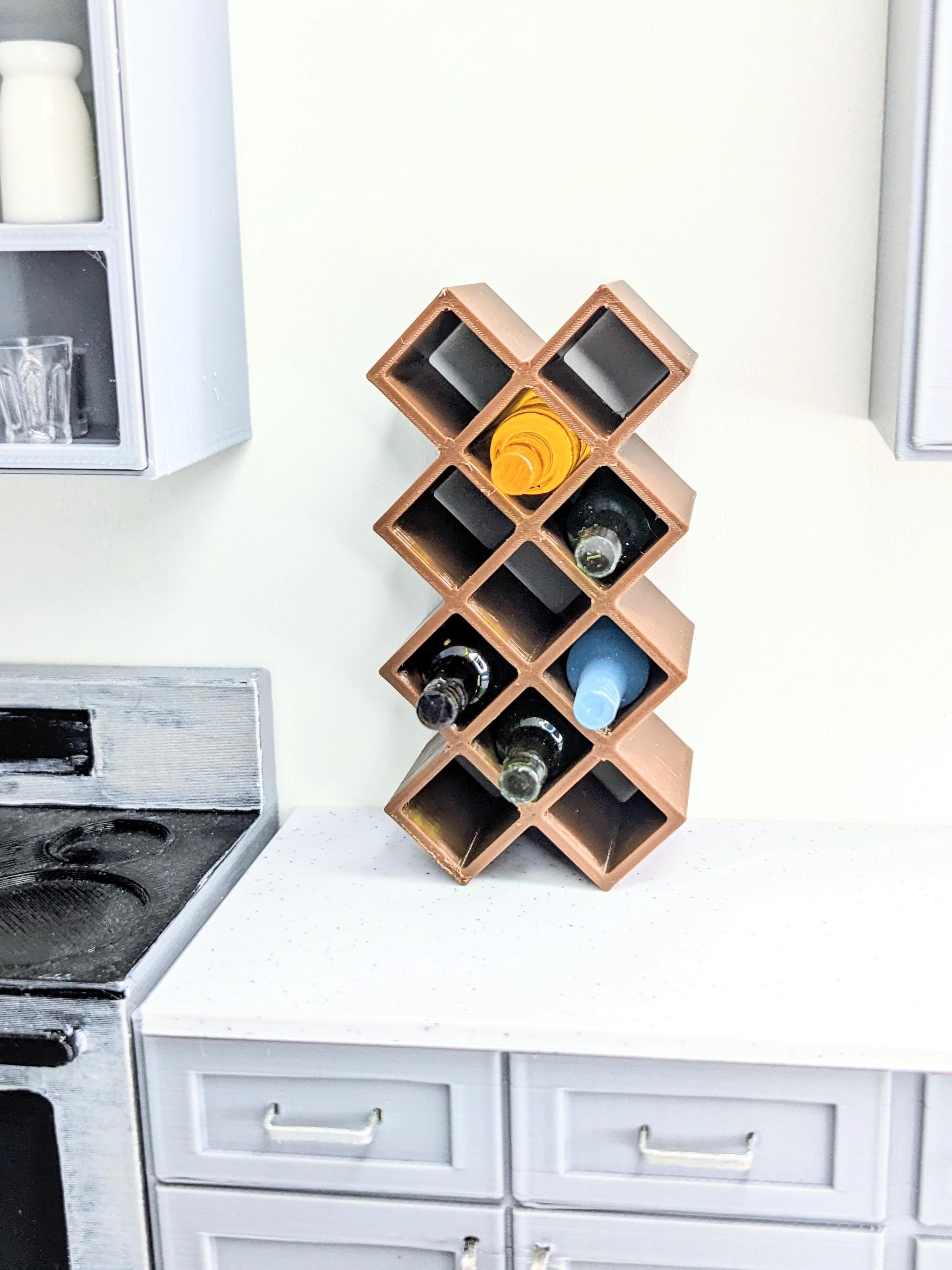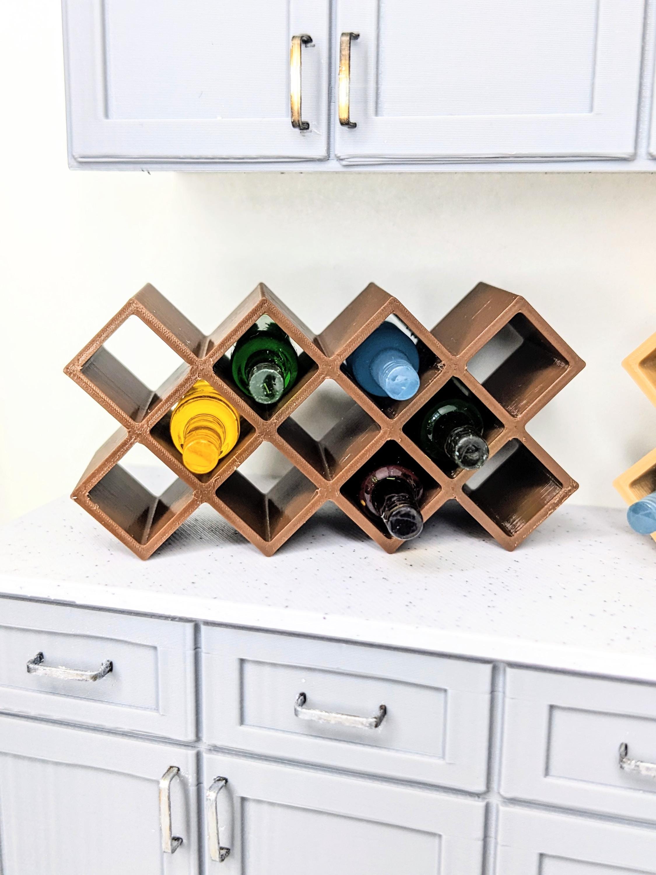*Original Design!* A wine rack in 1:12 scale! Ideal for your kitchen countertop or your winery tasting room, this wine rack can fit bottles up to .35" (10 mm) diameter. Available in two different sizes to hold 5 bottles or 11 bottles. BOTTLES NOT INCLUDED. This item is 3D printed with high quality PLA plastic.
