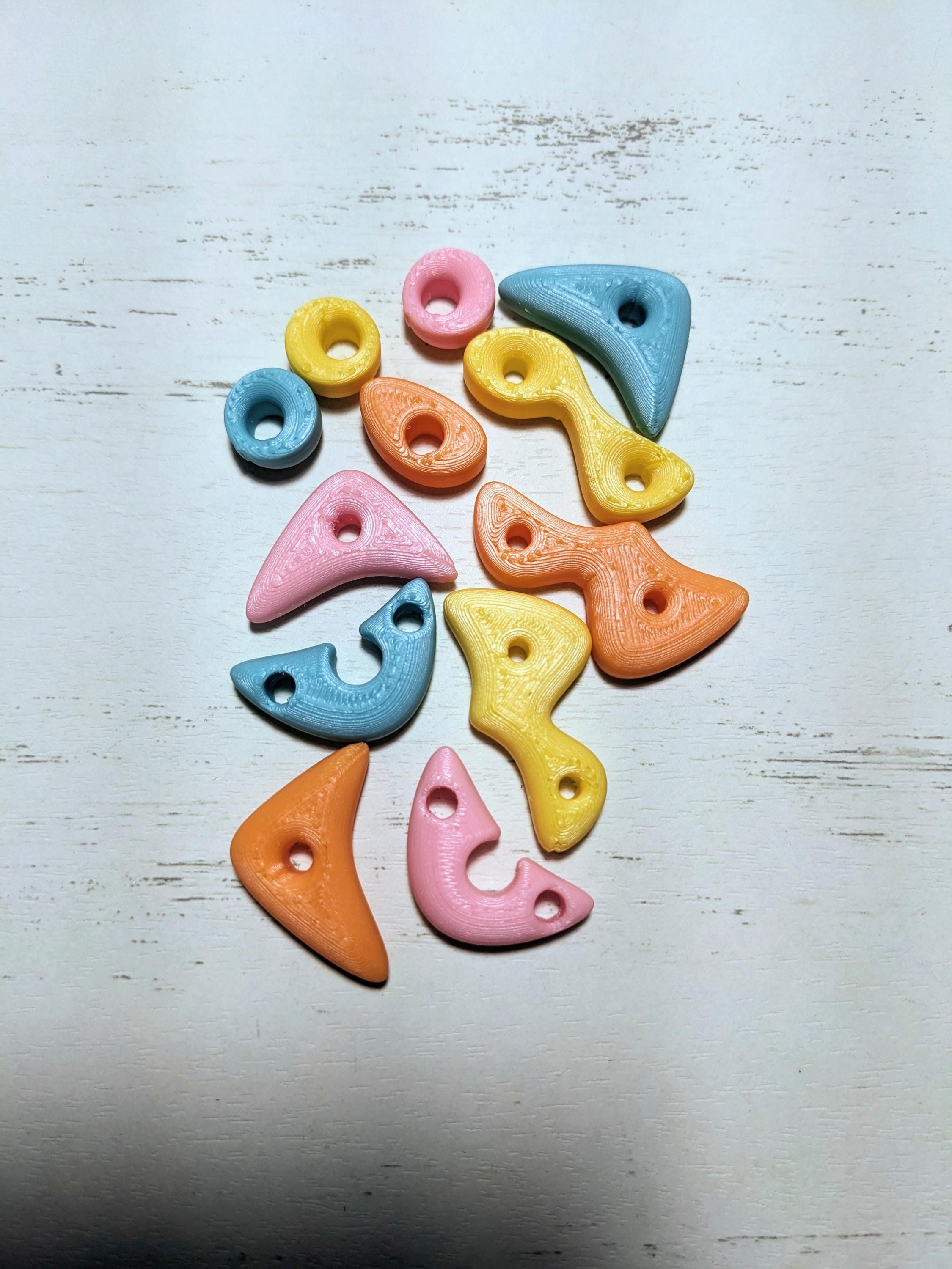*Original Design!* A 12 piece set of DIY rock wall handholds. Could work for 1:6 or similar scale. These handholds are 3D printed with high quality PLA plastic in various colors. Secure them to your dolls playroom wall, outdoor playground, in your diorama, or use them in your school project! You will need glue dots or tacky wax to secure these, adhesive is NOT included.
