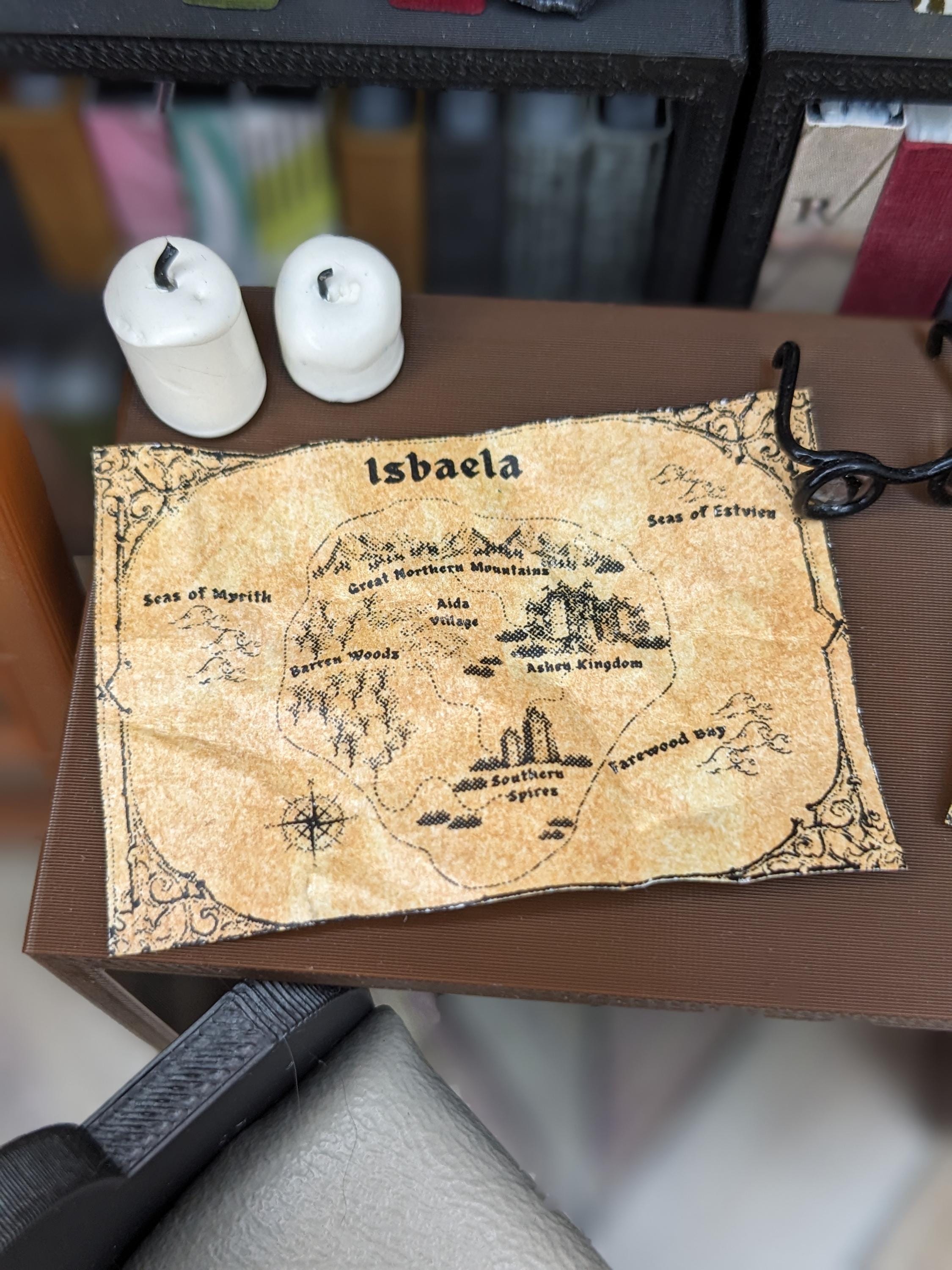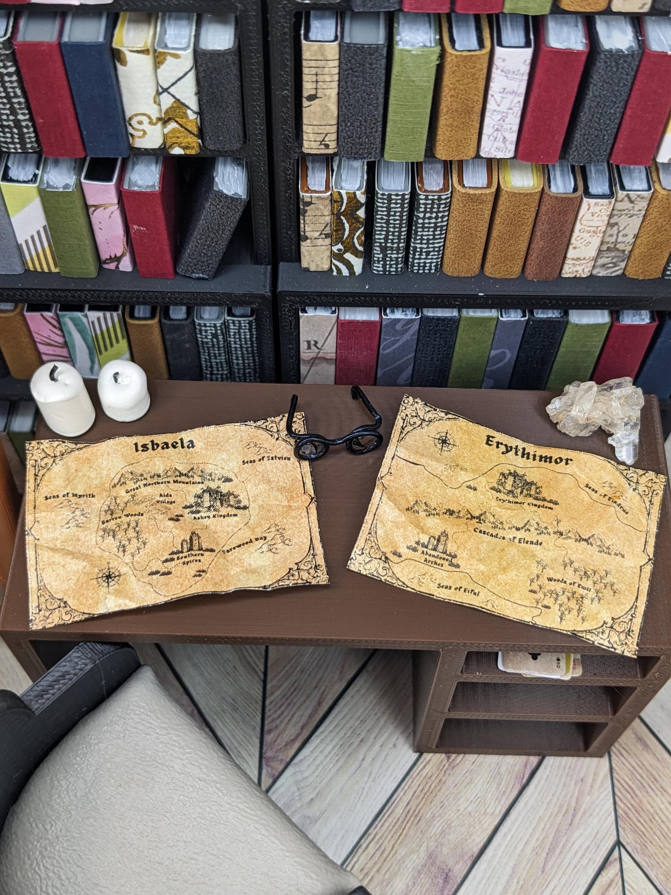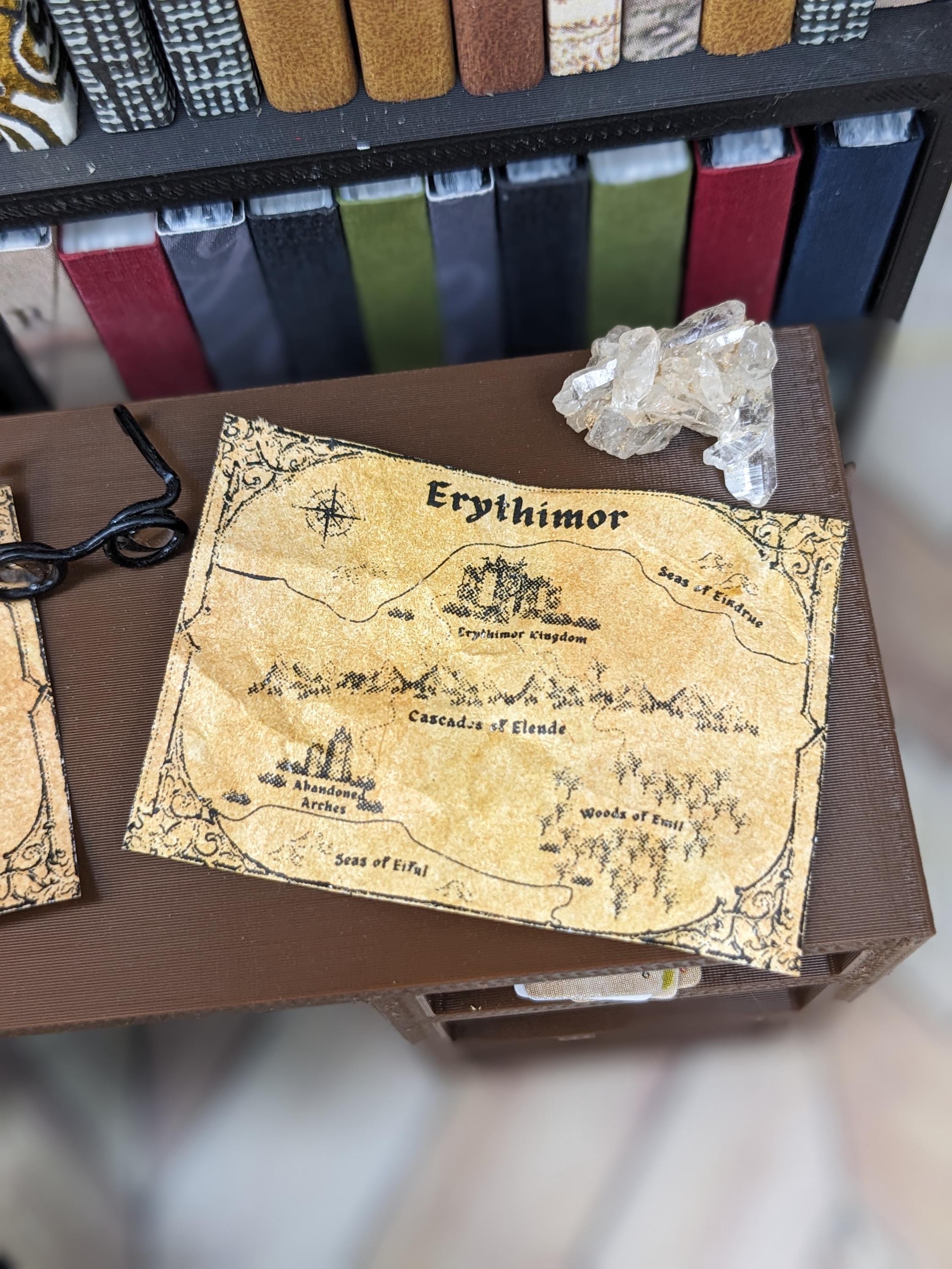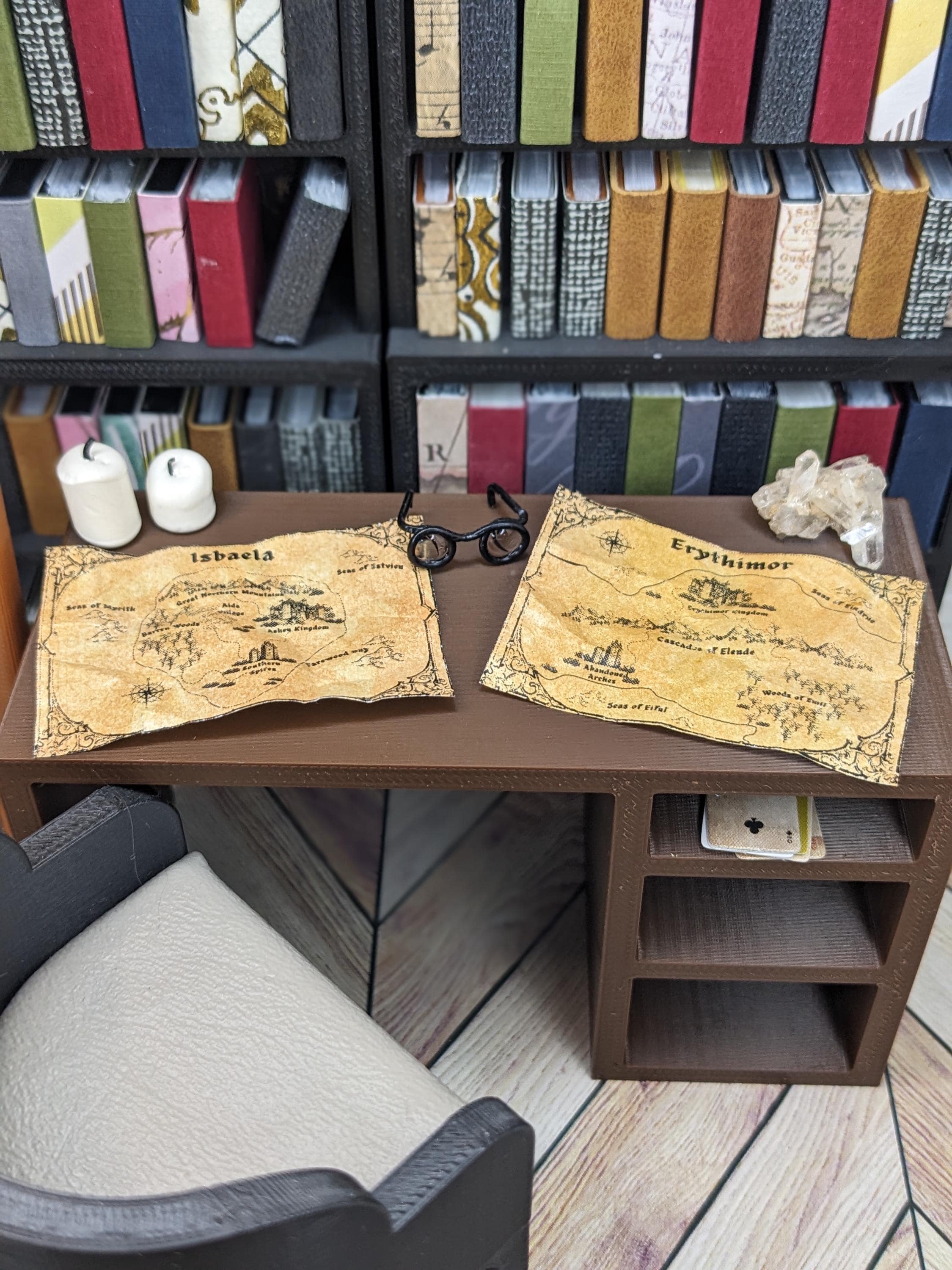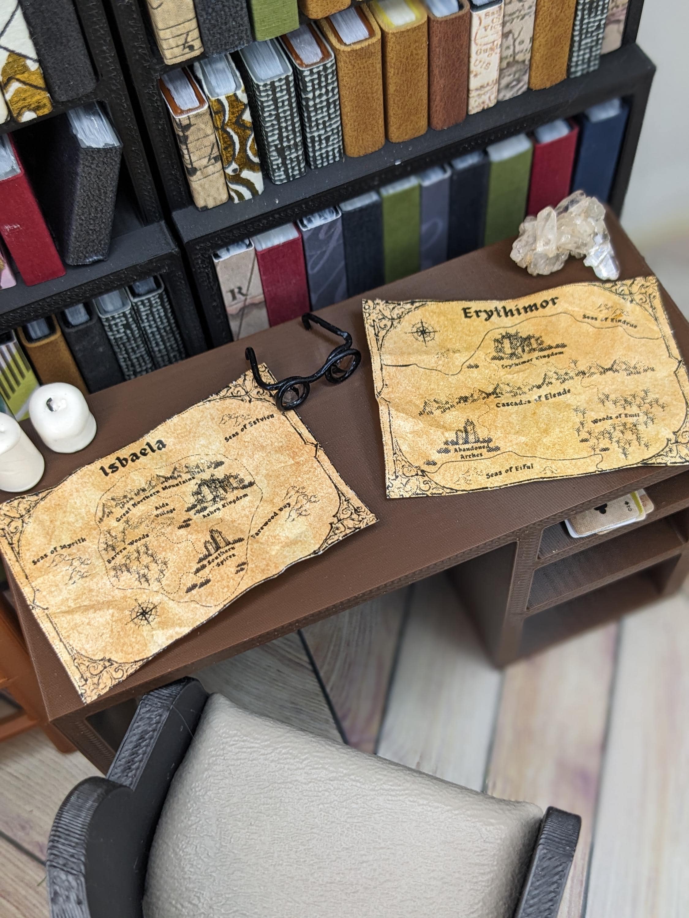 *Handmade Item!* Miniature fantasy cartography maps for your dollhouse or diorama! Suitable for multiple scales like 1:12 or 1:6. Each map is designed online by me, printed on paper, then painted and weathered, and sealed with a coat of satin varnish. Ideal for your library, captains quarters, steampunk office, etc.