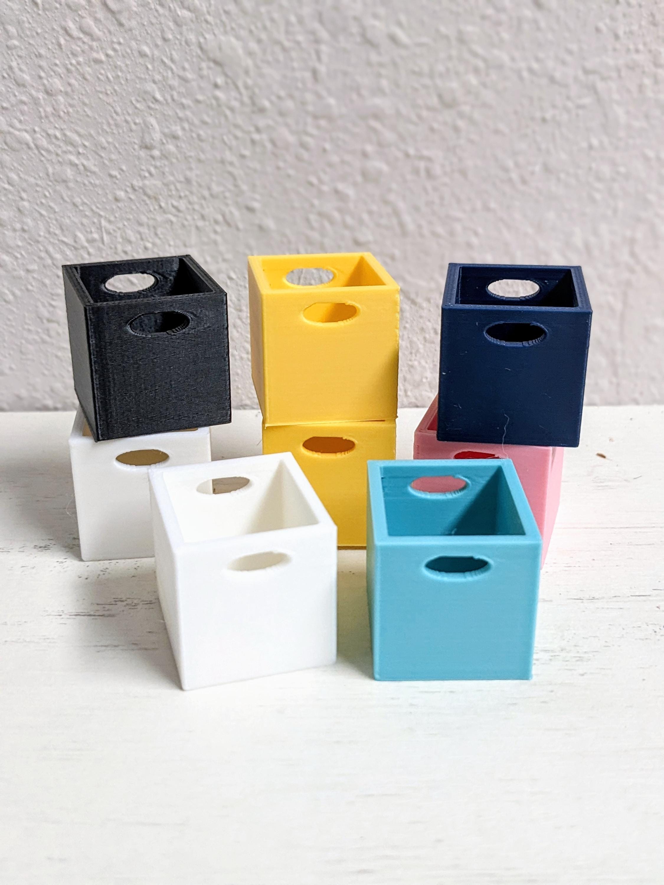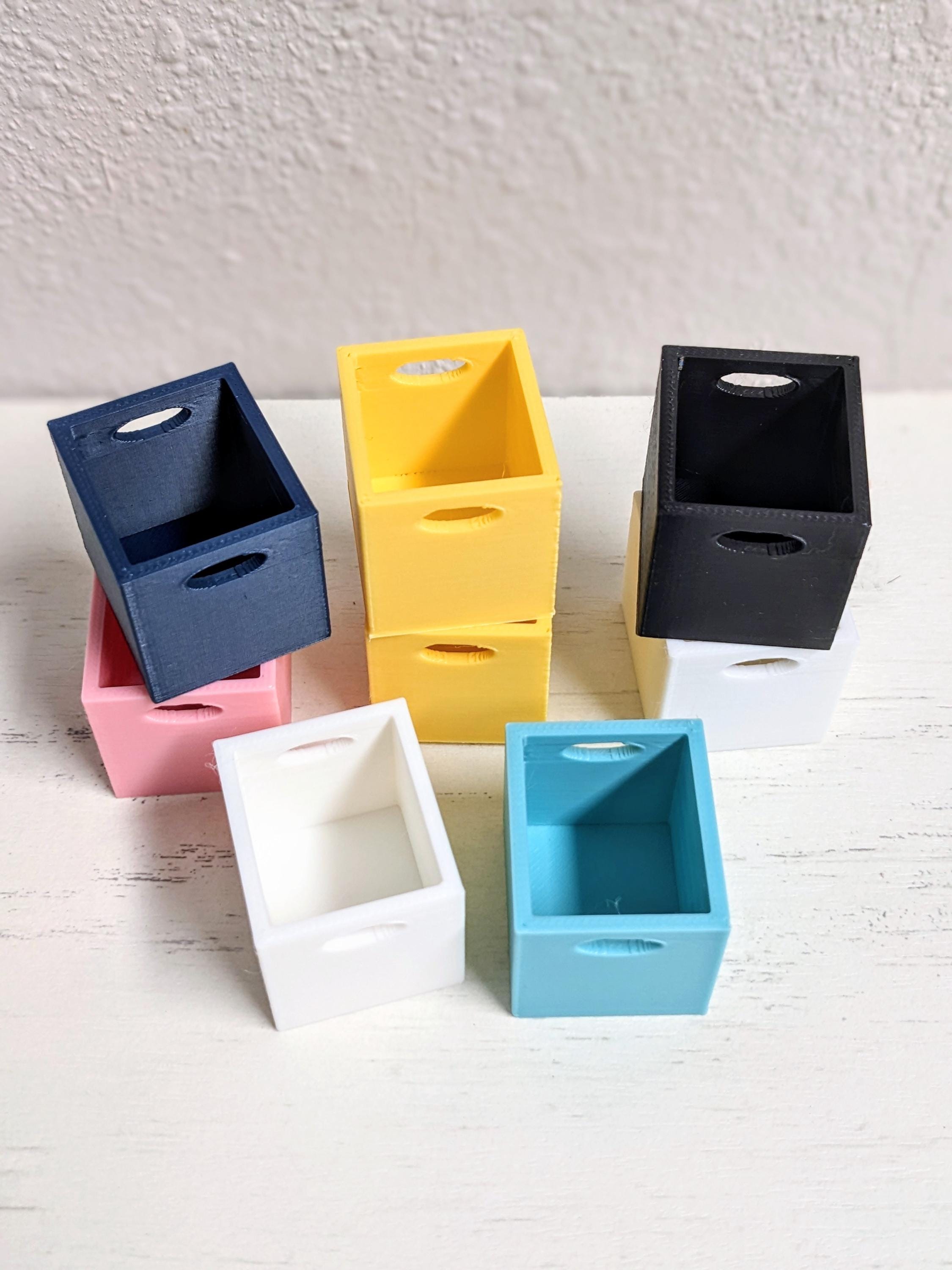 *Original Design!* This listing is for BINS ONLY, they are the same bins that fit my cube bookshelves. These are 3D printed with high quality PLA plastic. The bins are functional in storing books, shoes, decor, etc. Other decor and accessories not included. BOOKSHELF NOT INCLUDED in this listing! If you are looking for the bookshelf, please view it at this link. https://mossycatminisllc.etsy.com/listing/1405804532/112-cube-bookshelf-miniature-furniture