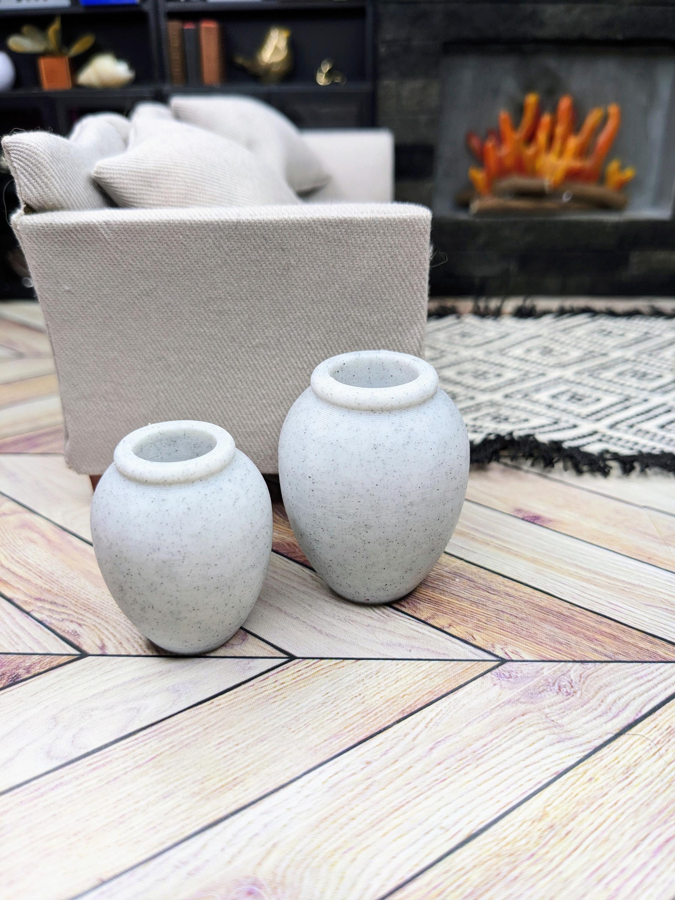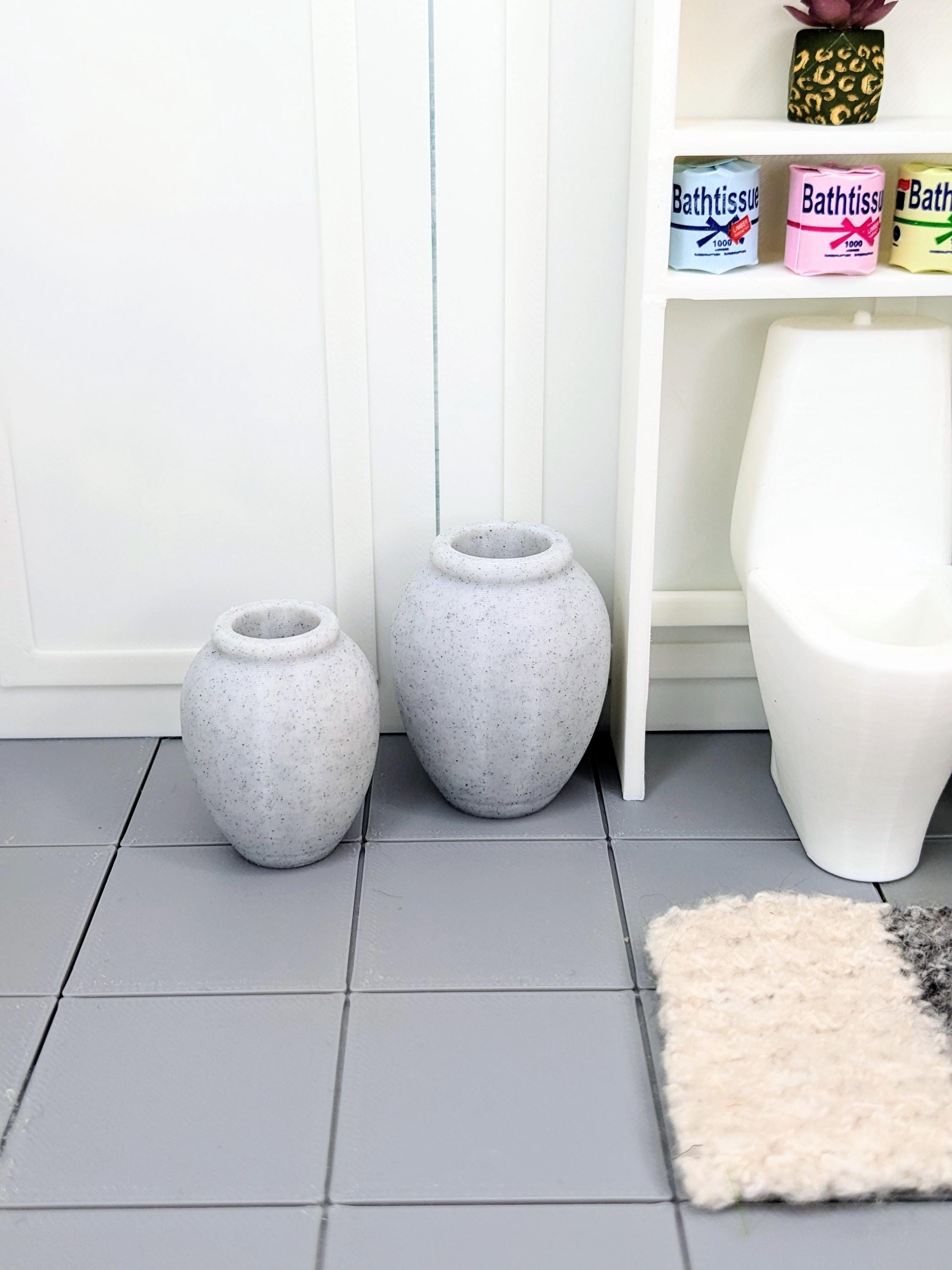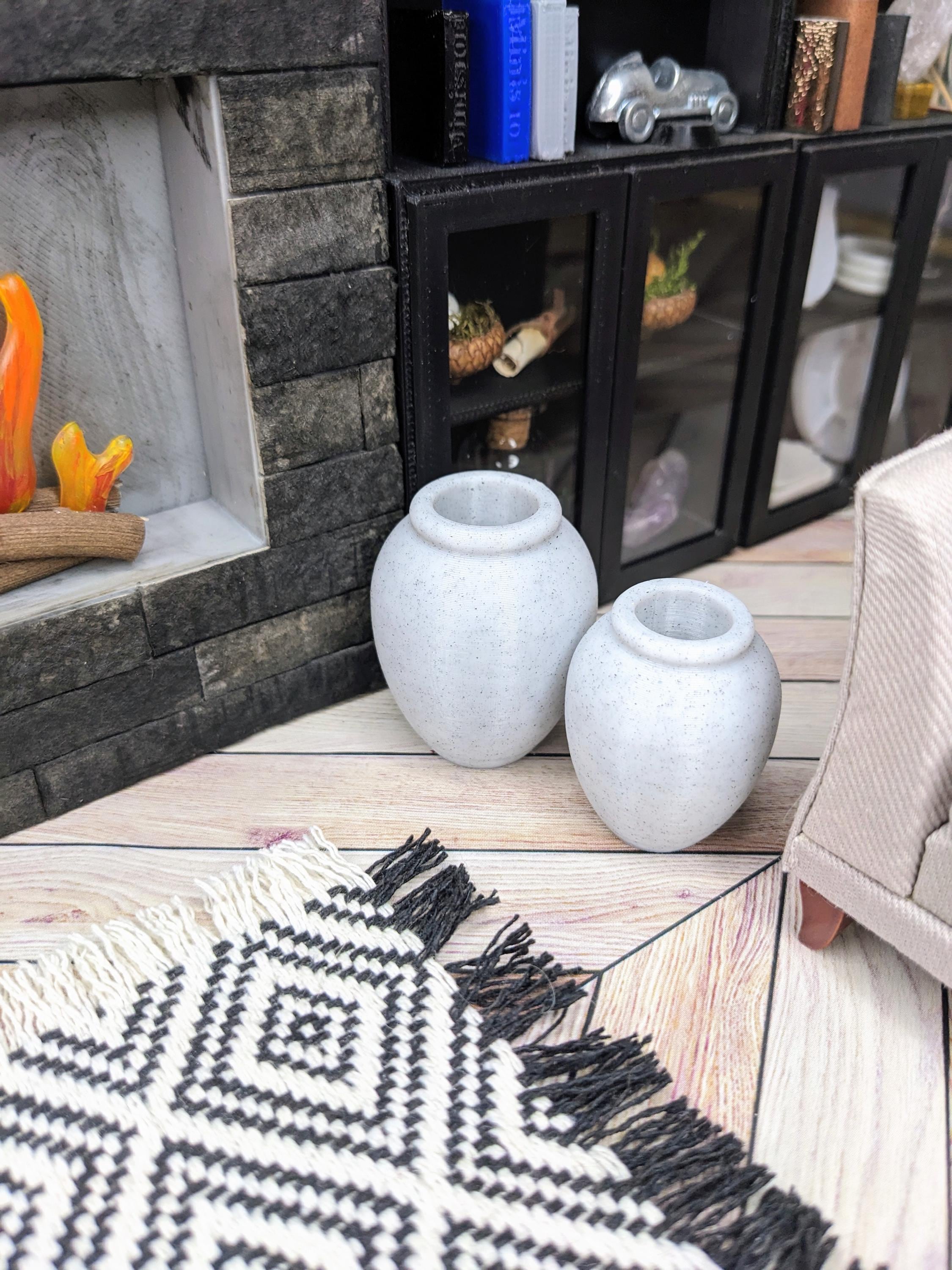 *Original Design!* A 2-piece set of curvy floor vases in 1:12 scale, but could absolutely work for 1:6 as well! This set includes 2 marble colored floor vases with a hollow interior for filling with twigs or flowers. Perfect for decorating around your fireplace, entryway, or in your bathroom. These vases are 3D printed with high quality PLA plastic in marble white color. Greenery and other accessories NOT included.