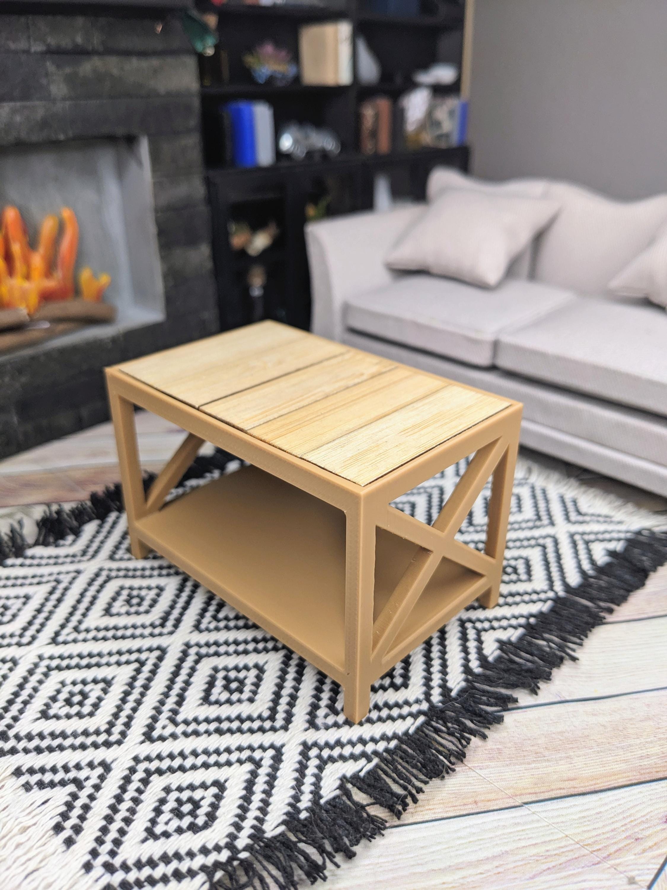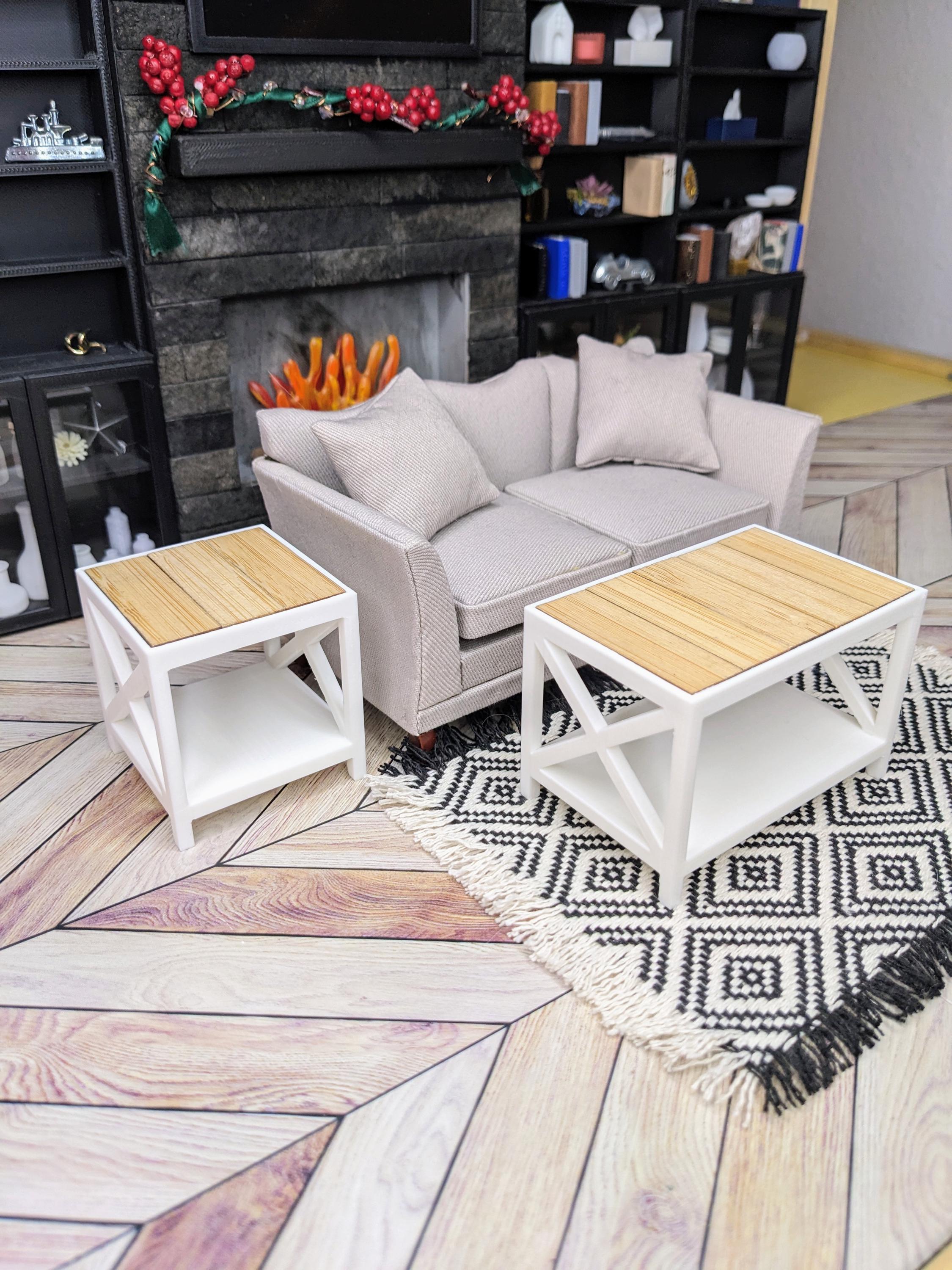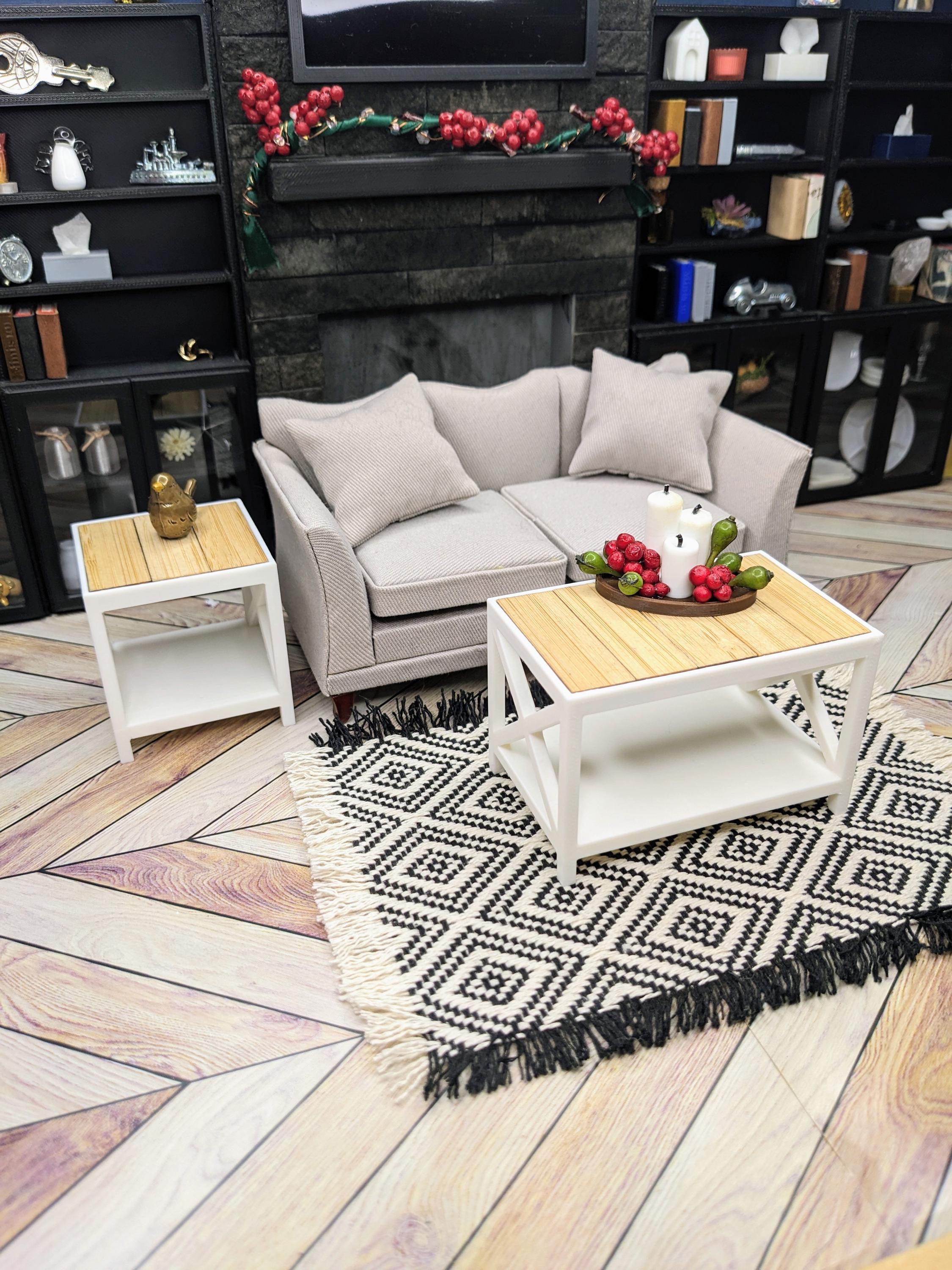 *Original Design!* Farmhouse style bench and side tables in 1:12 scale! The bench can be used as an entryway bench or a coffee table, and the side tables would be perfect in a living room or even as nightstands! These items are 3D printed with high quality PLA plastic with wooden tile inserts on top. Use as a coffee table, accent table, or use as a mudroom bench for your purse and shoes! Please refer to set types for pricing. Other decor not included.