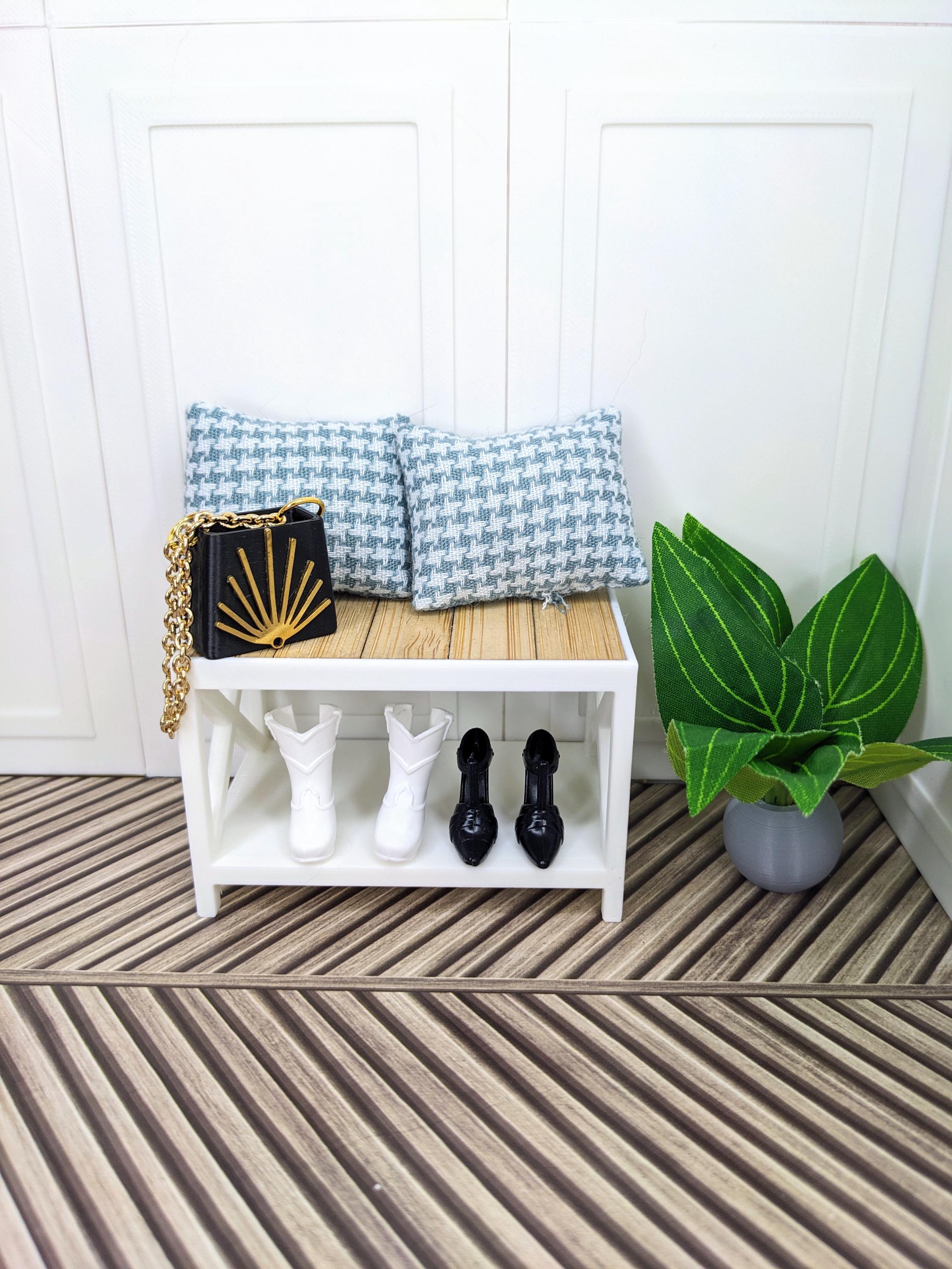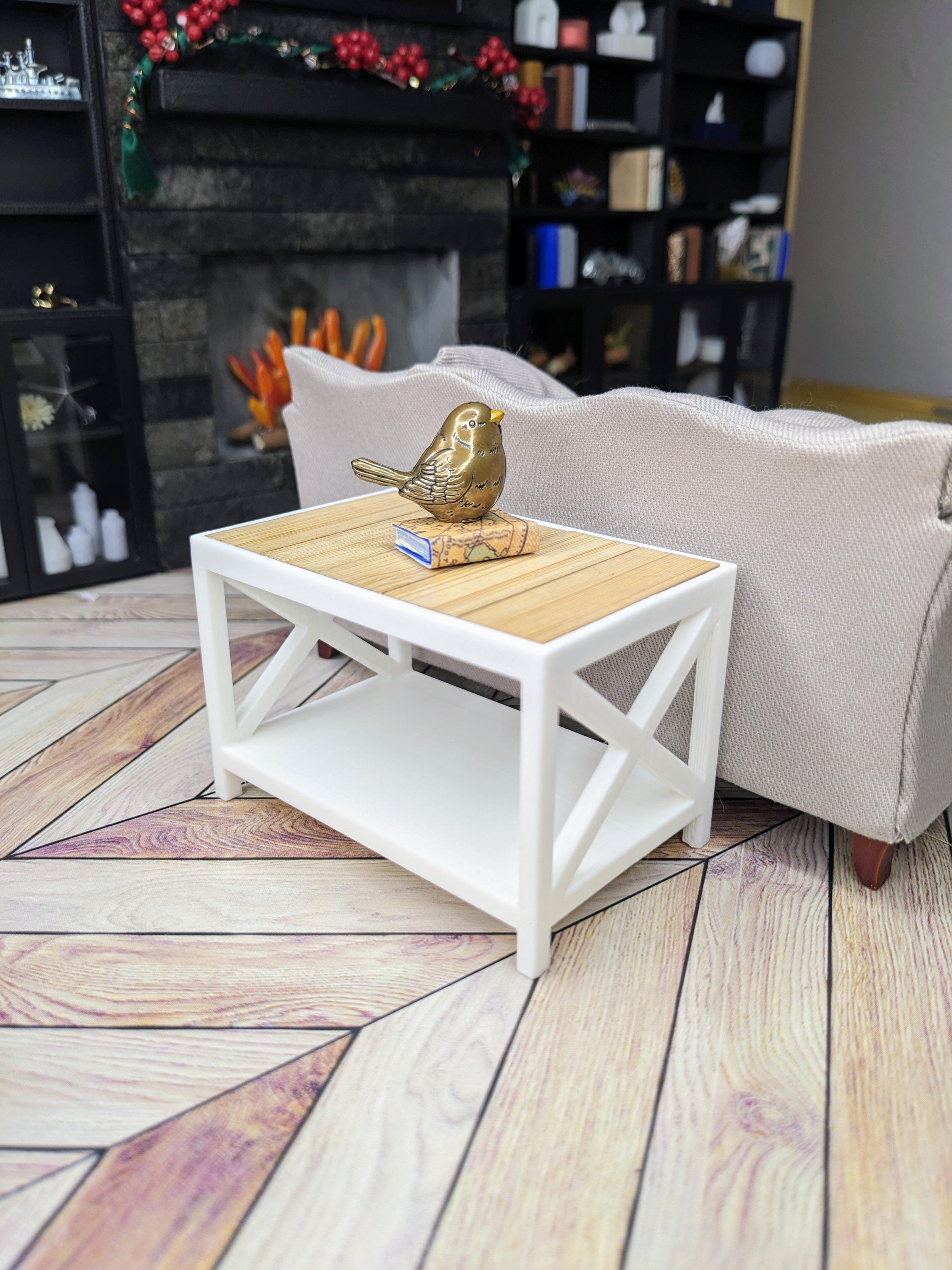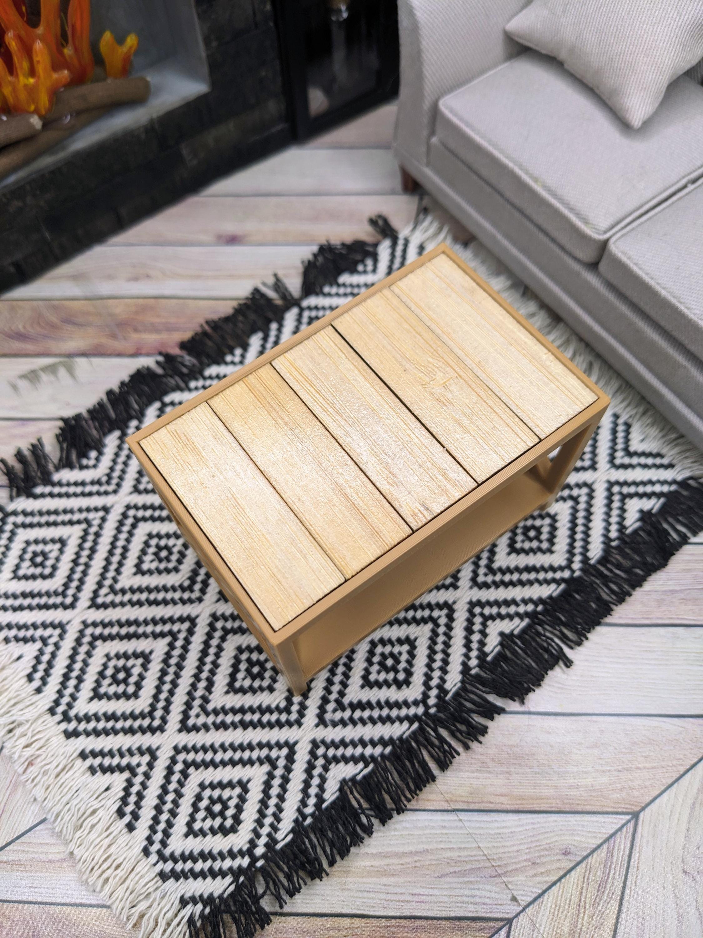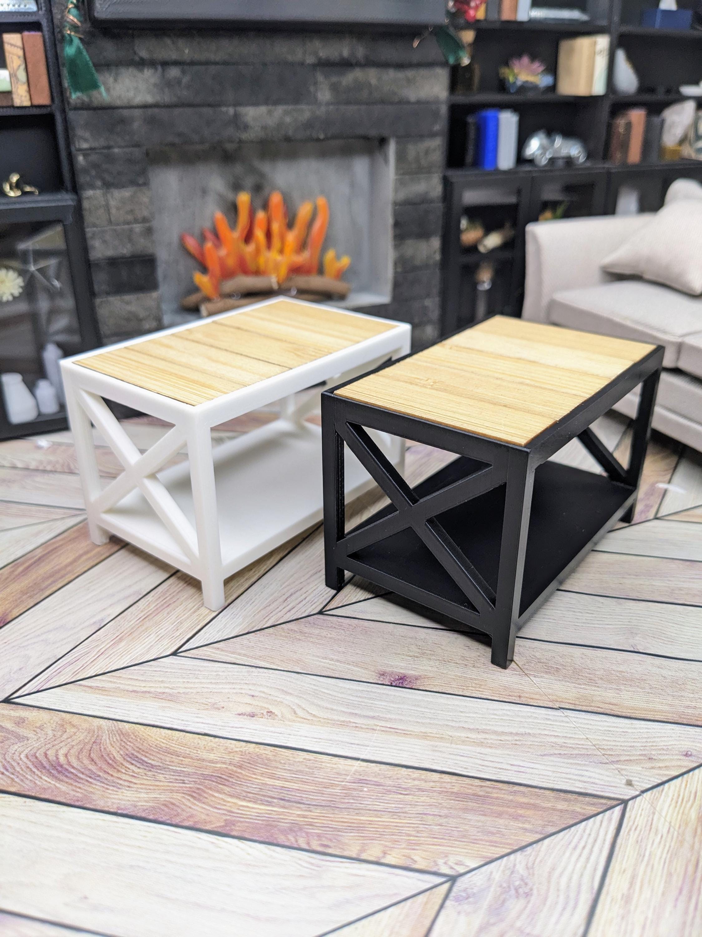 *Original Design!* Farmhouse style bench and side tables in 1:12 scale! The bench can be used as an entryway bench or a coffee table, and the side tables would be perfect in a living room or even as nightstands! These items are 3D printed with high quality PLA plastic with wooden tile inserts on top. Use as a coffee table, accent table, or use as a mudroom bench for your purse and shoes! Please refer to set types for pricing. Other decor not included.