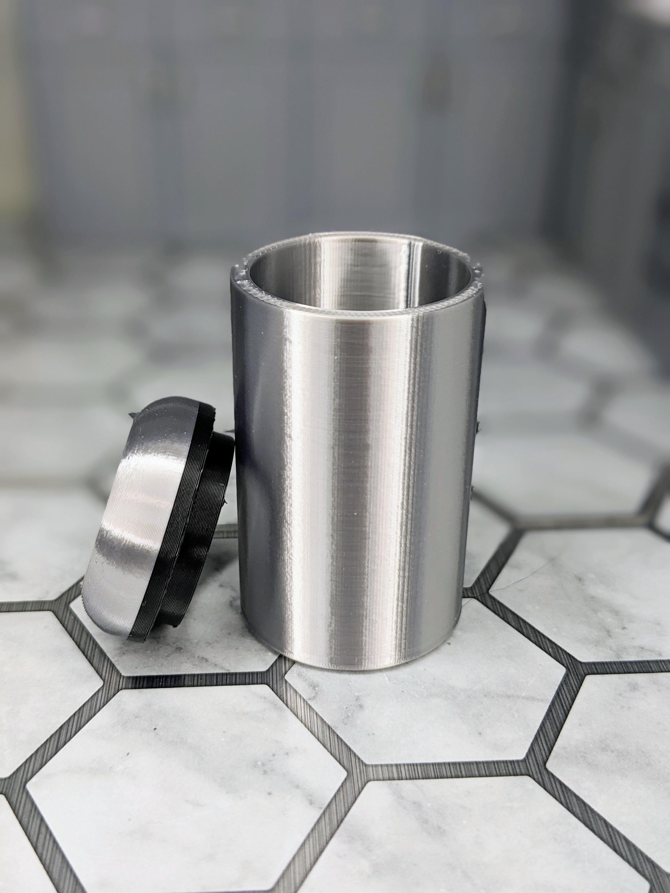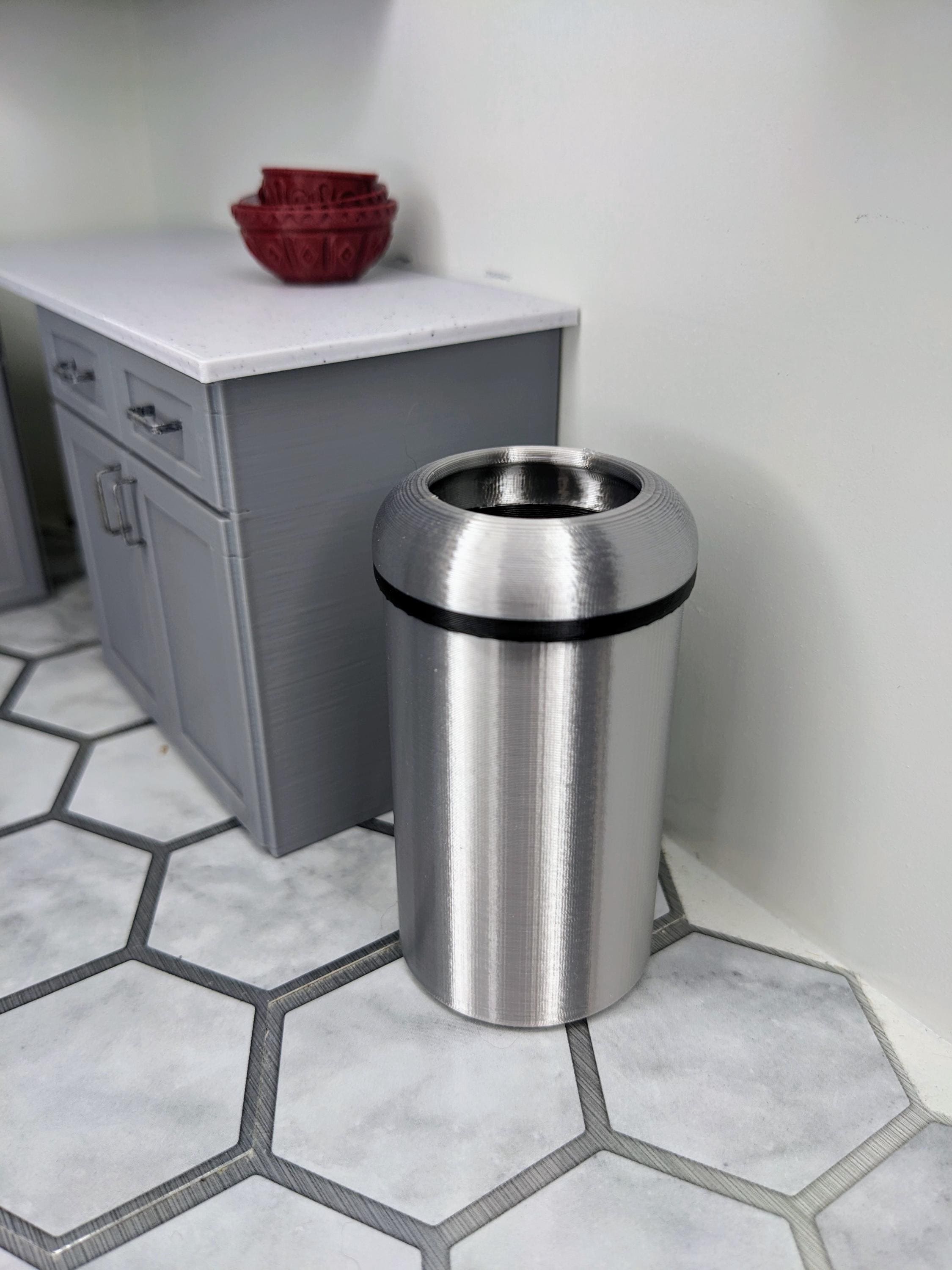 *Original Design!* A trash can with a removable lid in 1:!2 scale! This trash can is 3D printed with high quality PLA plastic in a bright metallic grey with a black accent on the lid. The lid is removable, so you can insert your own trash bag (not included) and display as you'd like!