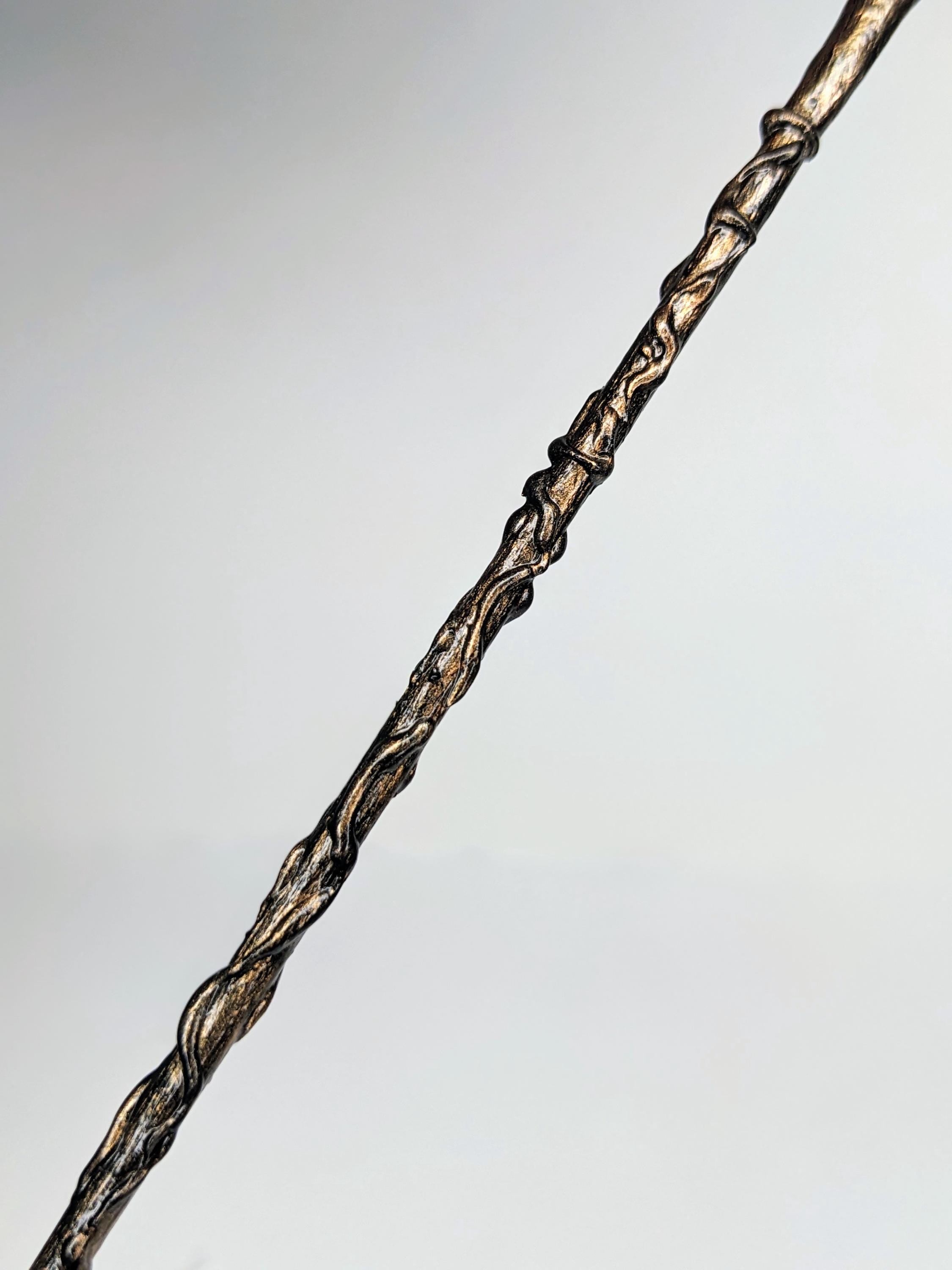 -a hand-painted black handle that is dry-brushed with bronze