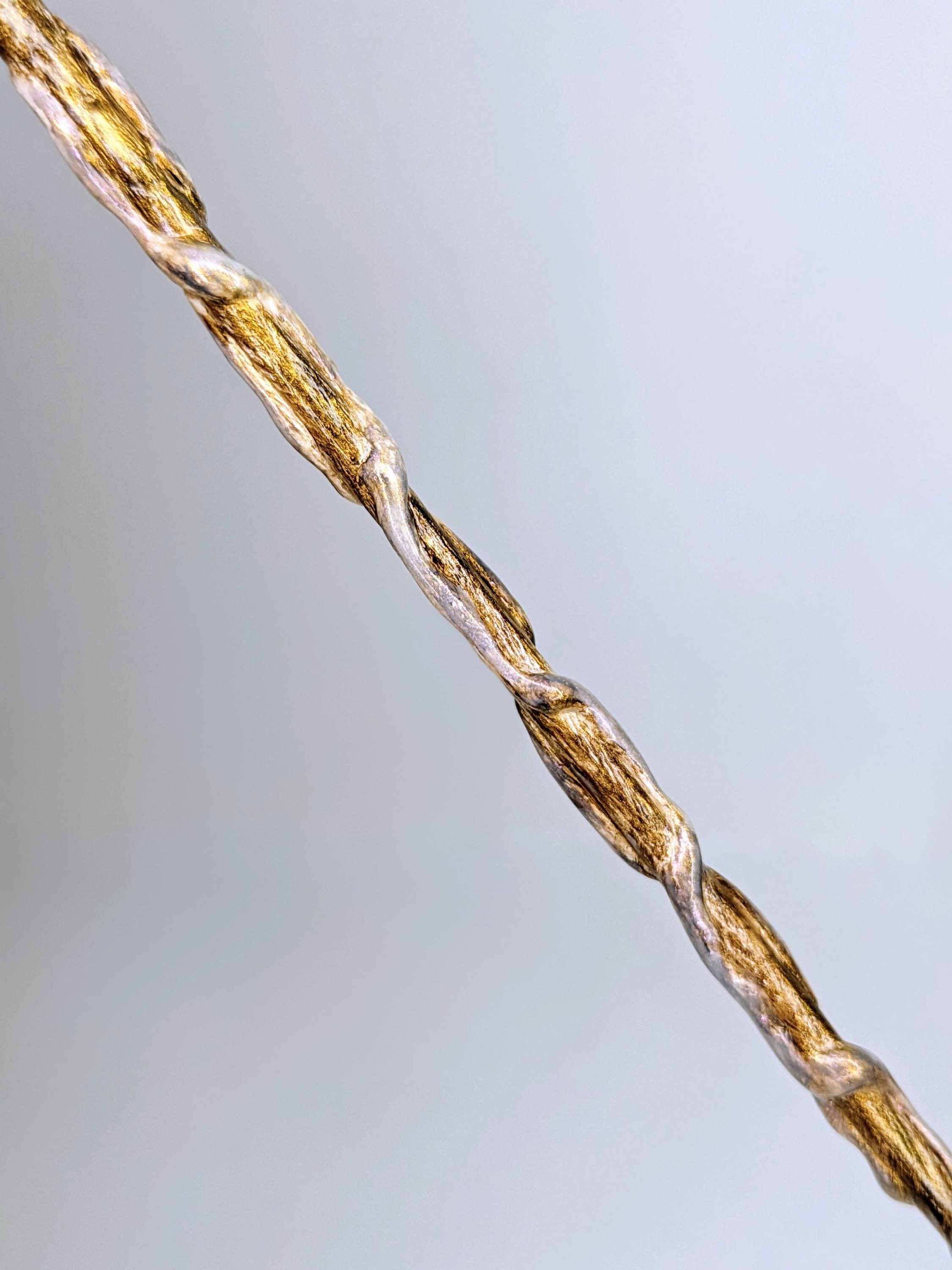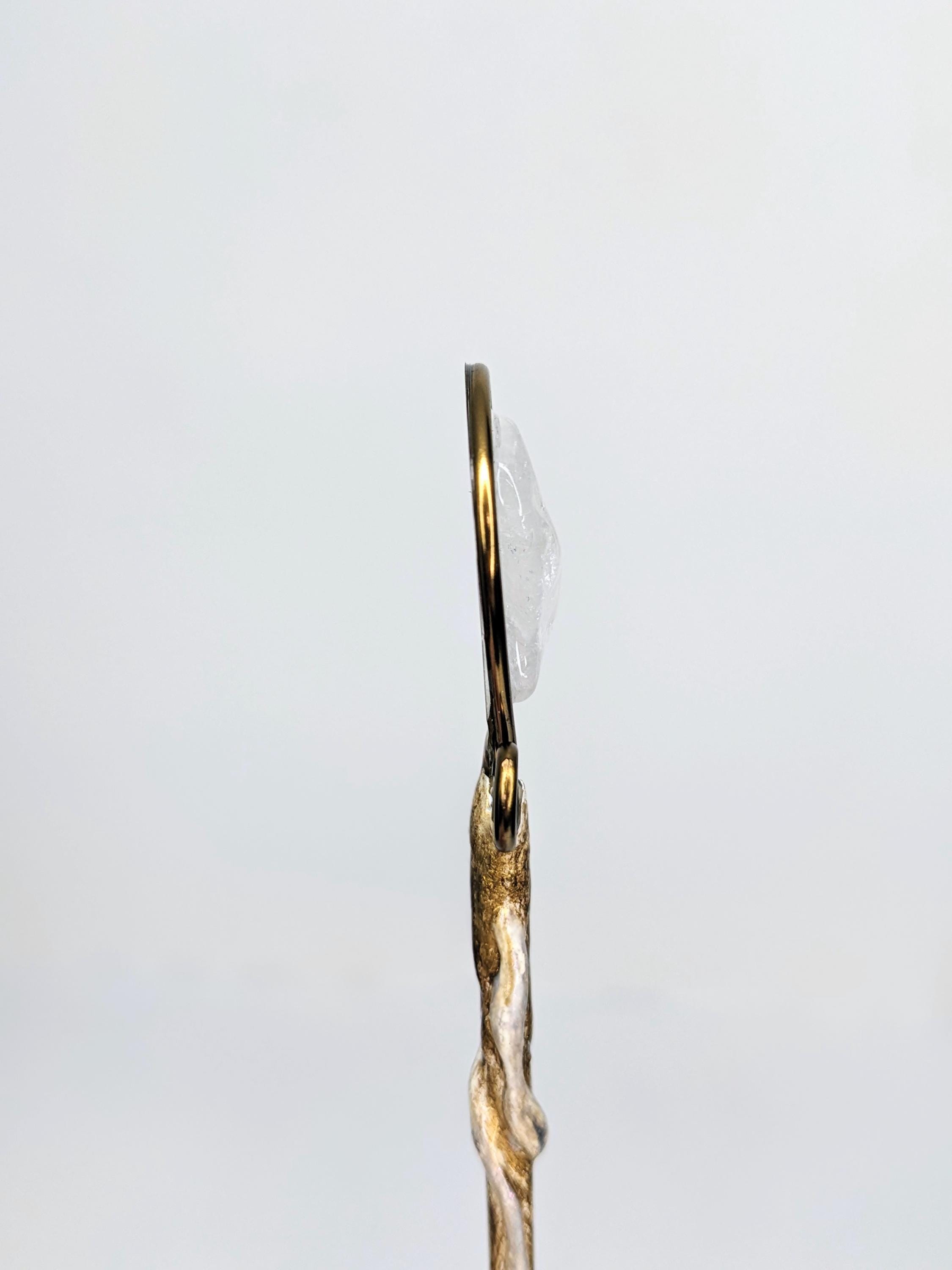 -a polished white stone set in clear resin "floating" in a bronze wire halo
