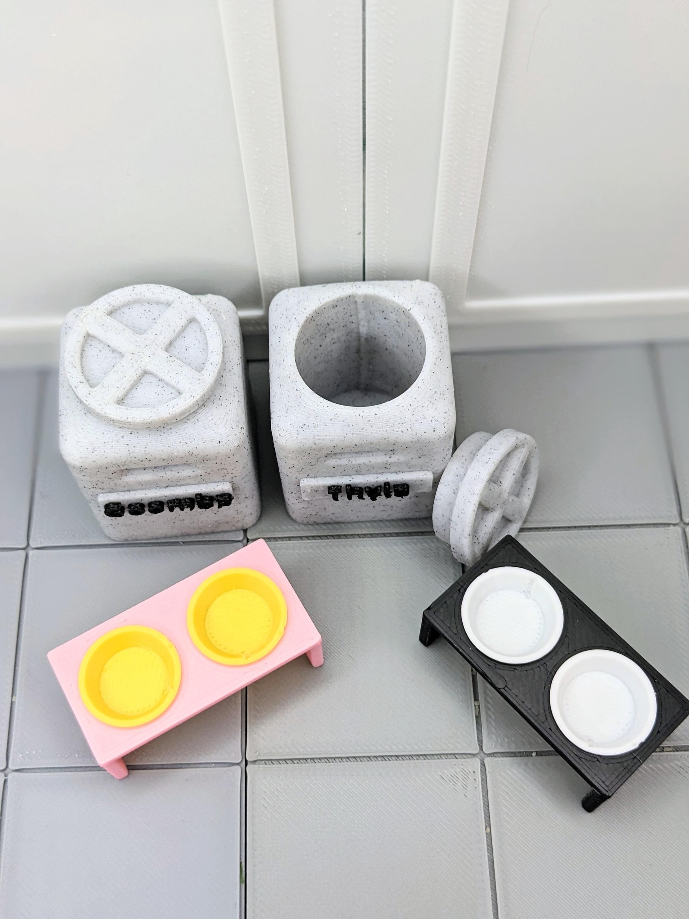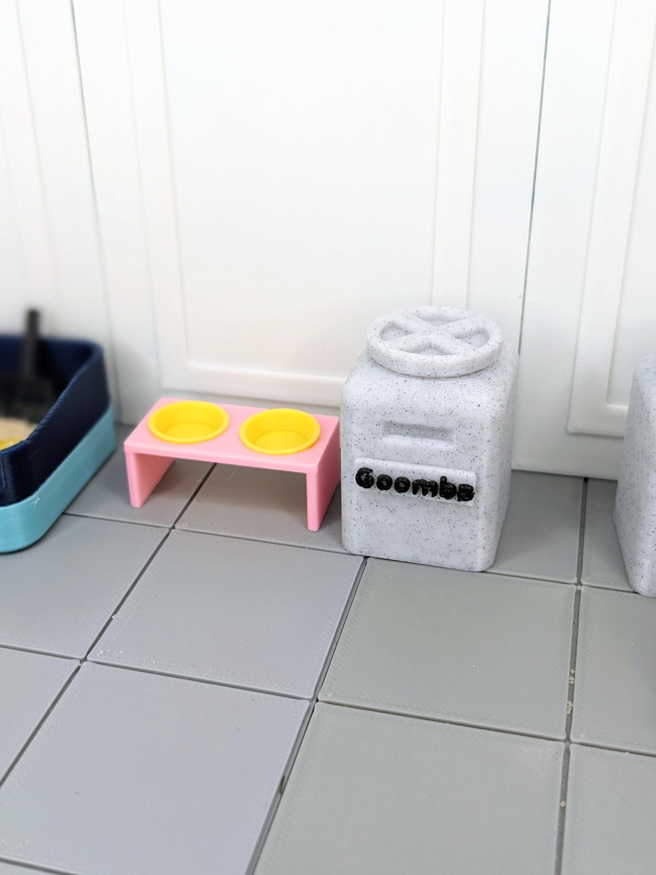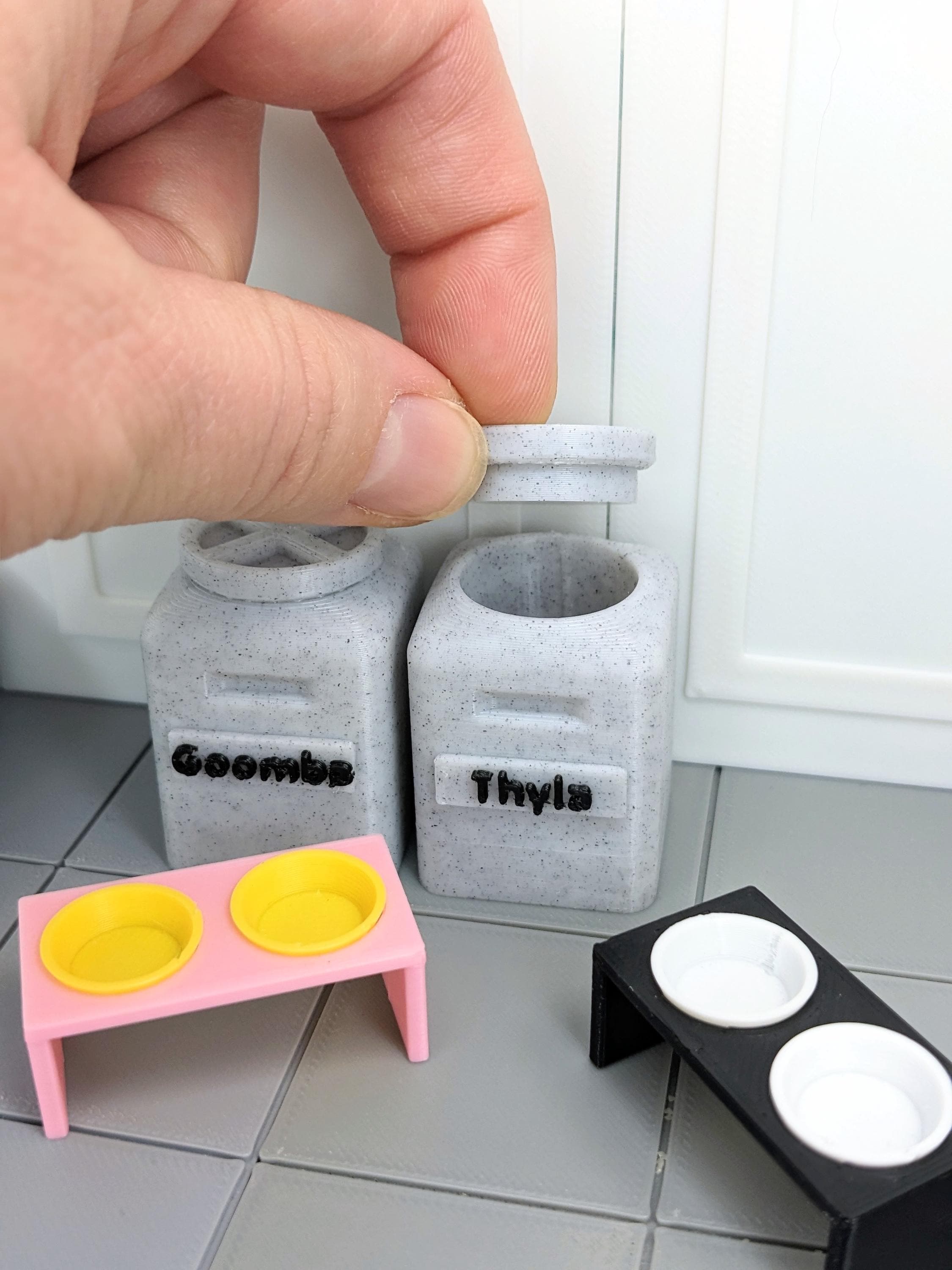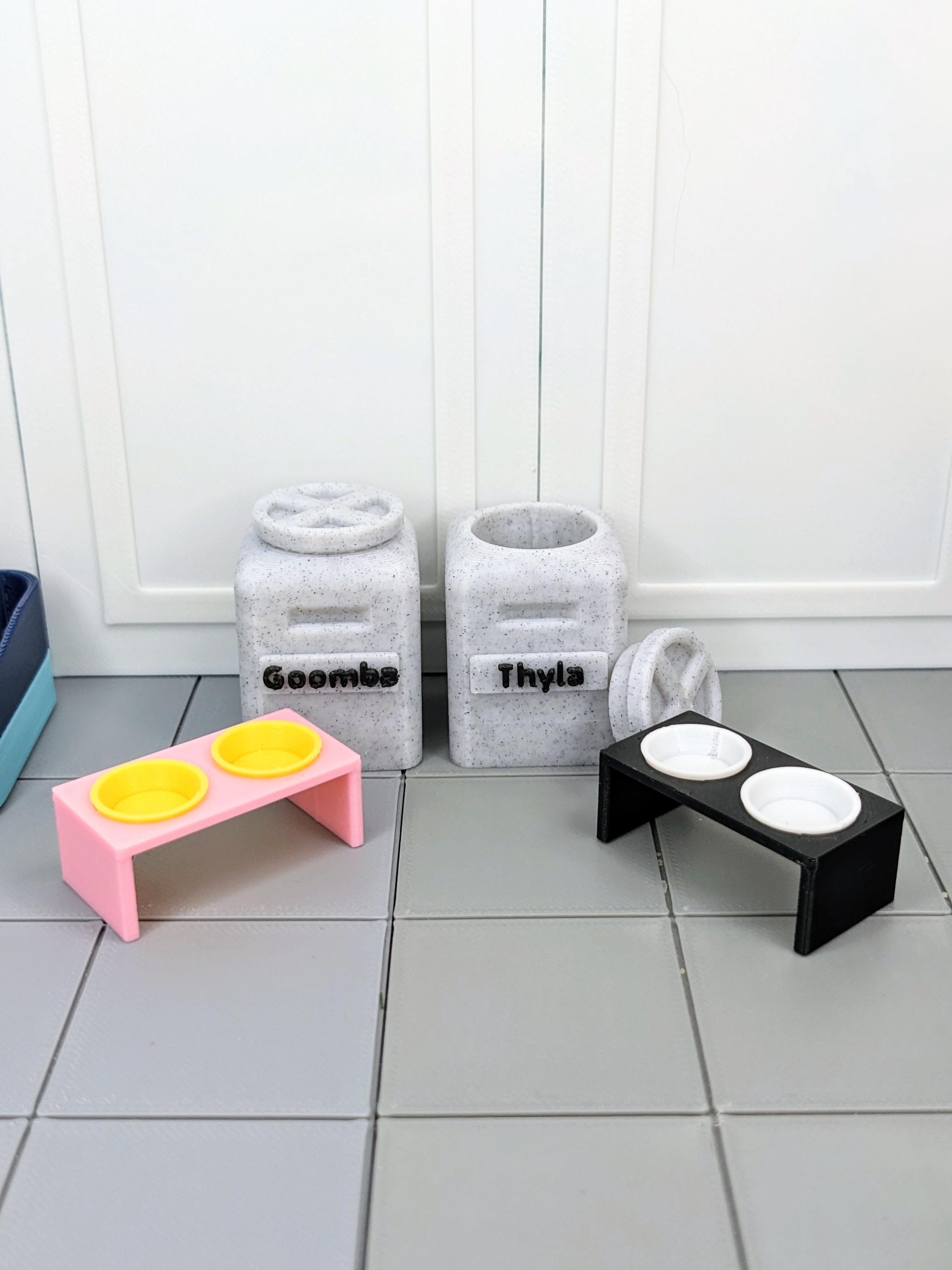 *Original Design!* A pet food storage container in 1:12 scale! This item is 3D printed with high quality PLA plastic, featuring a removable lid and optional name personalization!