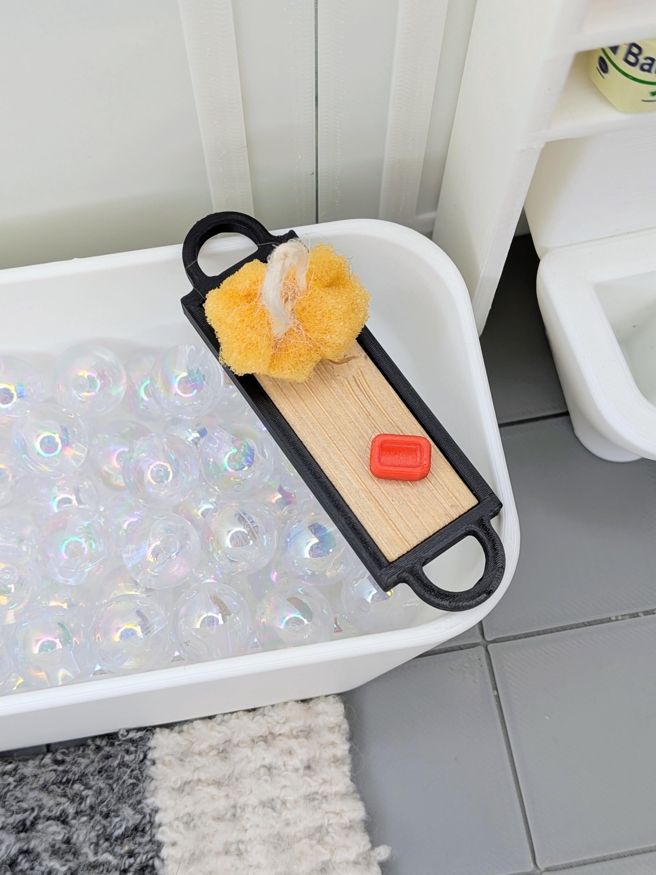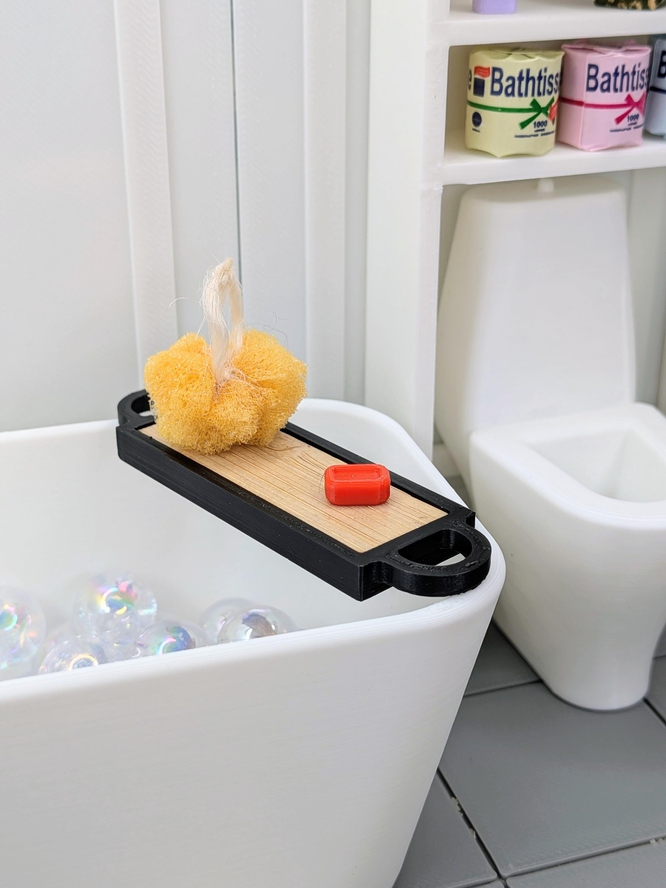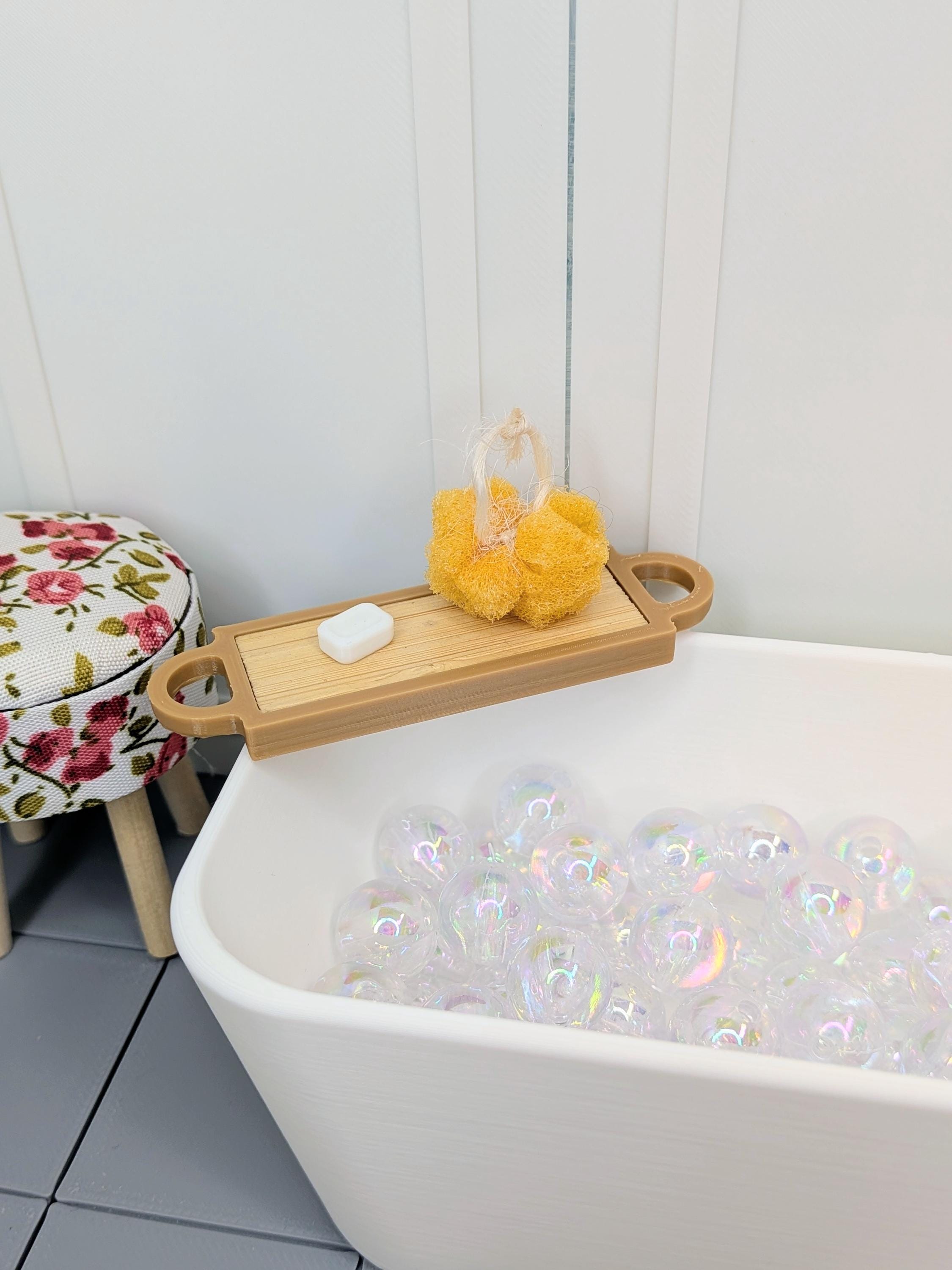 *Original Design!* A bathtub caddy and soap bar in 1:12 scale! This caddy has been designed to fit different sized tubs from 2"-2.5" width. No notches underneath, so you can place the caddy wherever you'd like on your tub!