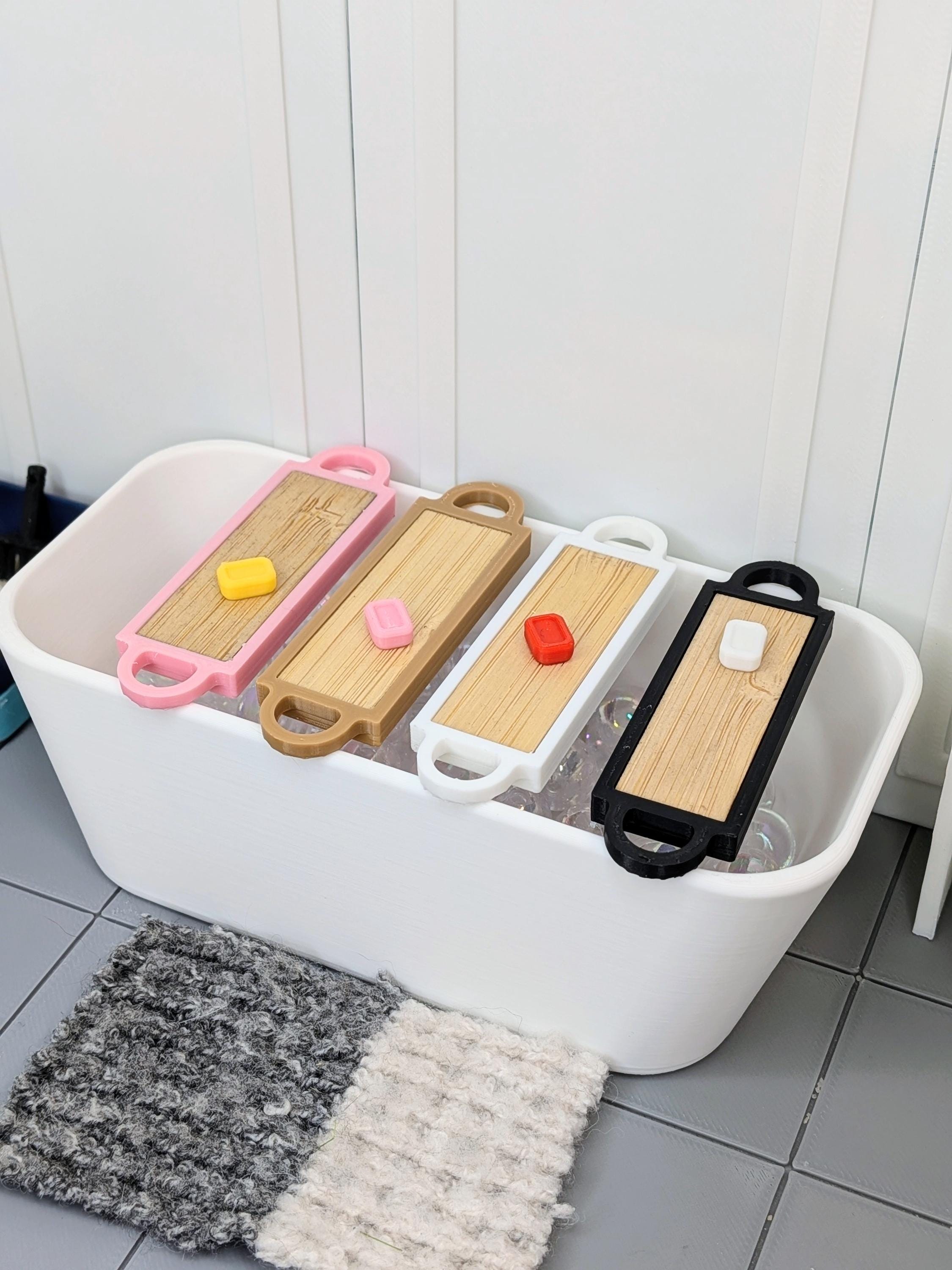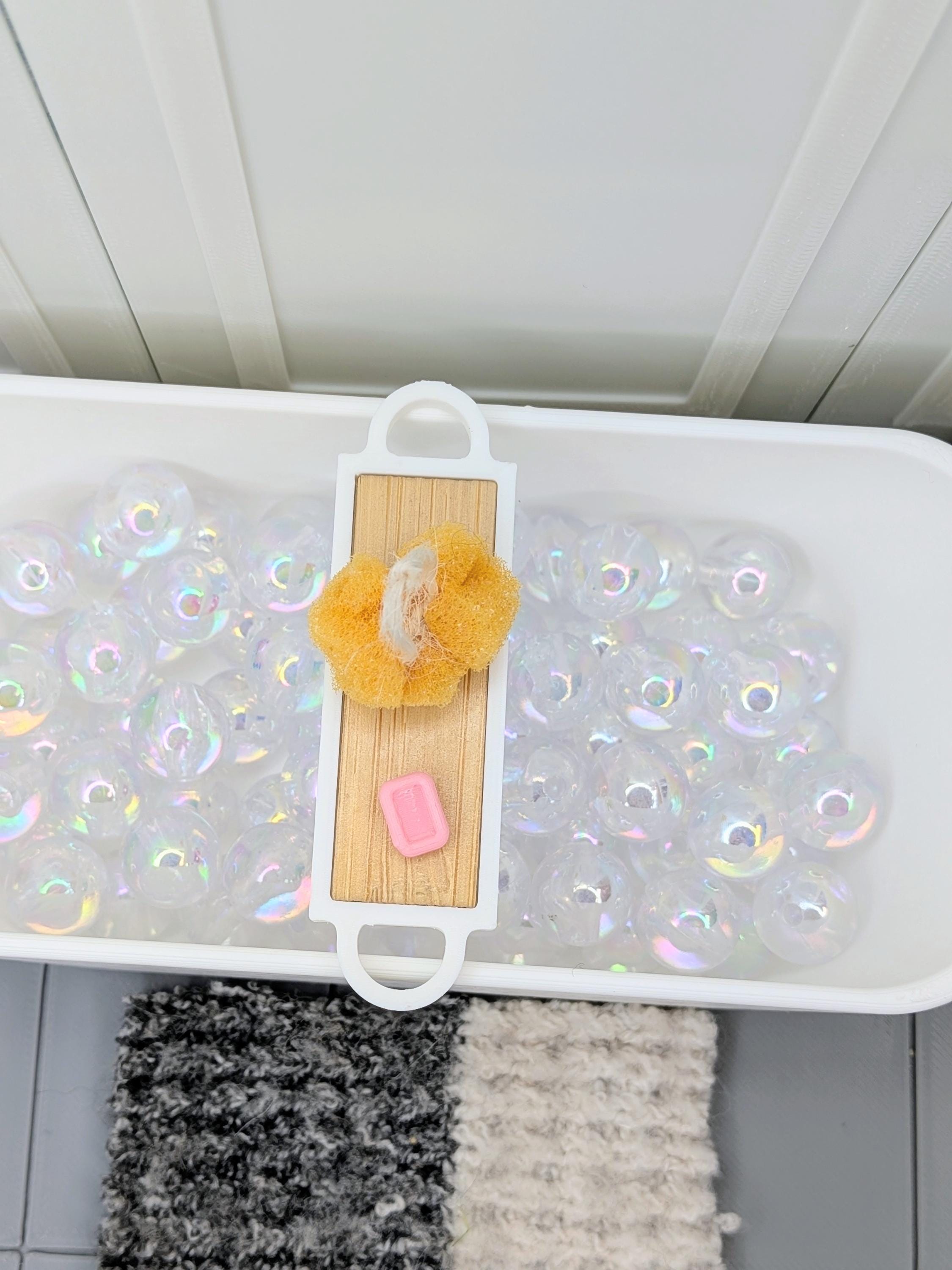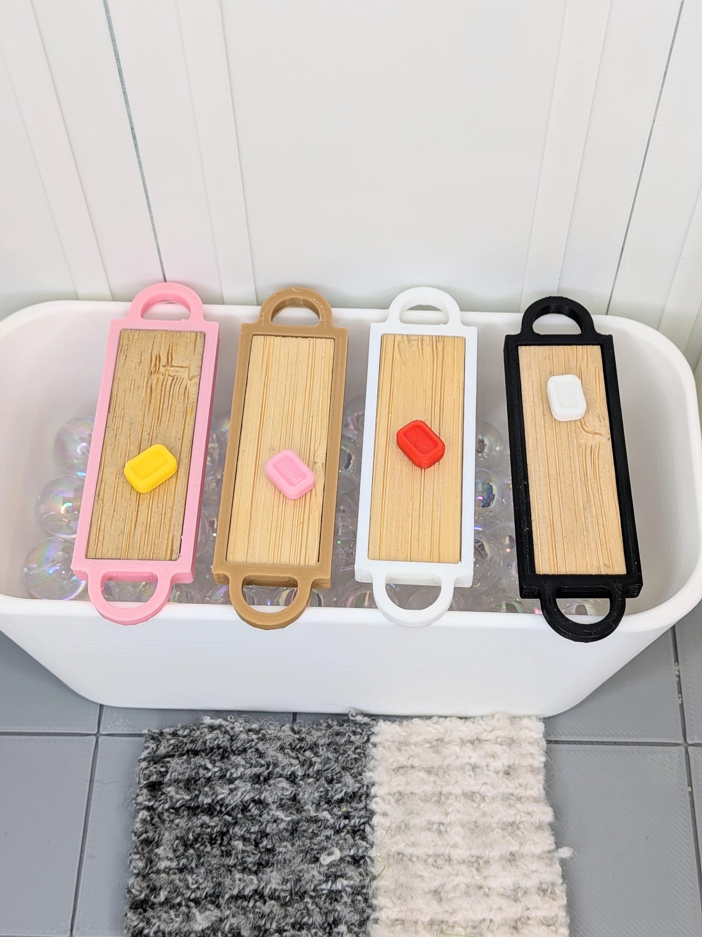 *Original Design!* A bathtub caddy and soap bar in 1:12 scale! This caddy has been designed to fit different sized tubs from 2"-2.5" width. No notches underneath, so you can place the caddy wherever you'd like on your tub!